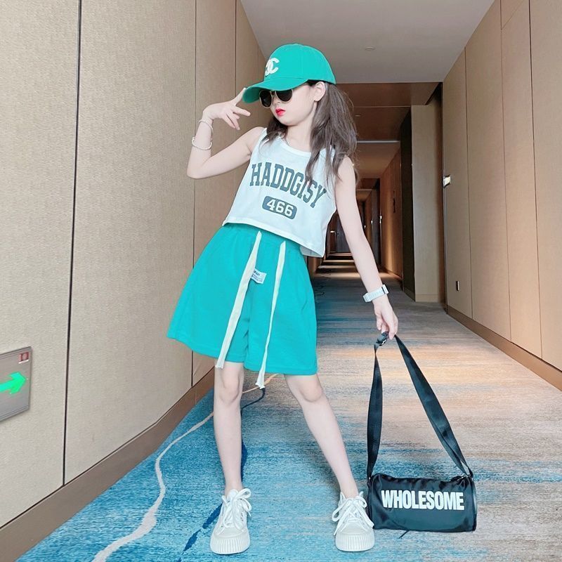 여아 여름 정장 2025 새로운 한국 스타일 외국 스타일 중대형 어린이 여름 유행 인터넷 연예인 조끼 반바지 투피스 세트