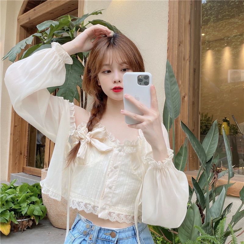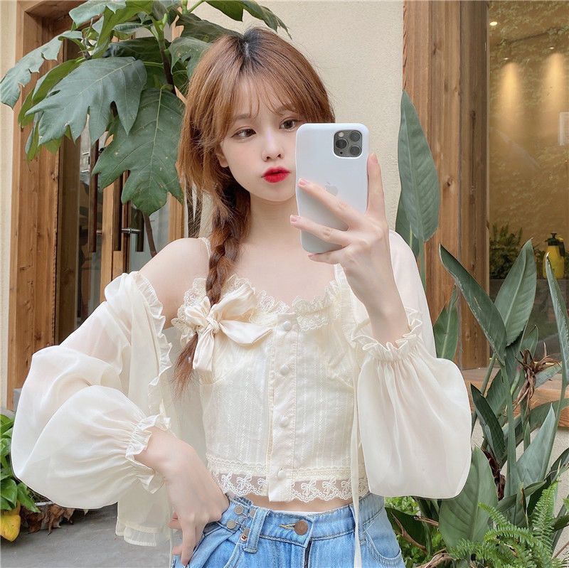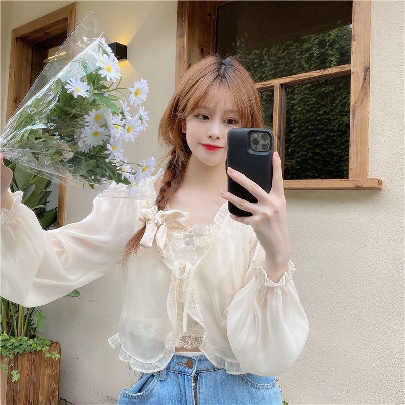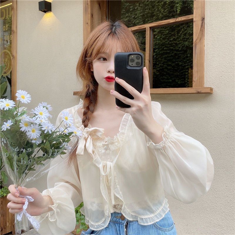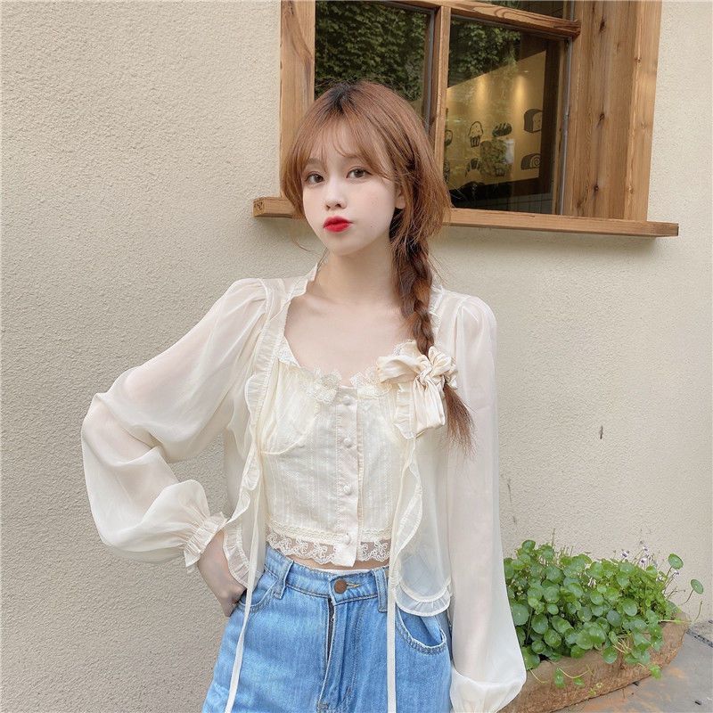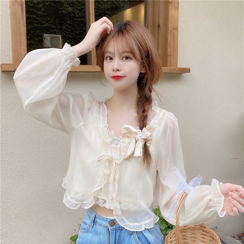 쉬폰 태양 보호 의류 여성용 아우터웨어 목도리 여름 카디건 귀여운 짧은 활 레이스 느슨한 긴 소매 올 매치스토어 가기