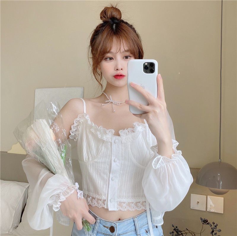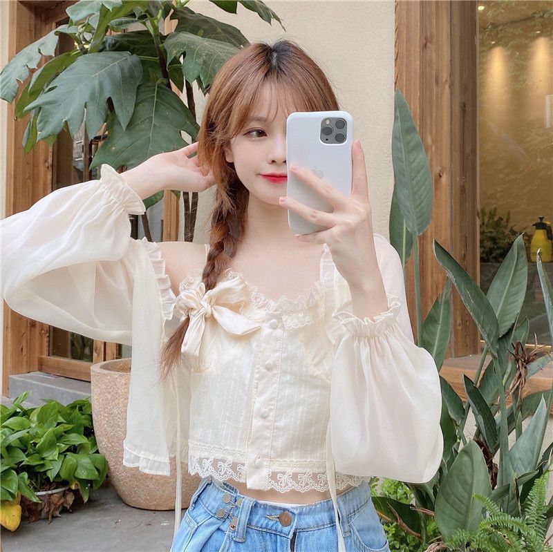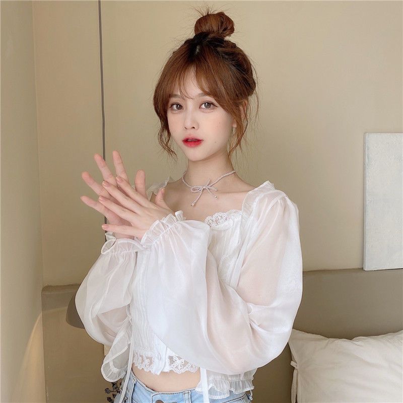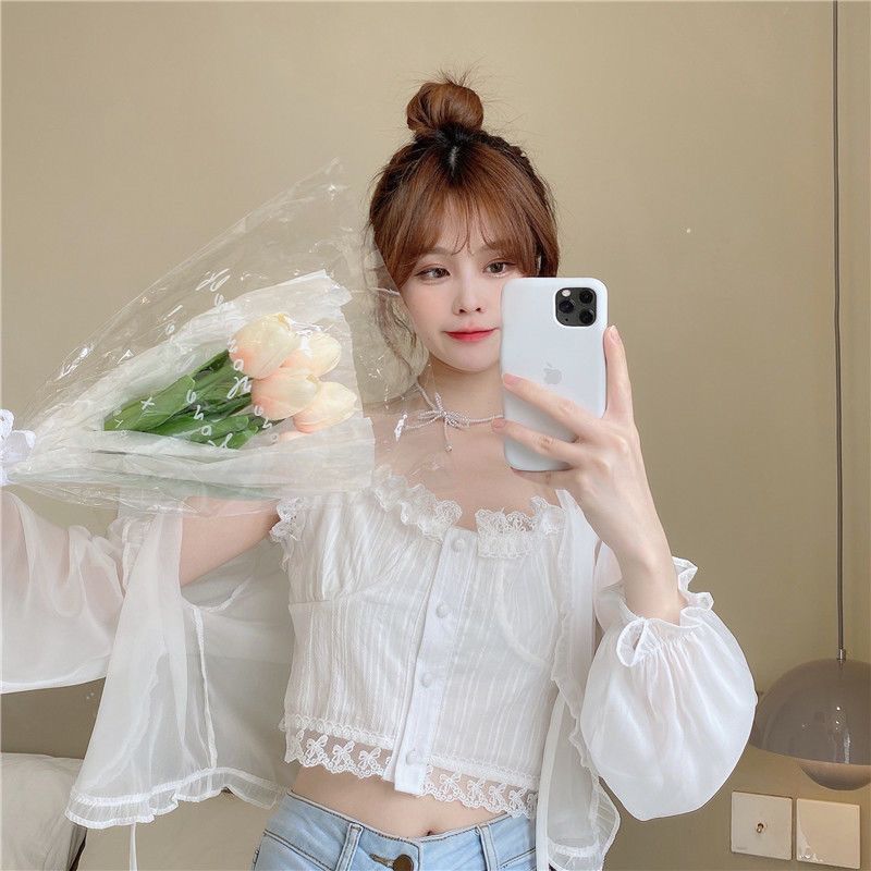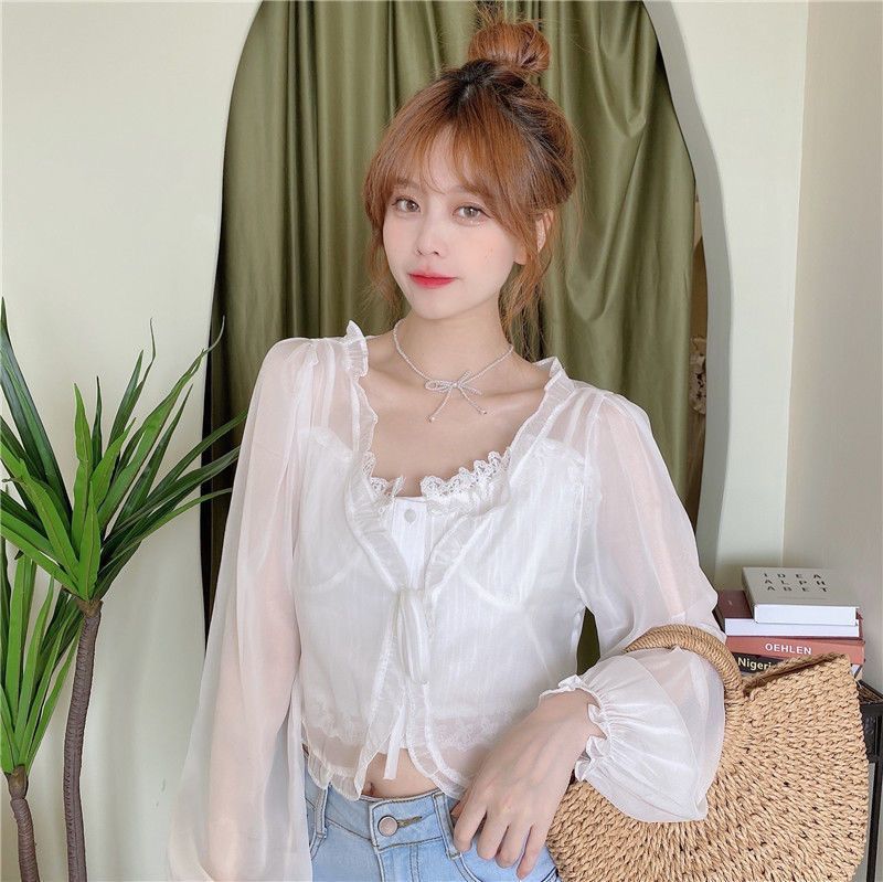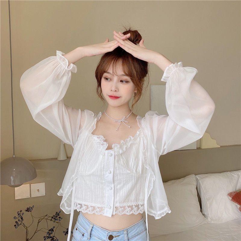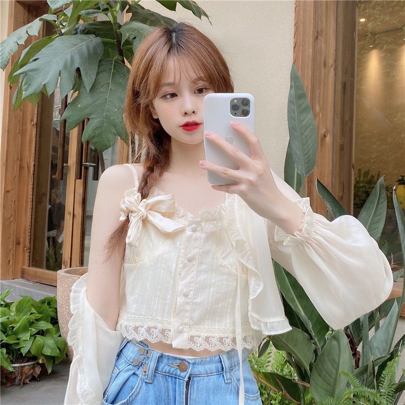 쉬폰 태양 보호 의류 여성용 아우터웨어 목도리 여름 카디건 귀여운 짧은 활 레이스 느슨한 긴 소매 올 매치스토어 가기