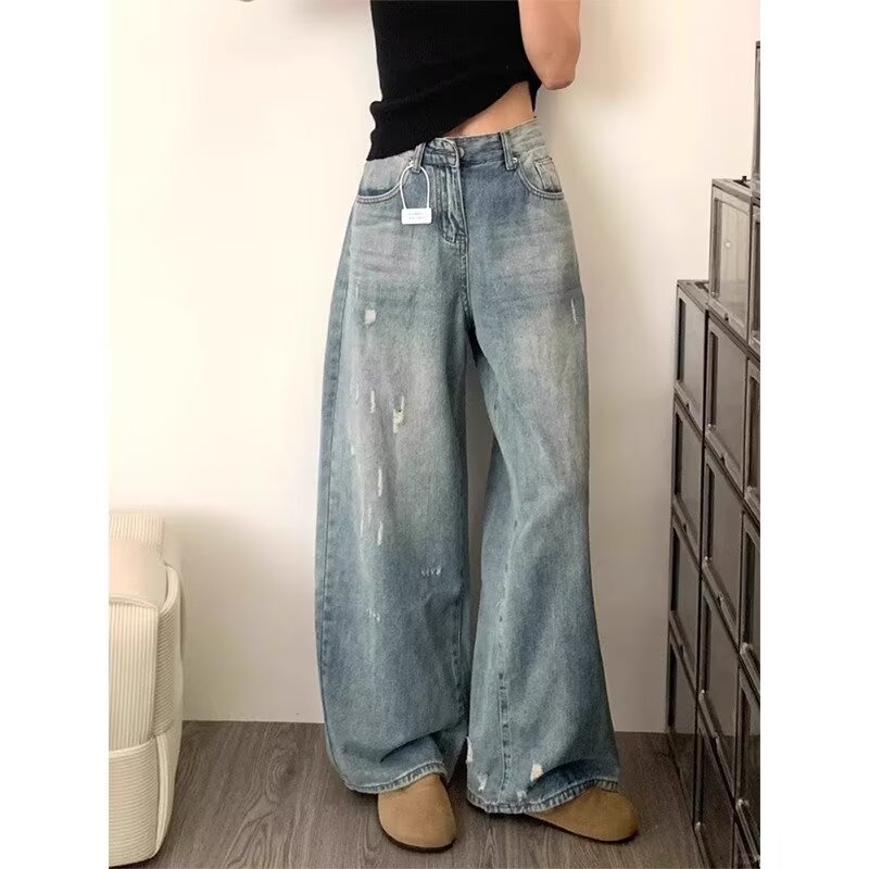 세탁 및 연마 된 디자인 와이드 레그 청바지 여성의 2025 년 새로운 높은 허리 와이드 레그 느슨한 바지 여름스토어 가기