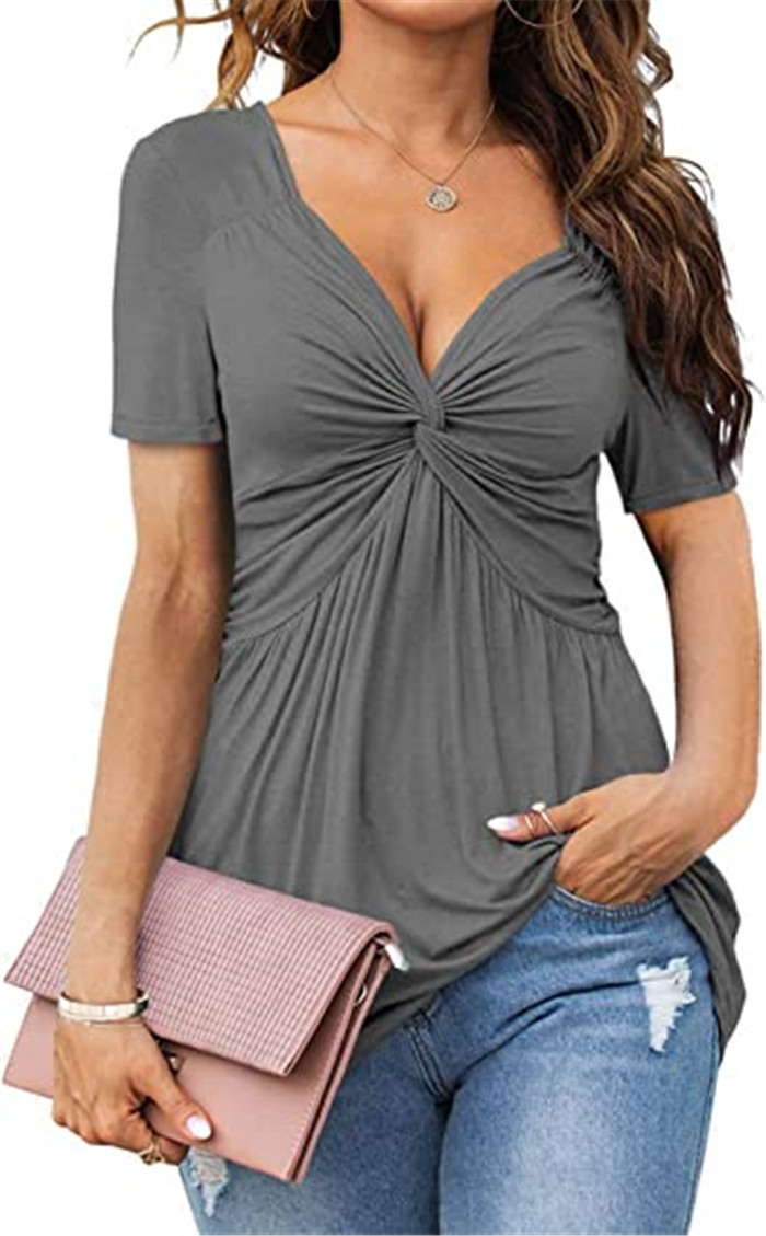 2025 유럽과 미국의 새로운 여성 V 넥 프론트 싱크 셔츠 짧은 소매 우아한 캐주얼 티셔츠 솔리드 컬러 풀오버 탑