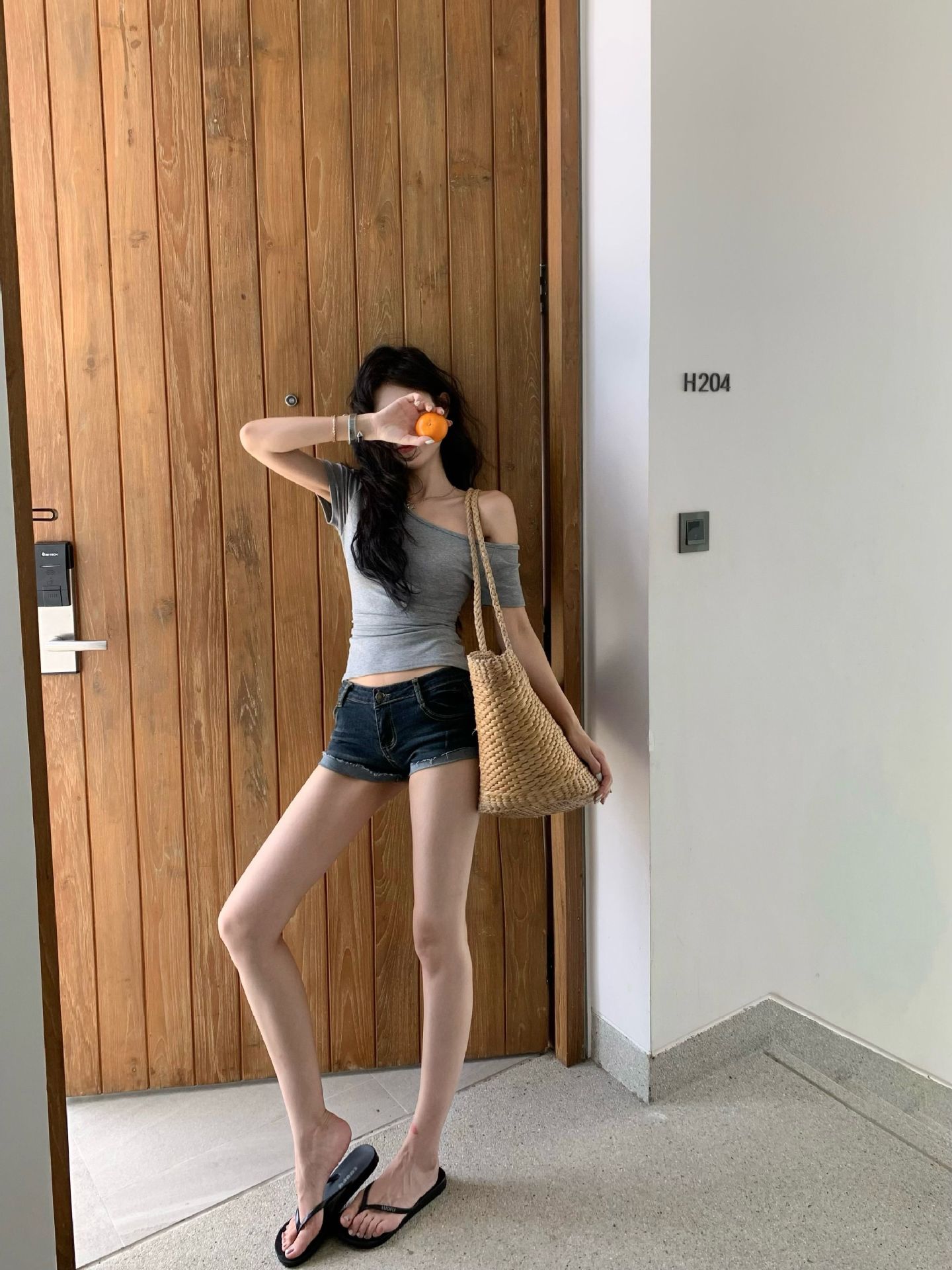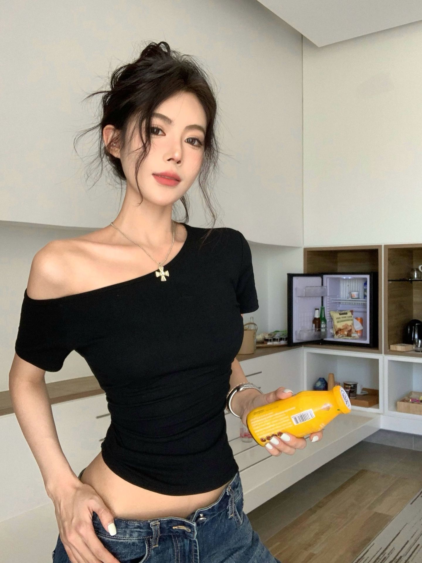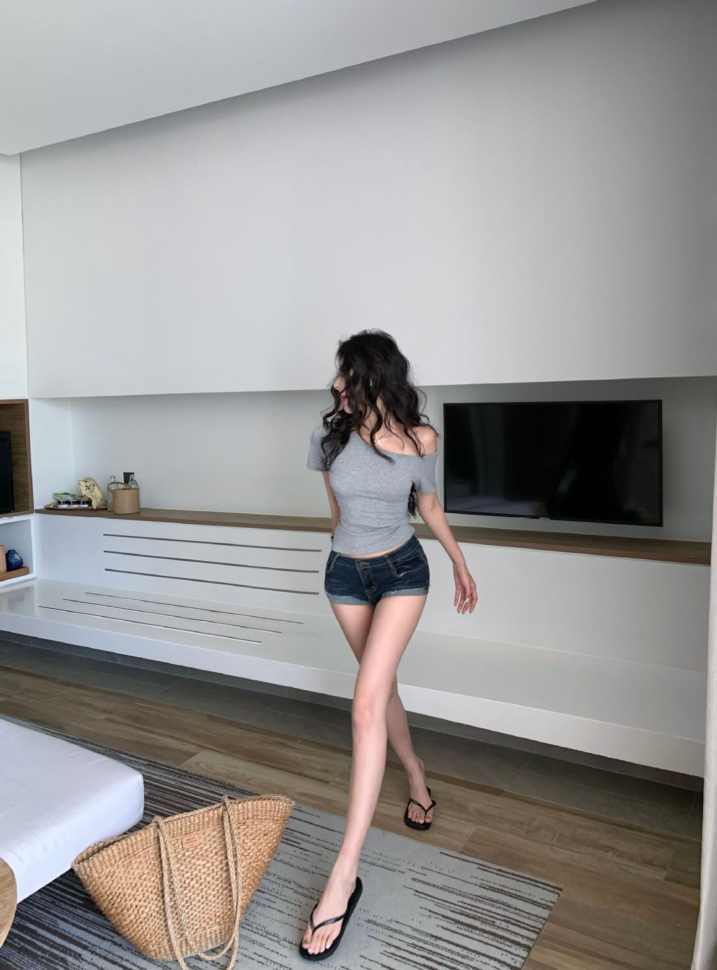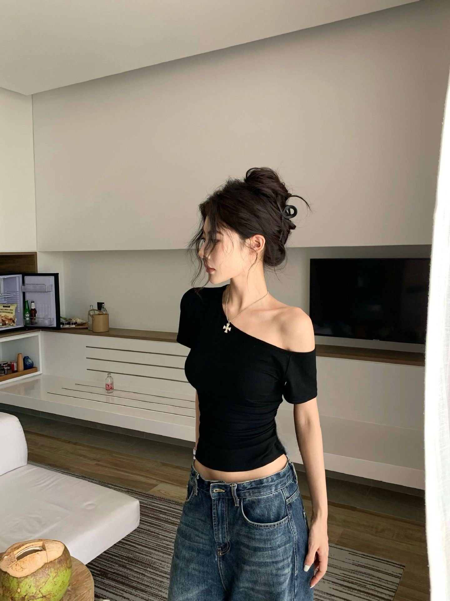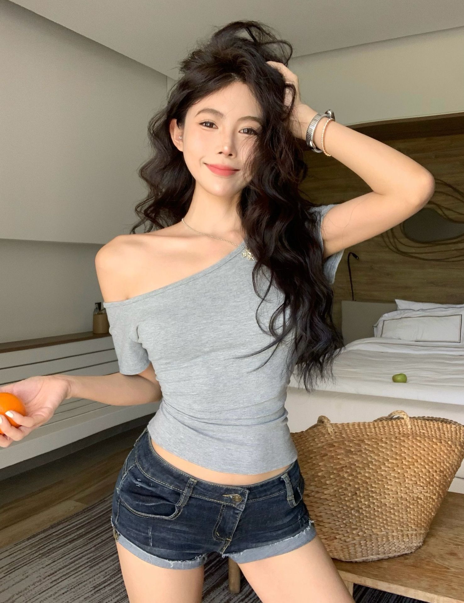 회색 Slant Collar Shoulder 반팔 티셔츠 여성용 여름 슬림 핏 슬리밍 내부 디자인 핫 소녀 쇼트베이스 탑스토어 가기