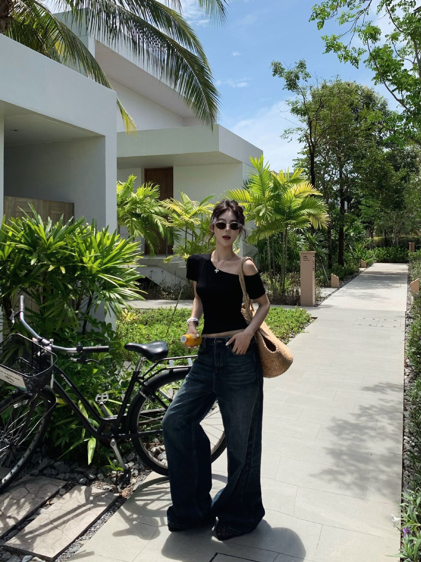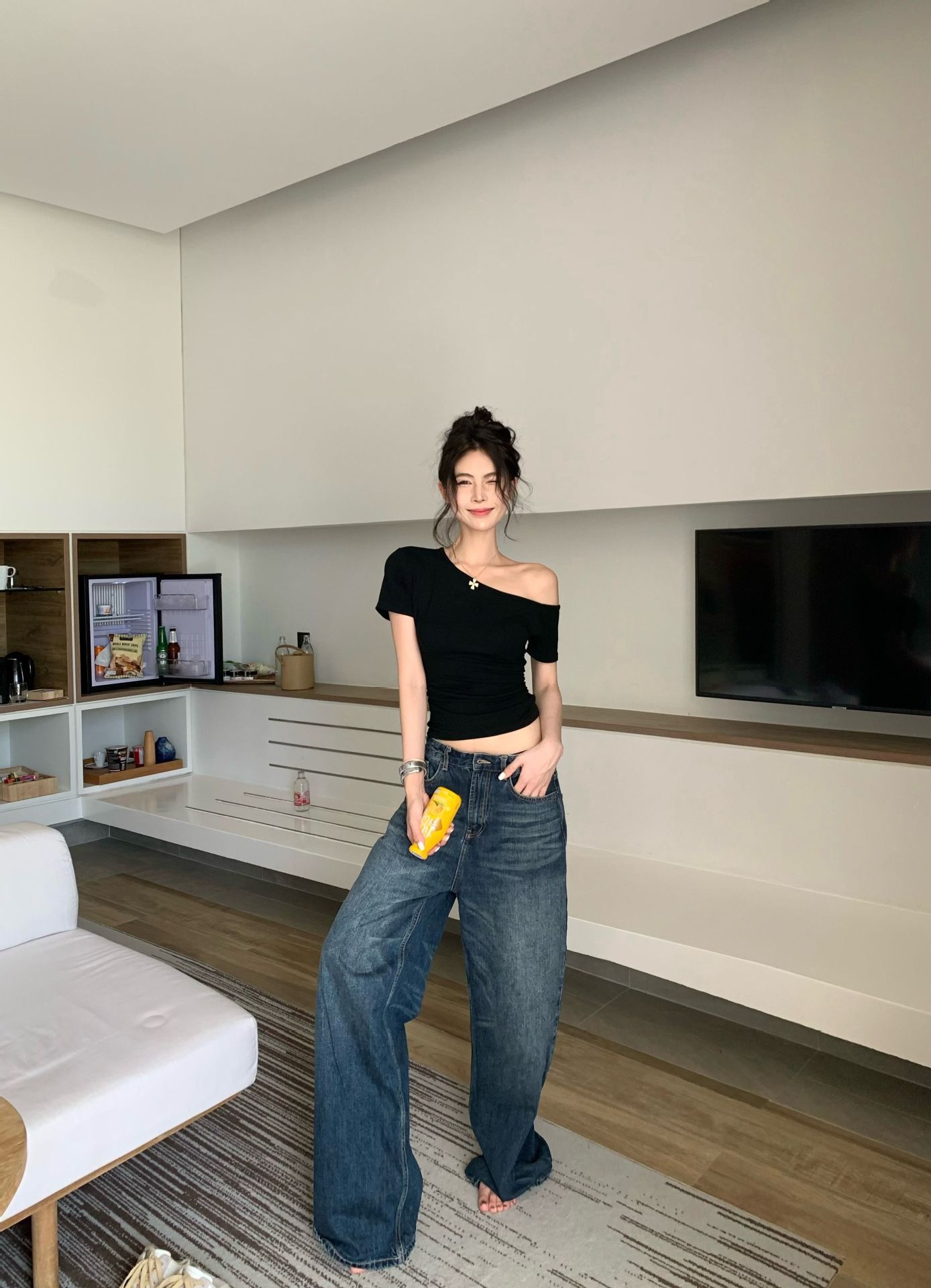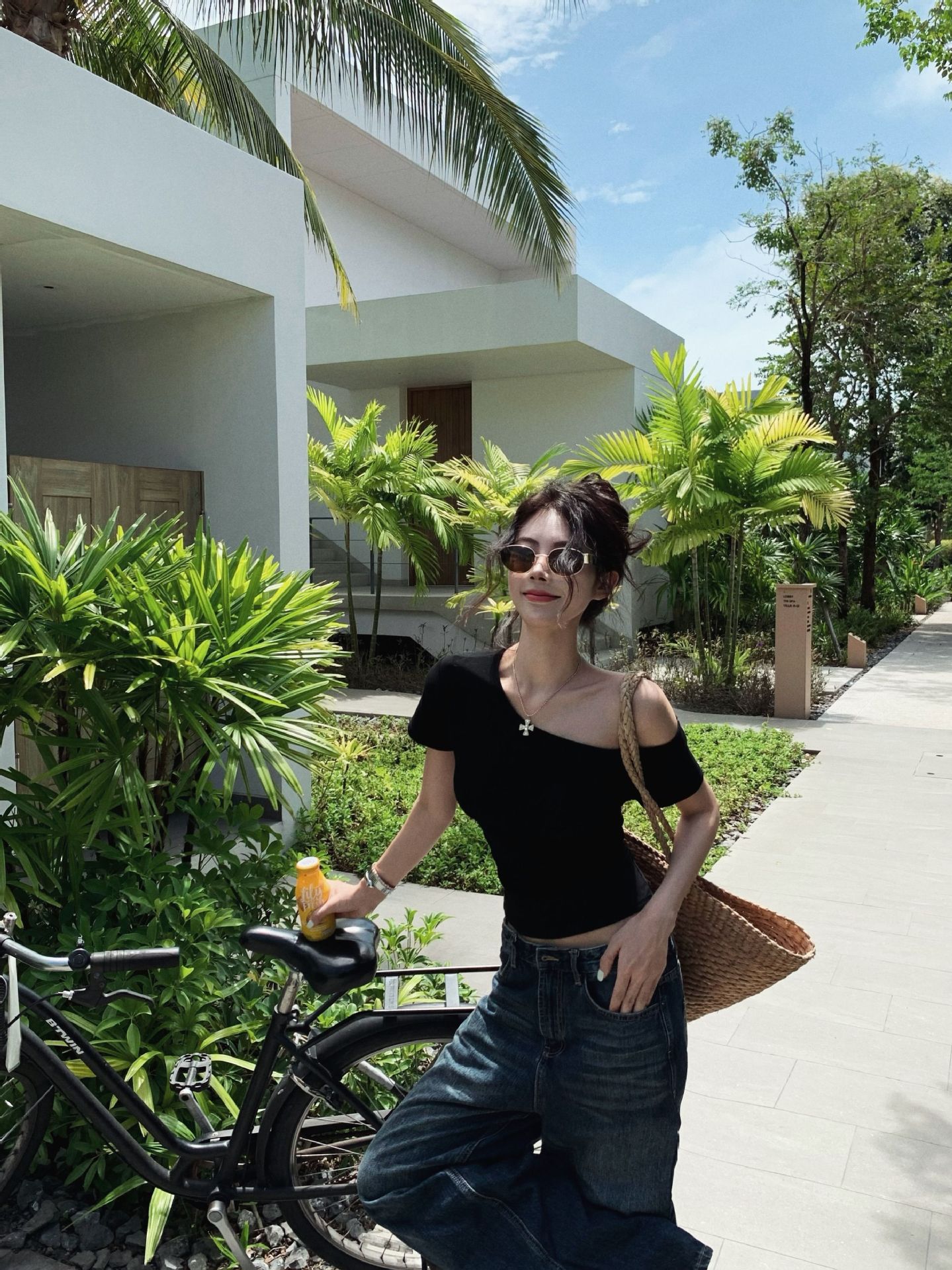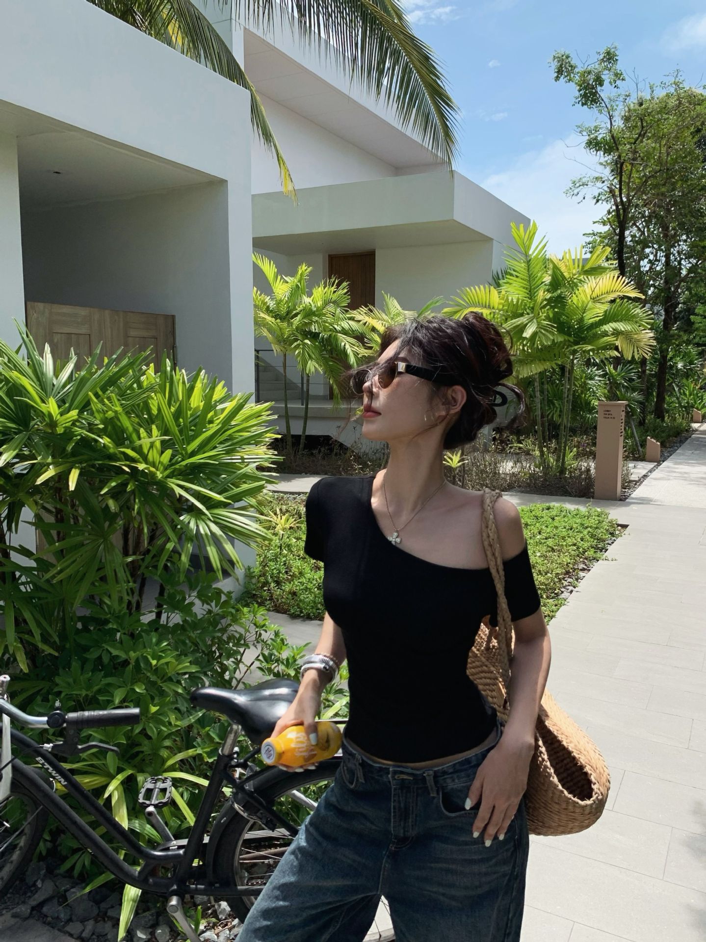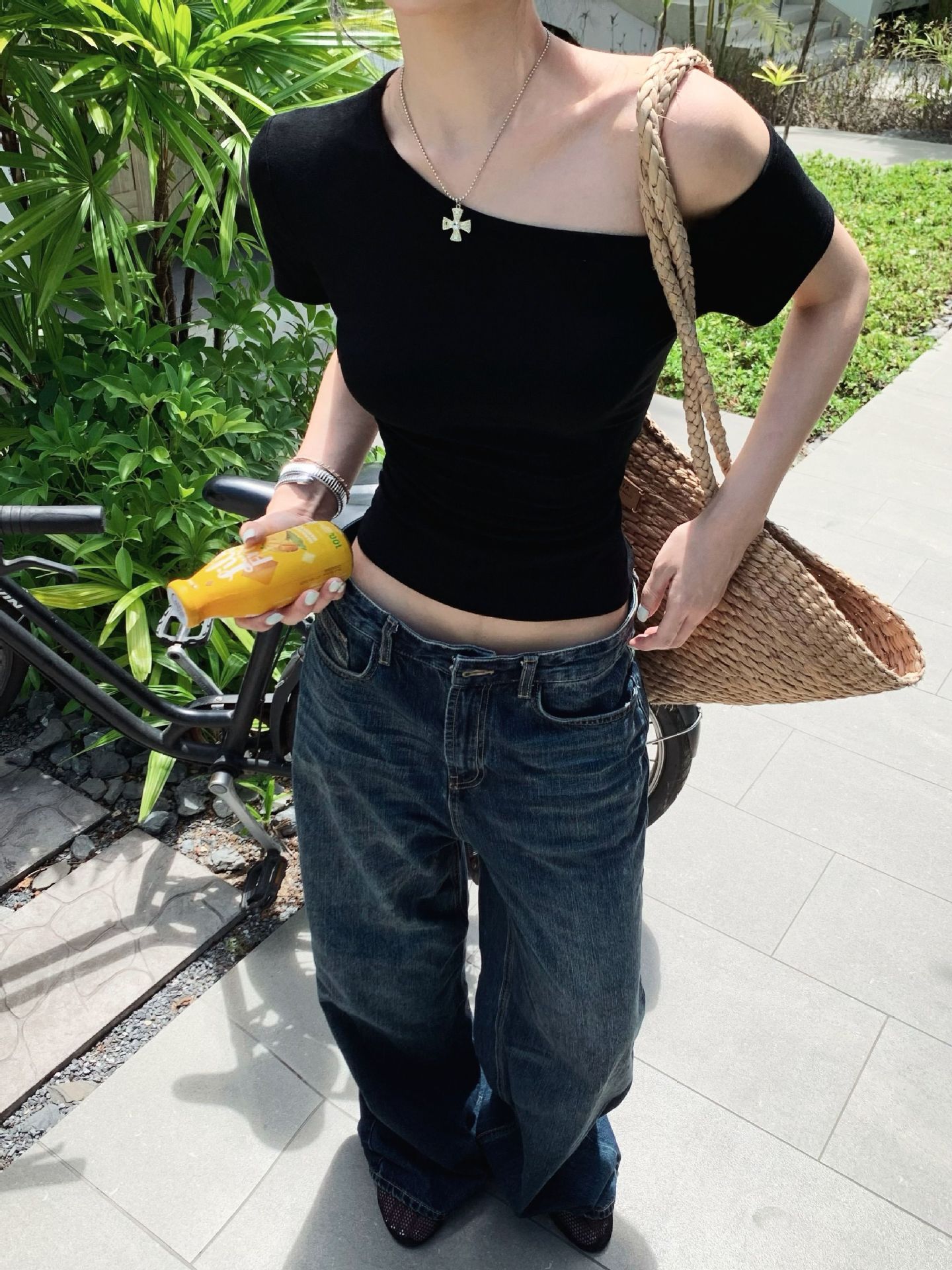 회색 Slant Collar Shoulder 반팔 티셔츠 여성용 여름 슬림 핏 슬리밍 내부 디자인 핫 소녀 쇼트베이스 탑스토어 가기