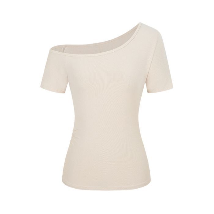 회색 Slant Collar Shoulder 반팔 티셔츠 여성용 여름 슬림 핏 슬리밍 내부 디자인 핫 소녀 쇼트베이스 탑