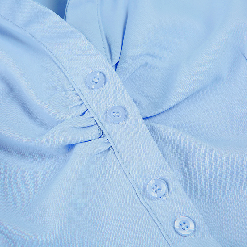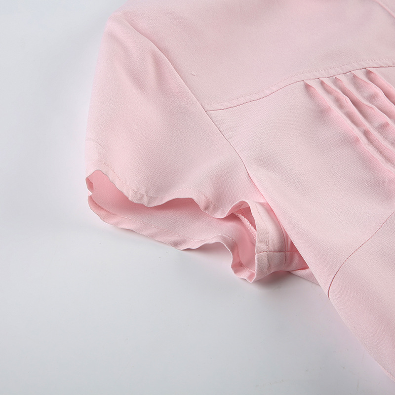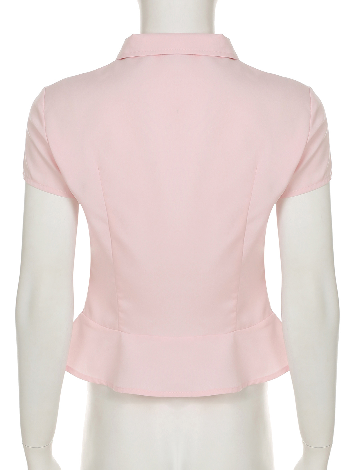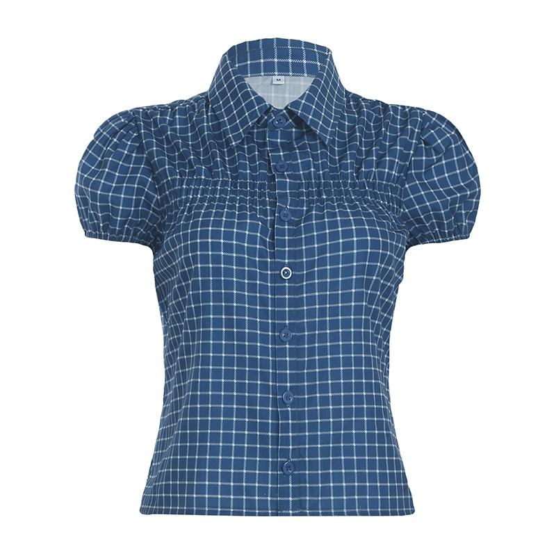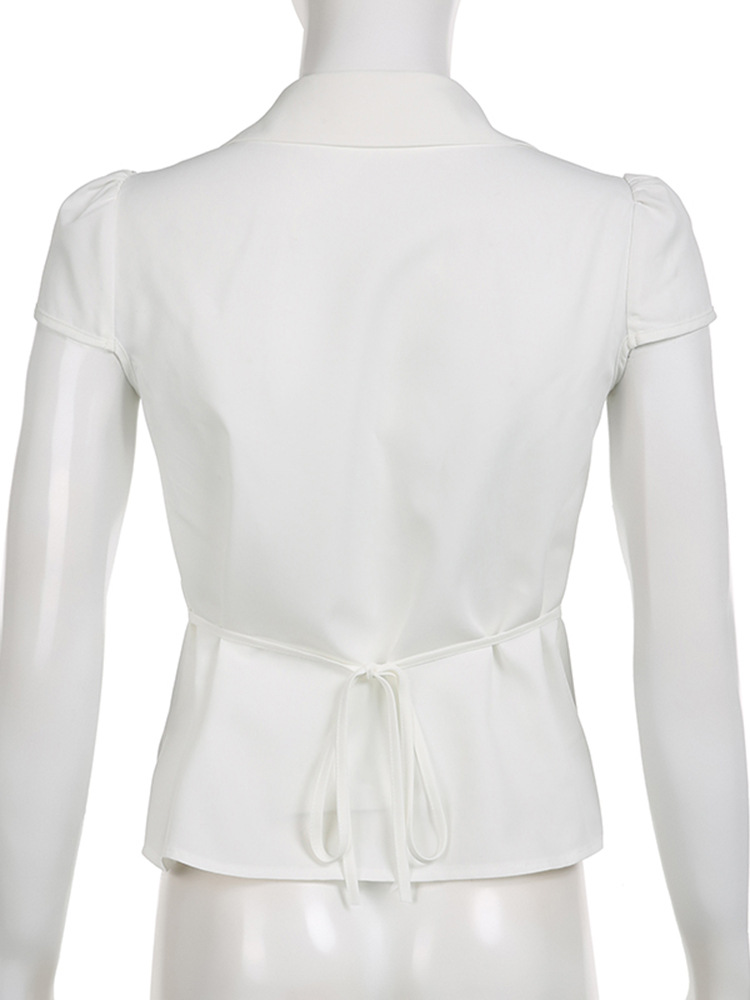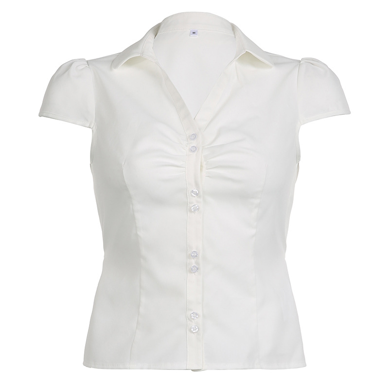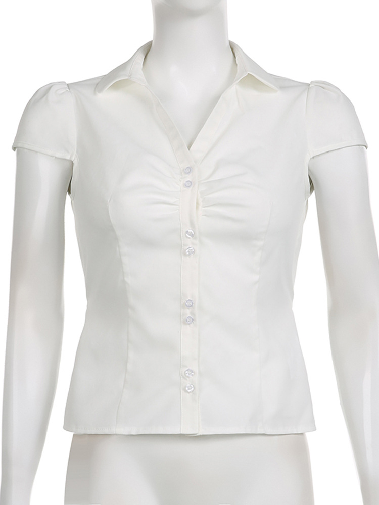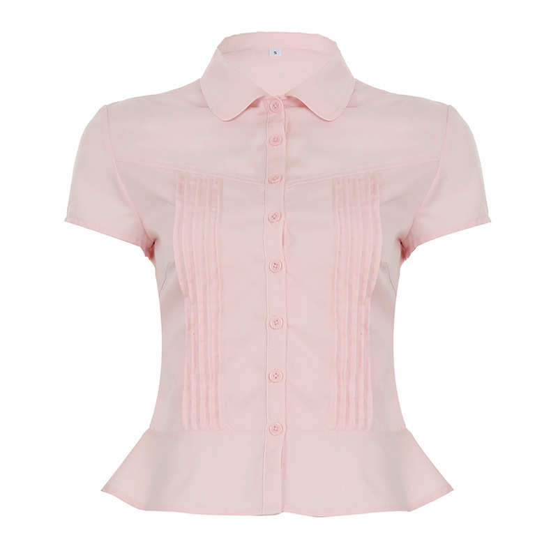 아메리칸 스타일 가리 스타일 우아한 오르간 주름 단색 폴로 칼라 짧은 소매 셔츠 타이트 허리 짧은 가슴 자른 탑