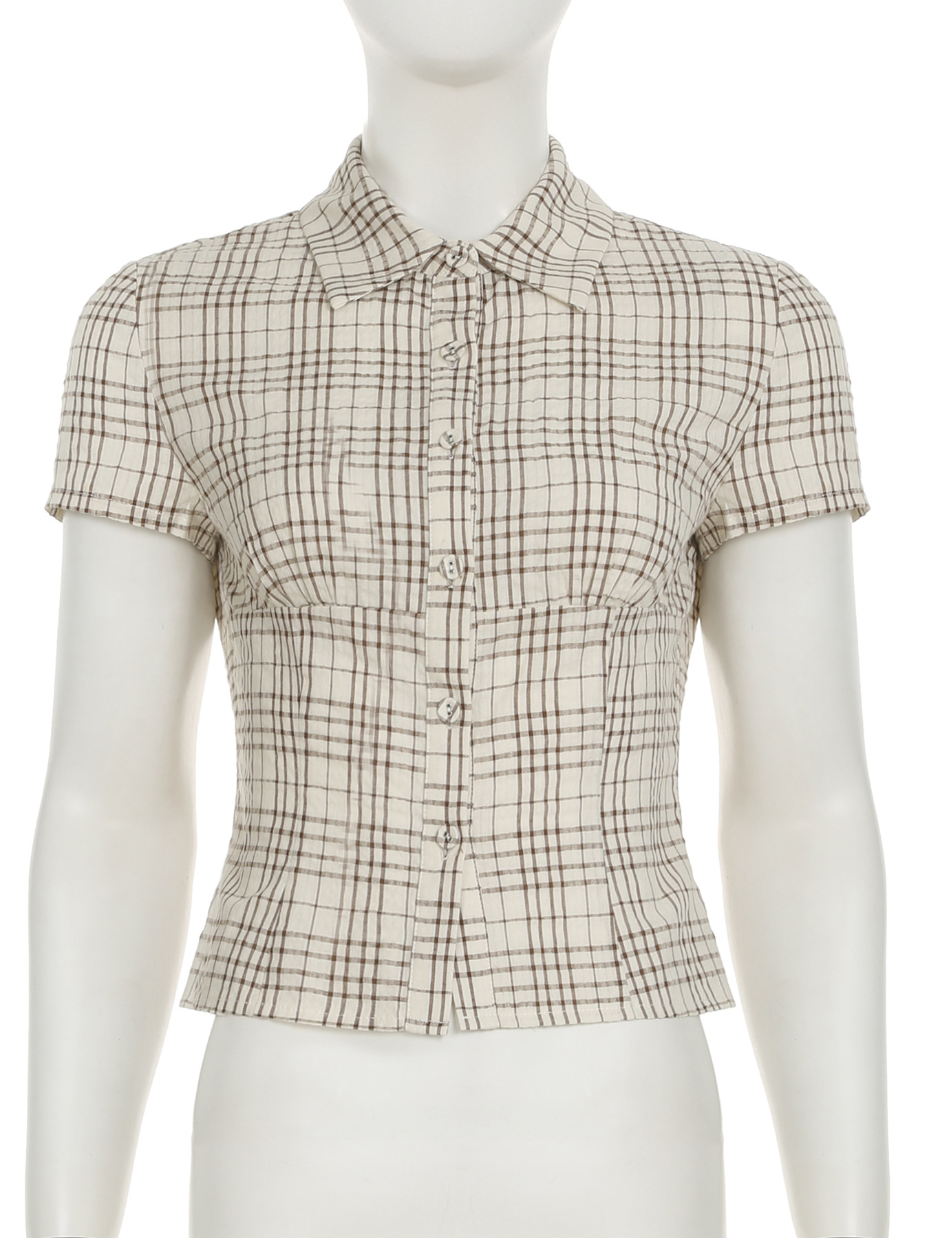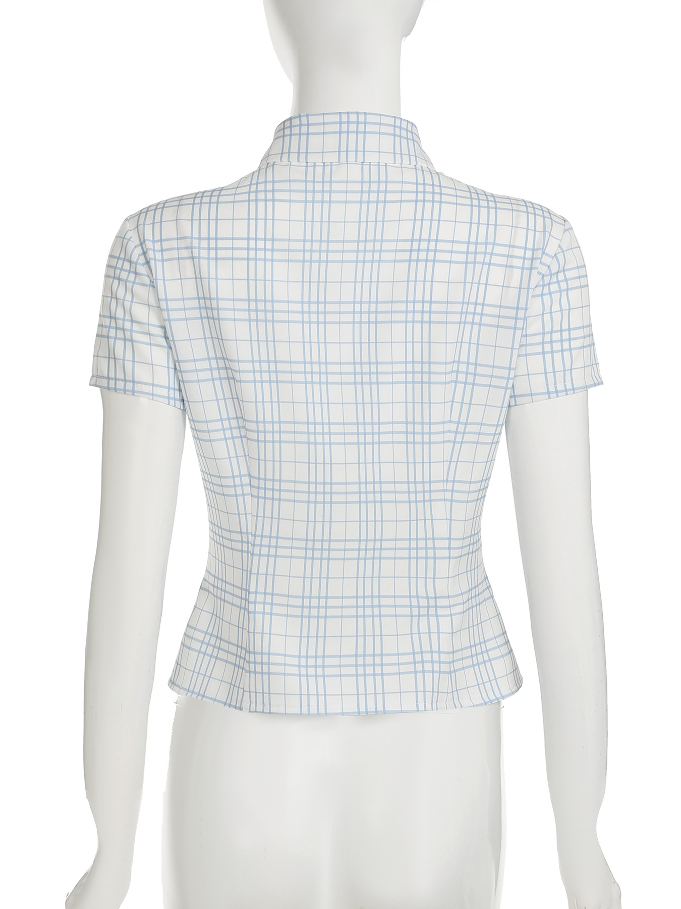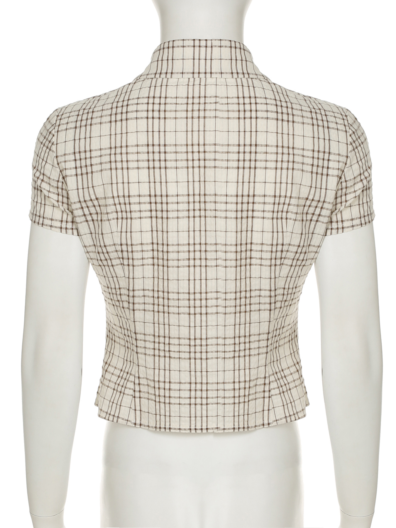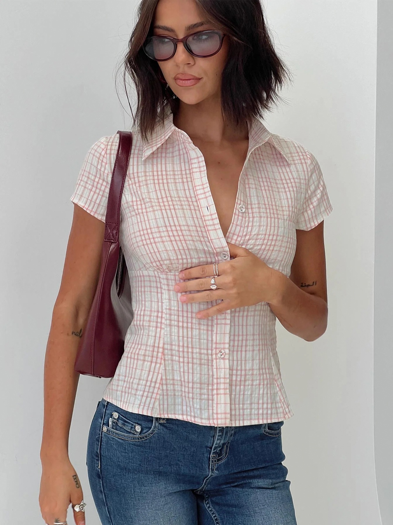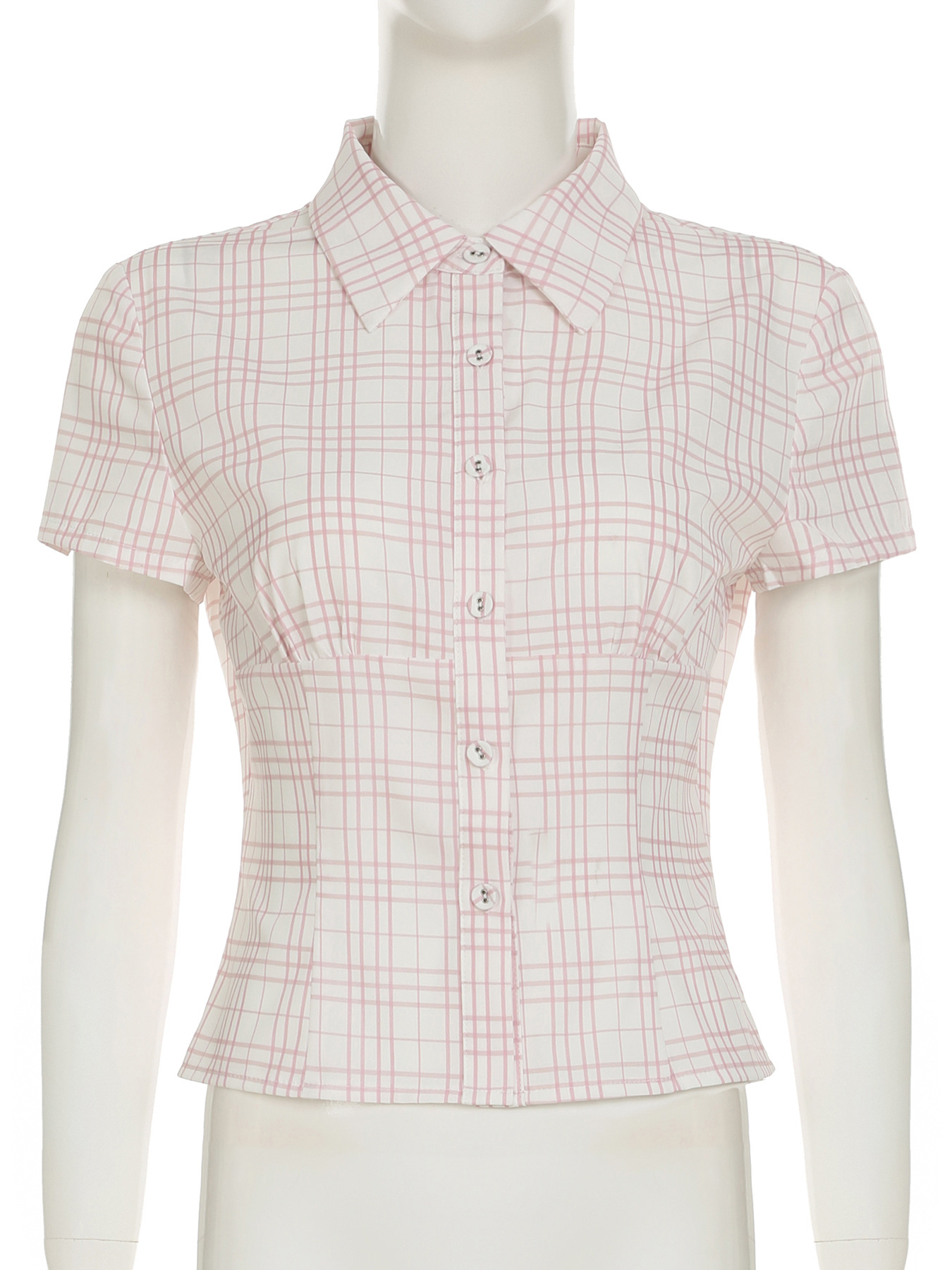 아메리칸 스타일 가리 스타일 우아한 오르간 주름 단색 폴로 칼라 짧은 소매 셔츠 타이트 허리 짧은 가슴 자른 탑
