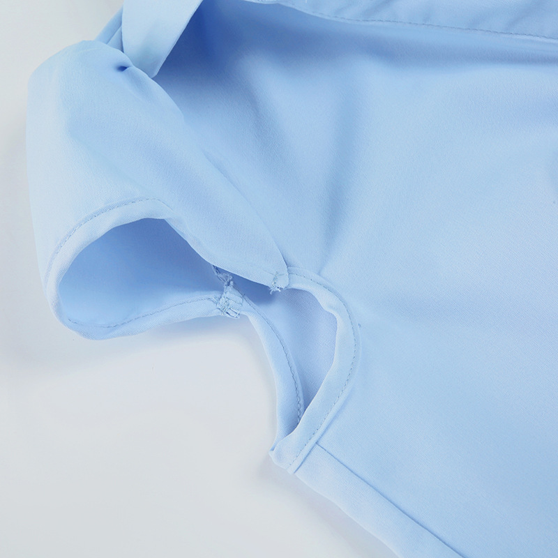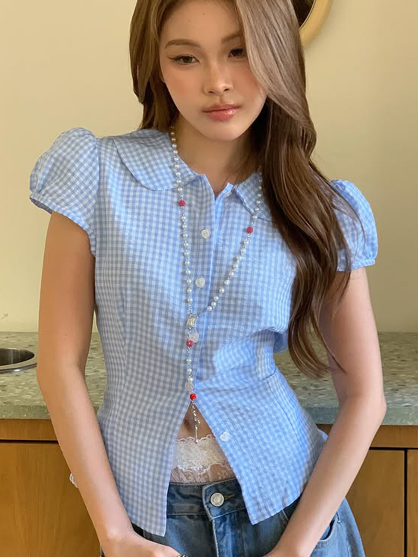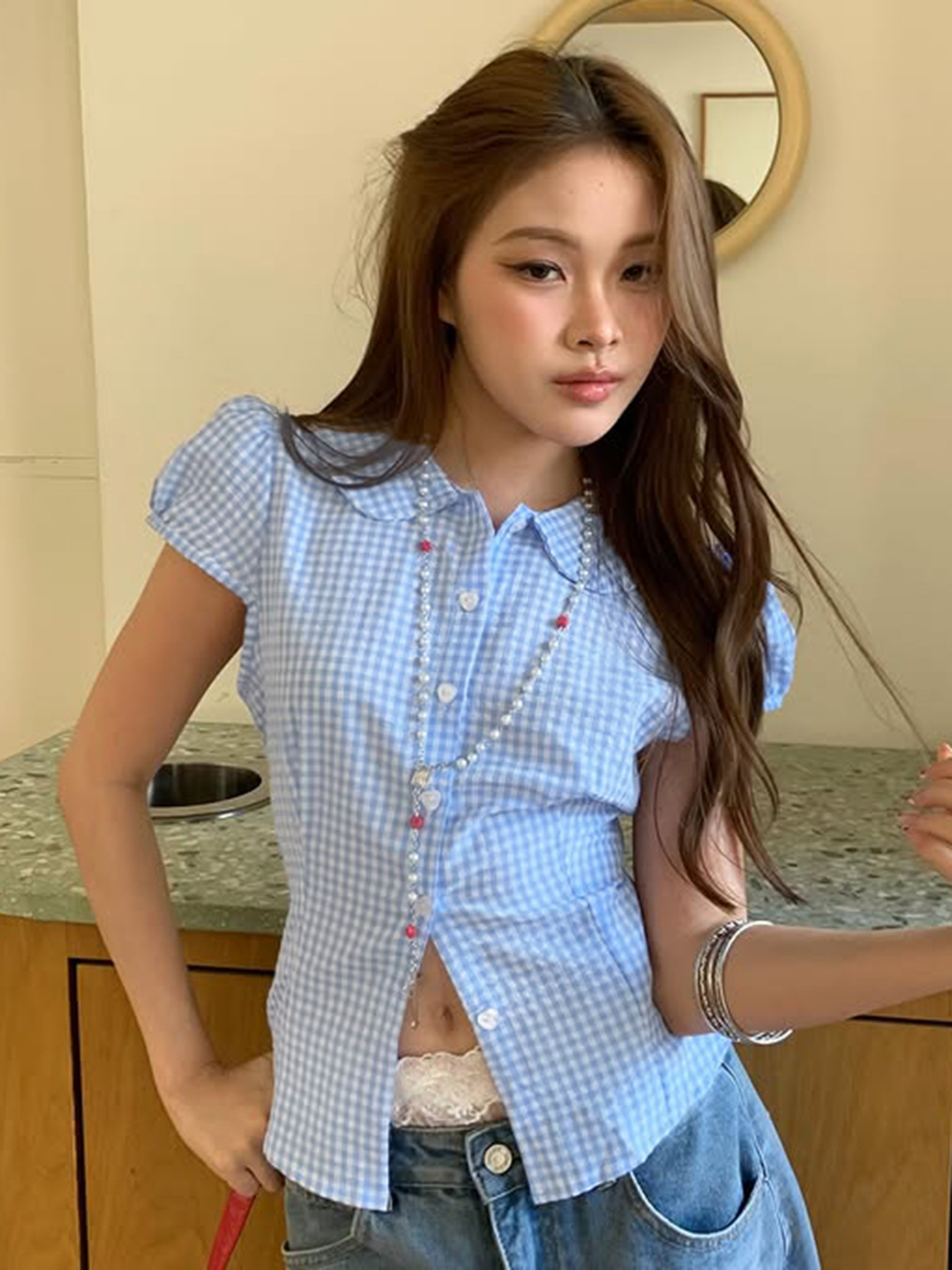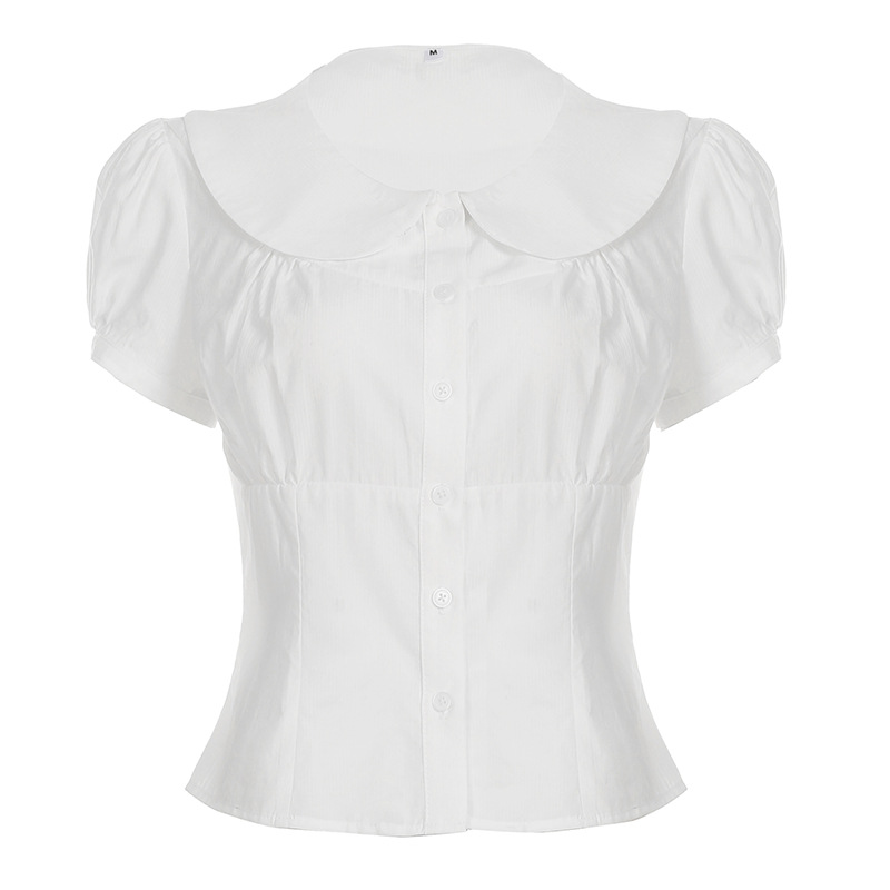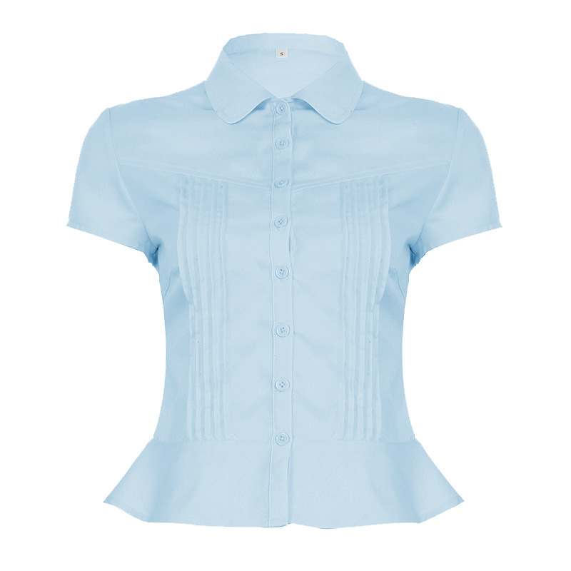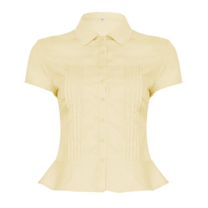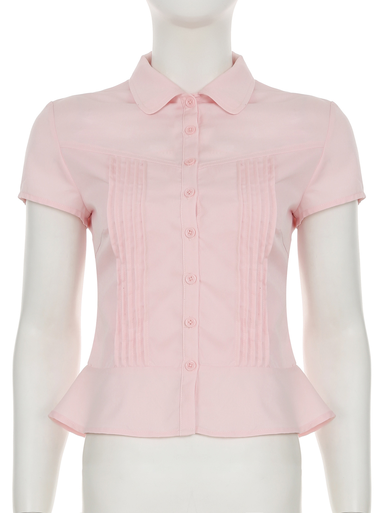 아메리칸 스타일 가리 스타일 우아한 오르간 주름 단색 폴로 칼라 짧은 소매 셔츠 타이트 허리 짧은 가슴 자른 탑스토어 가기
