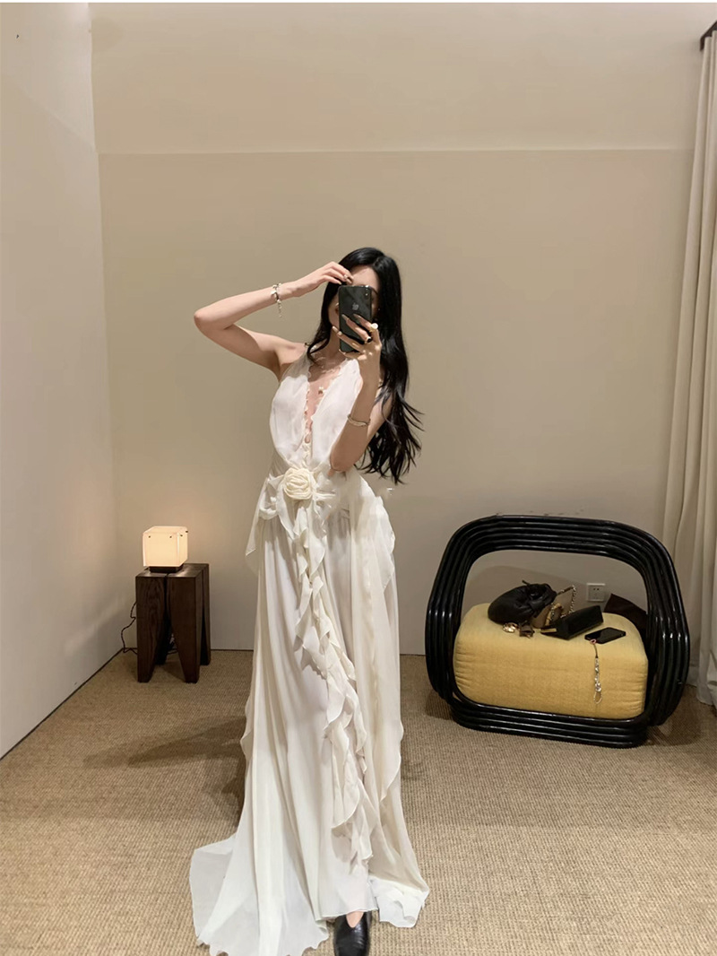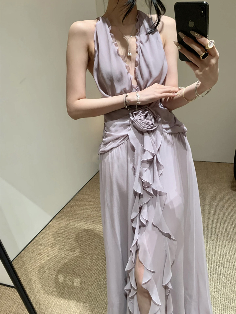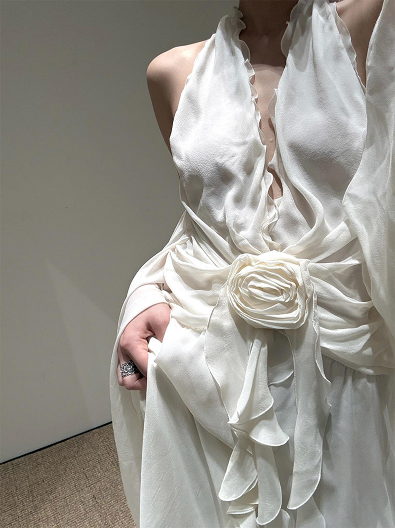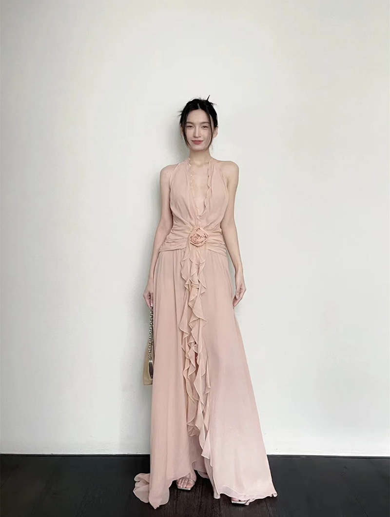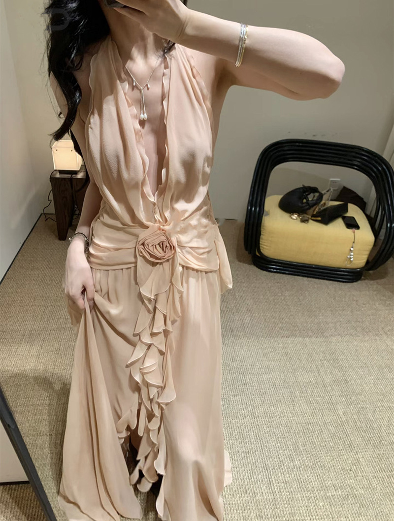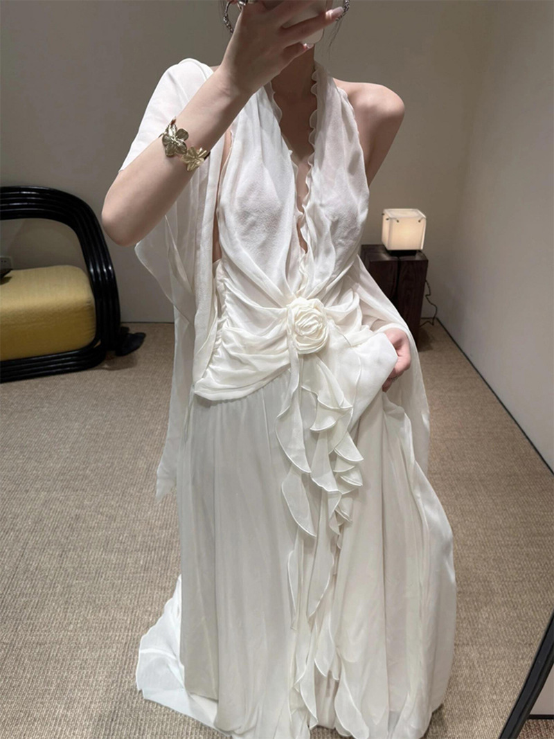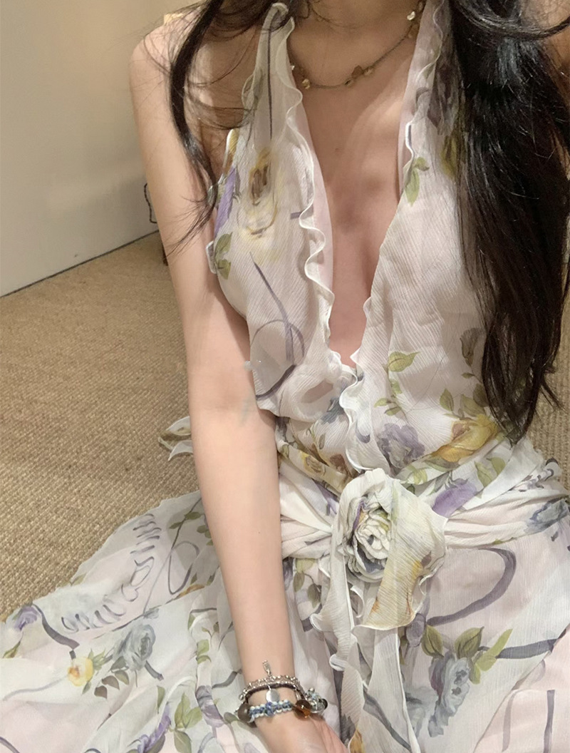 프랑스 스타일 휴가 스타일 V 넥 교수형 목 귀 주름 원피스 쉬폰 3 차원 꽃 백리스 섹시한 저녁 원피스