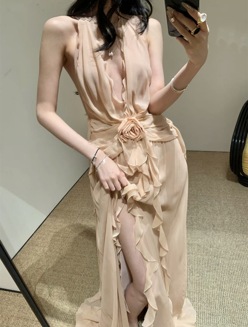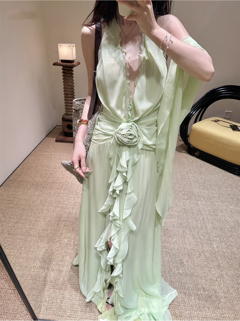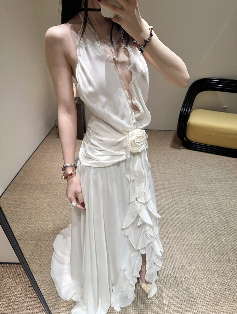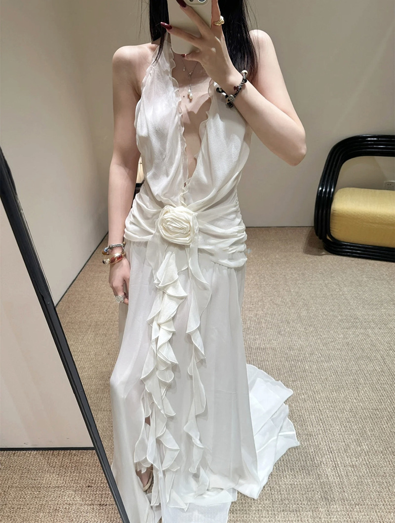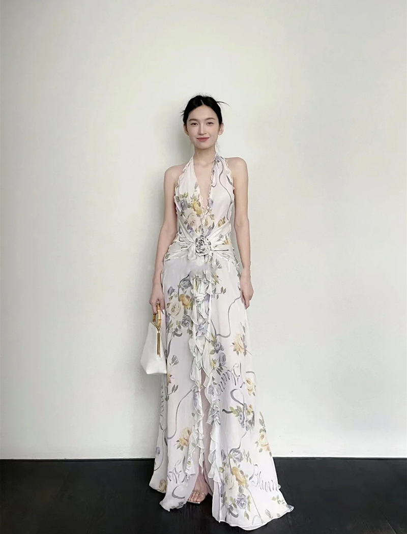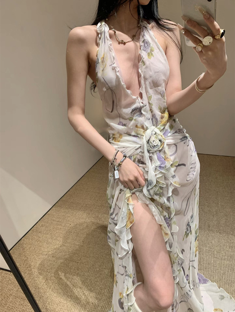 프랑스 스타일 휴가 스타일 V 넥 교수형 목 귀 주름 원피스 쉬폰 3 차원 꽃 백리스 섹시한 저녁 원피스