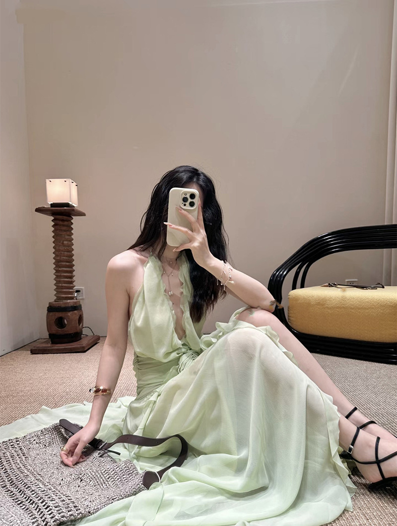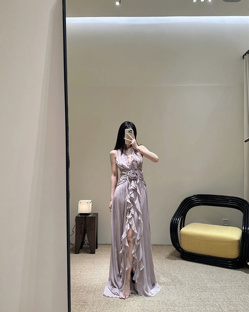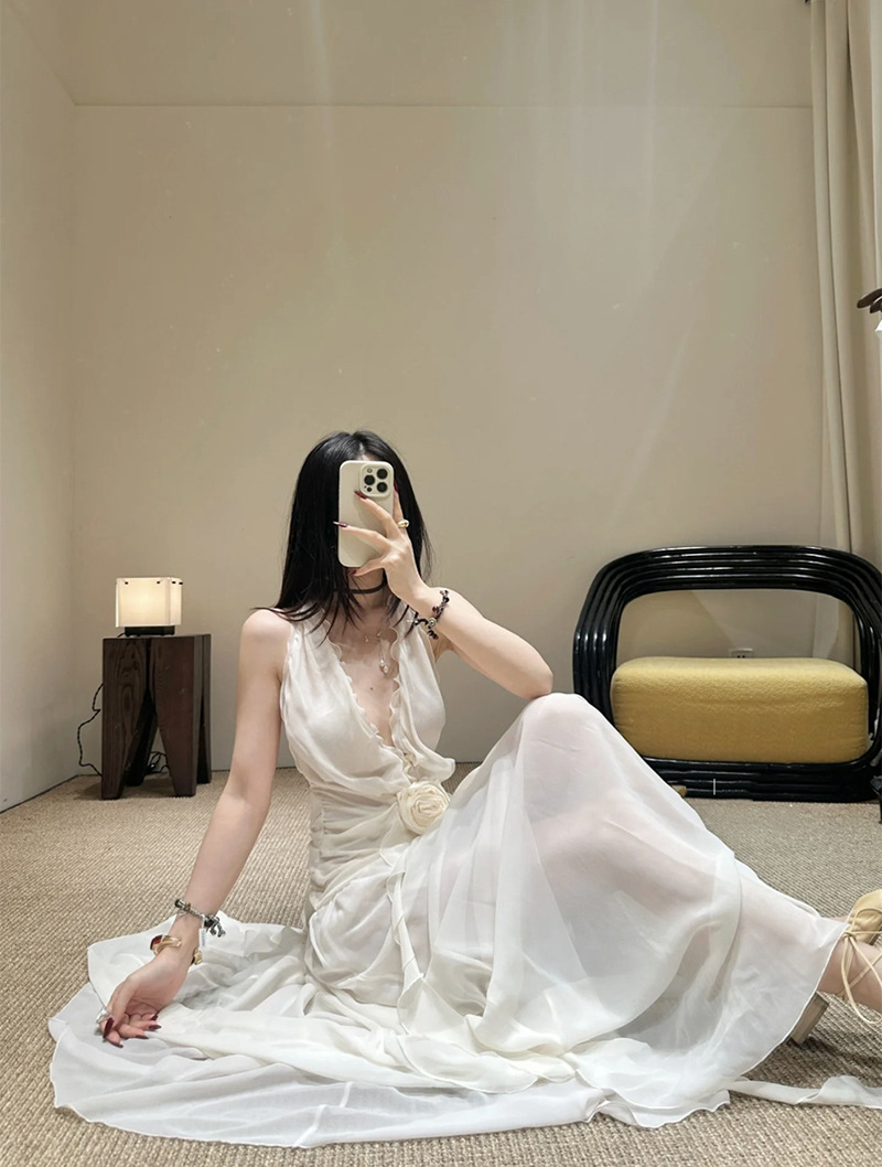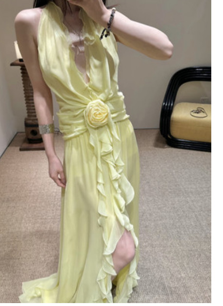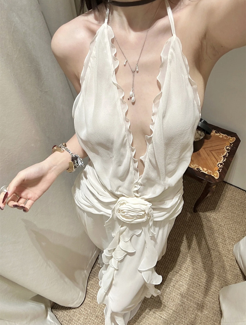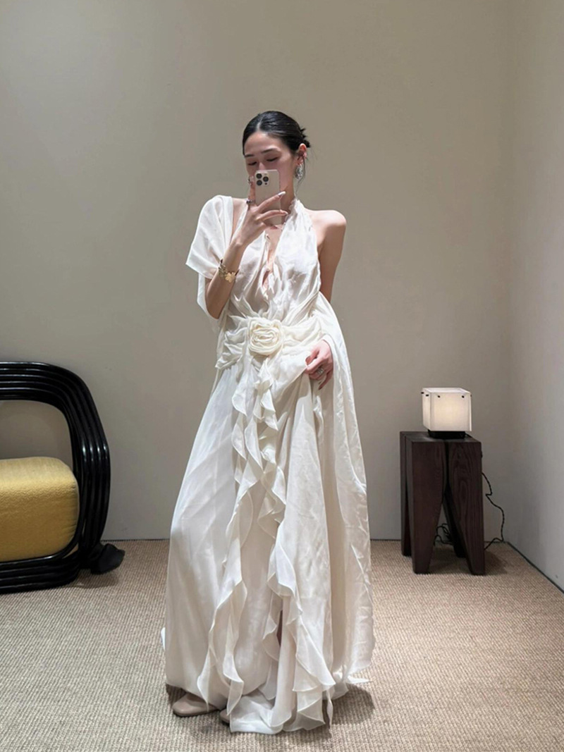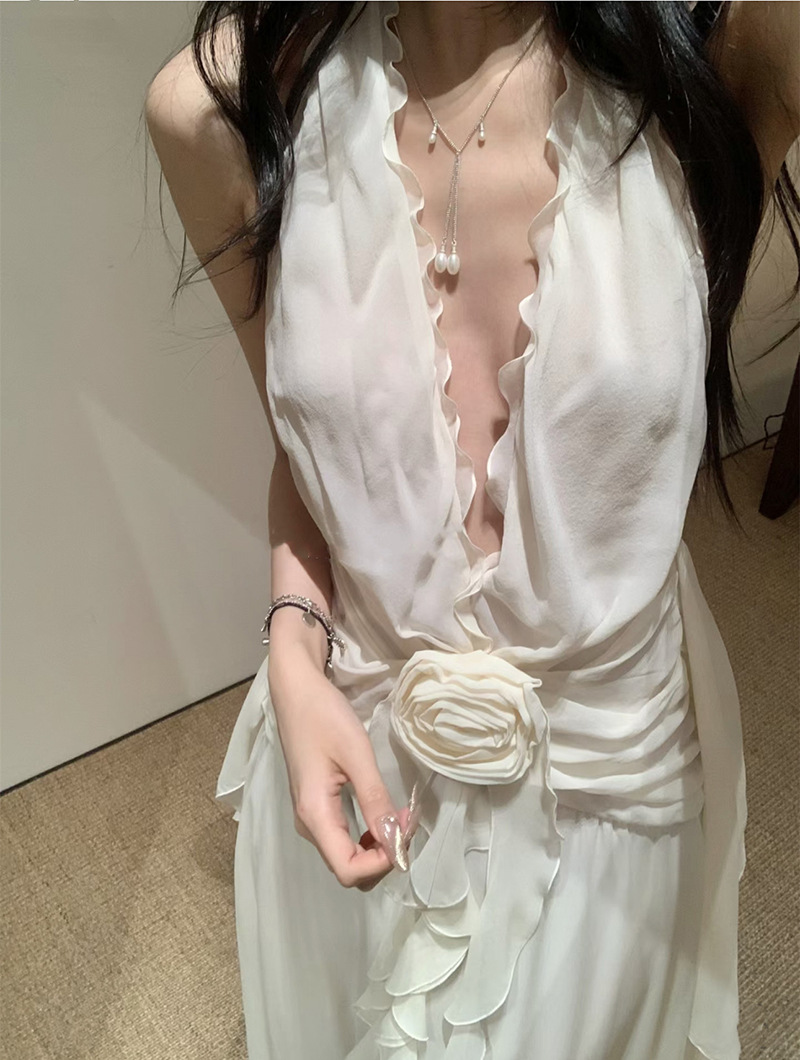 프랑스 스타일 휴가 스타일 V 넥 교수형 목 귀 주름 원피스 쉬폰 3 차원 꽃 백리스 섹시한 저녁 원피스