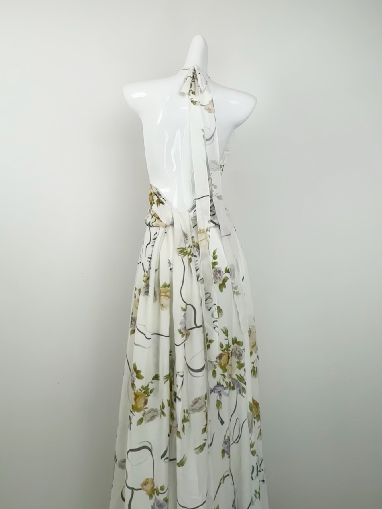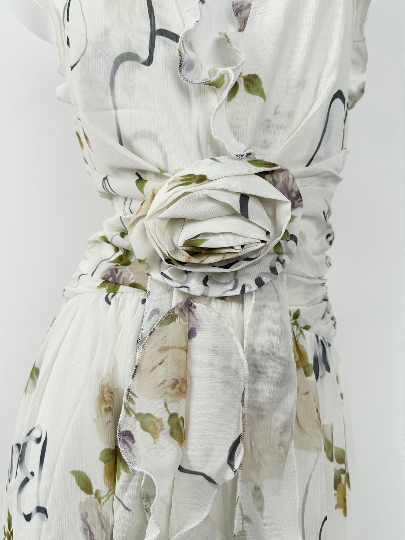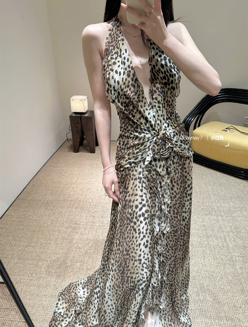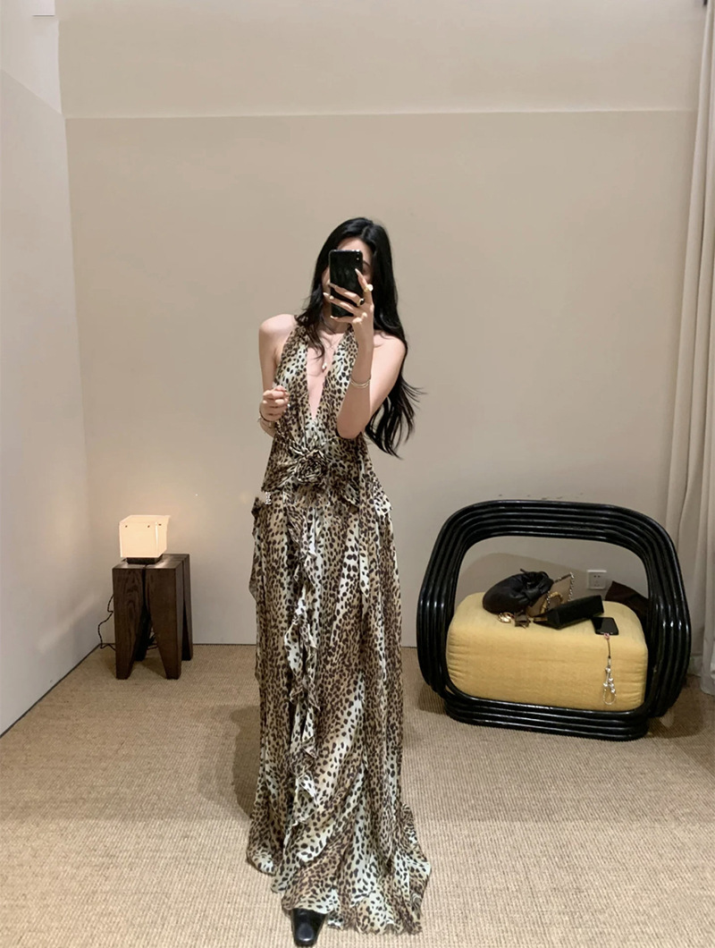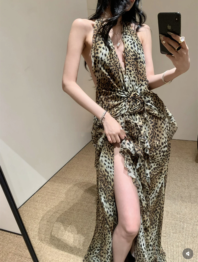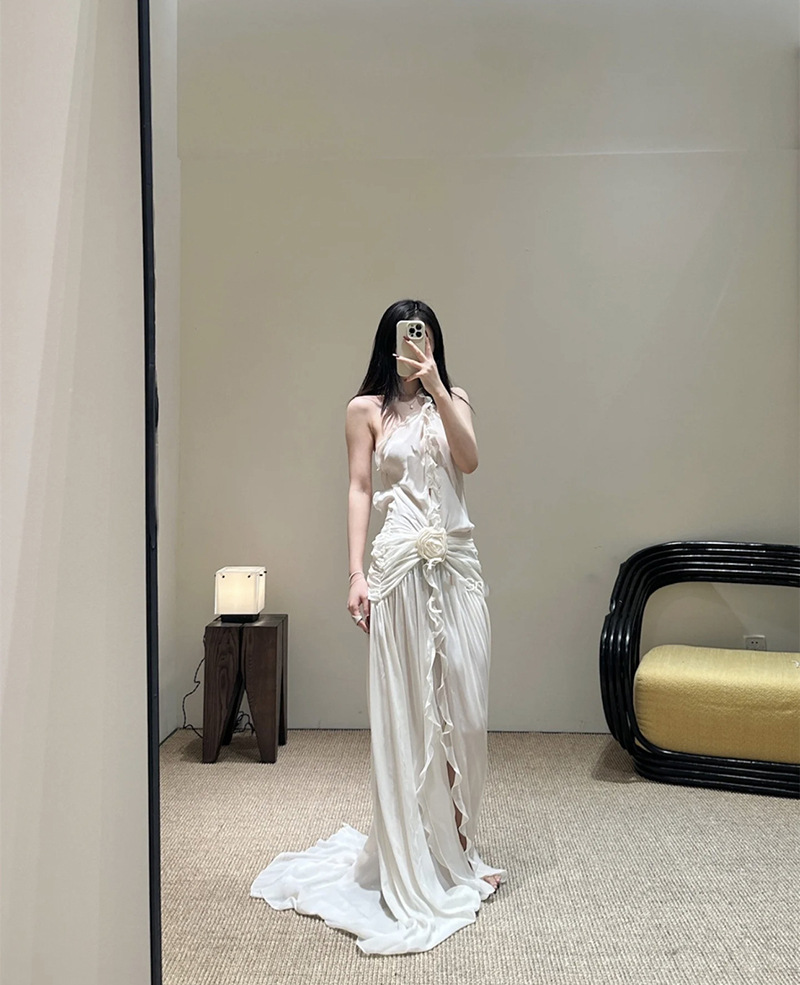 프랑스 스타일 휴가 스타일 V 넥 교수형 목 귀 주름 원피스 쉬폰 3 차원 꽃 백리스 섹시한 저녁 원피스