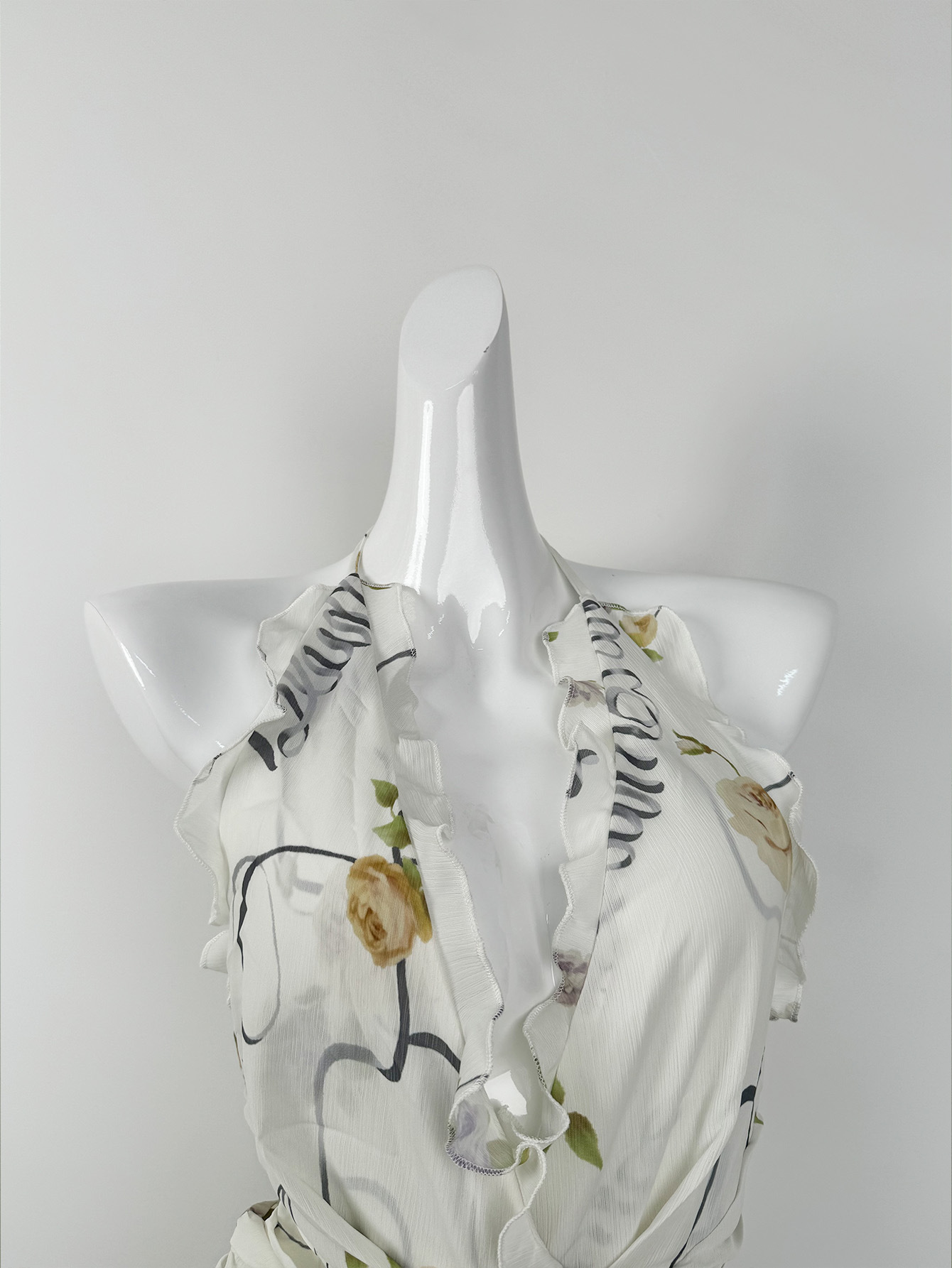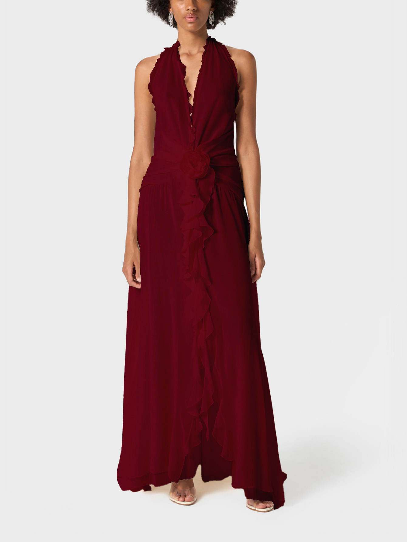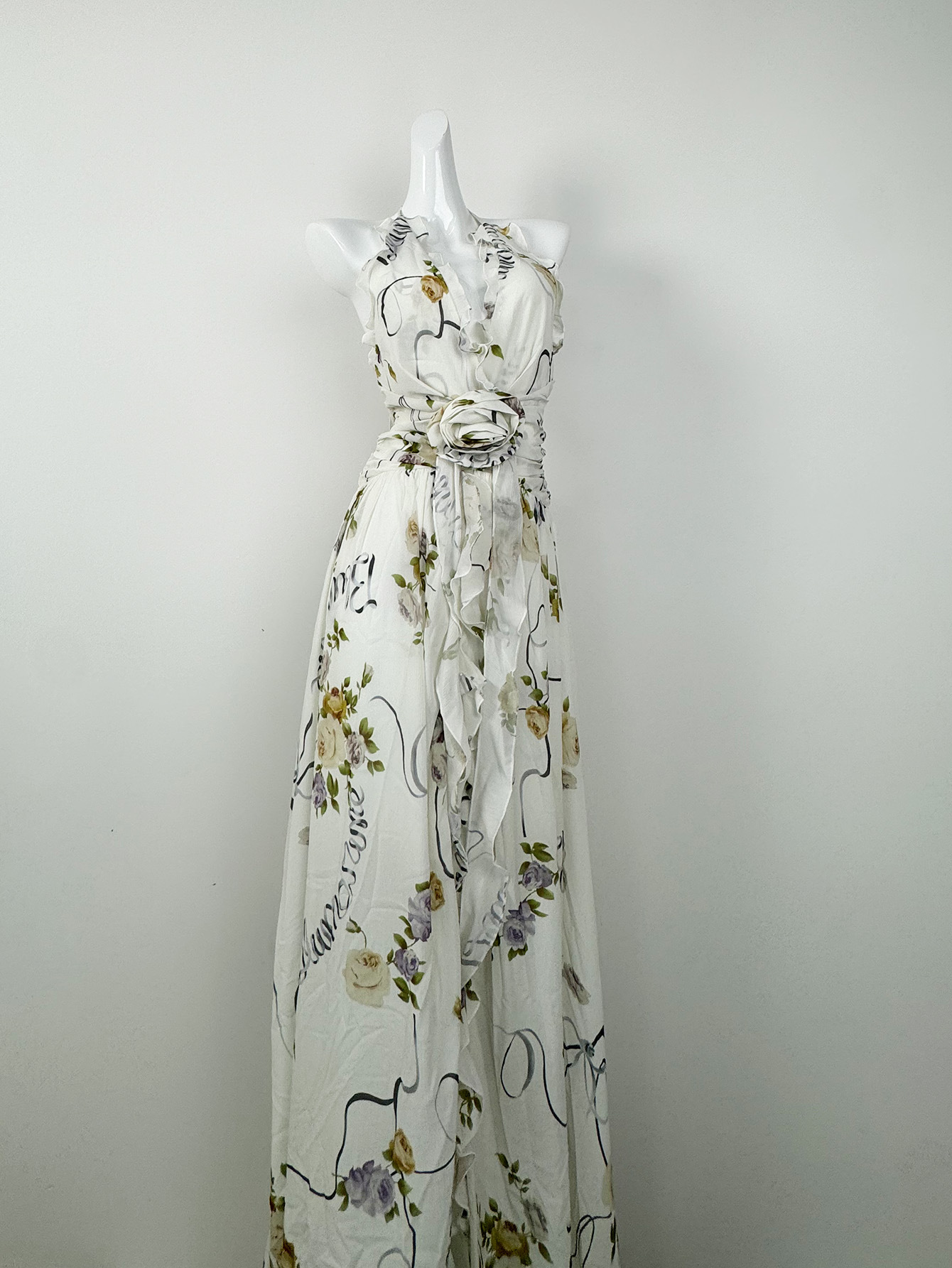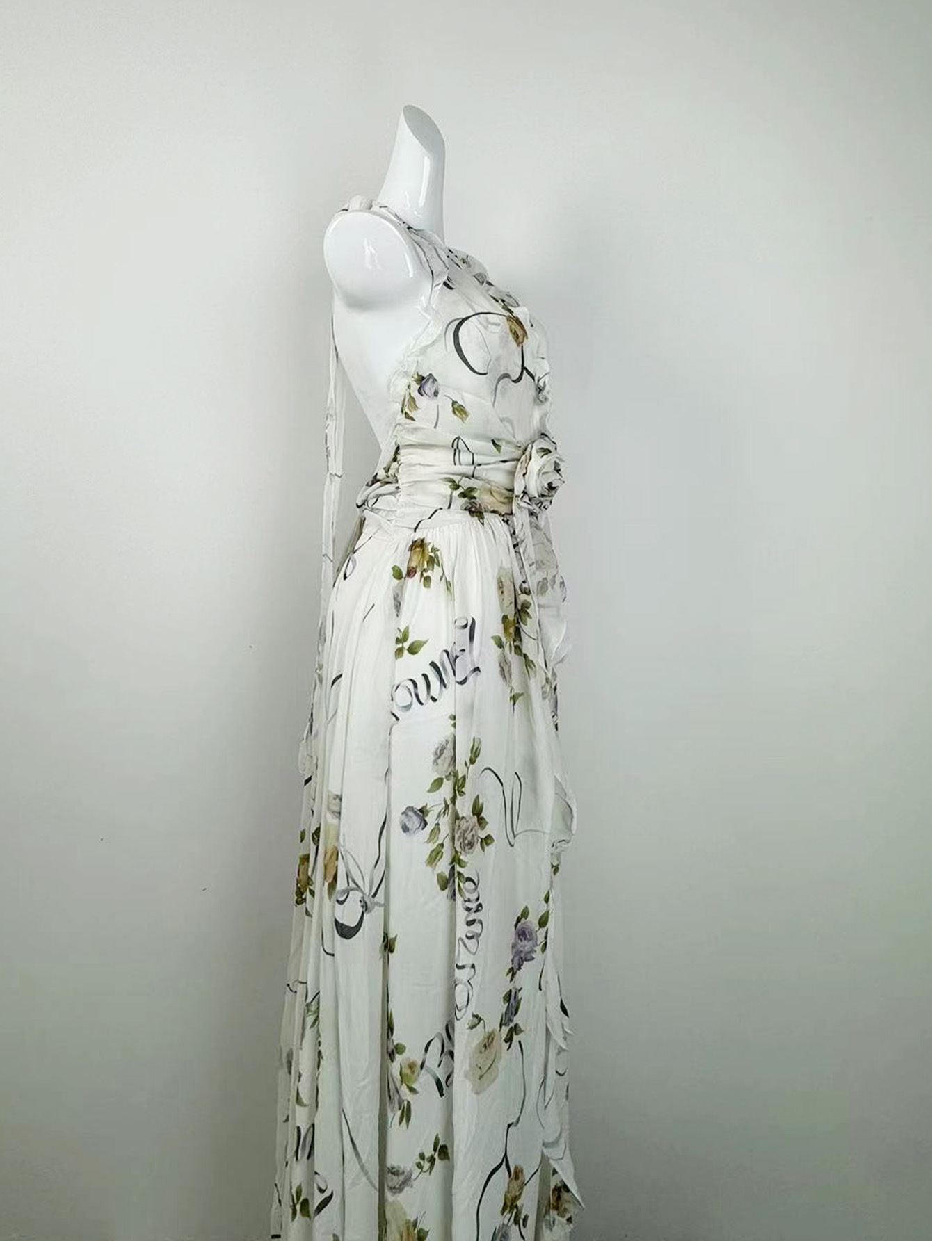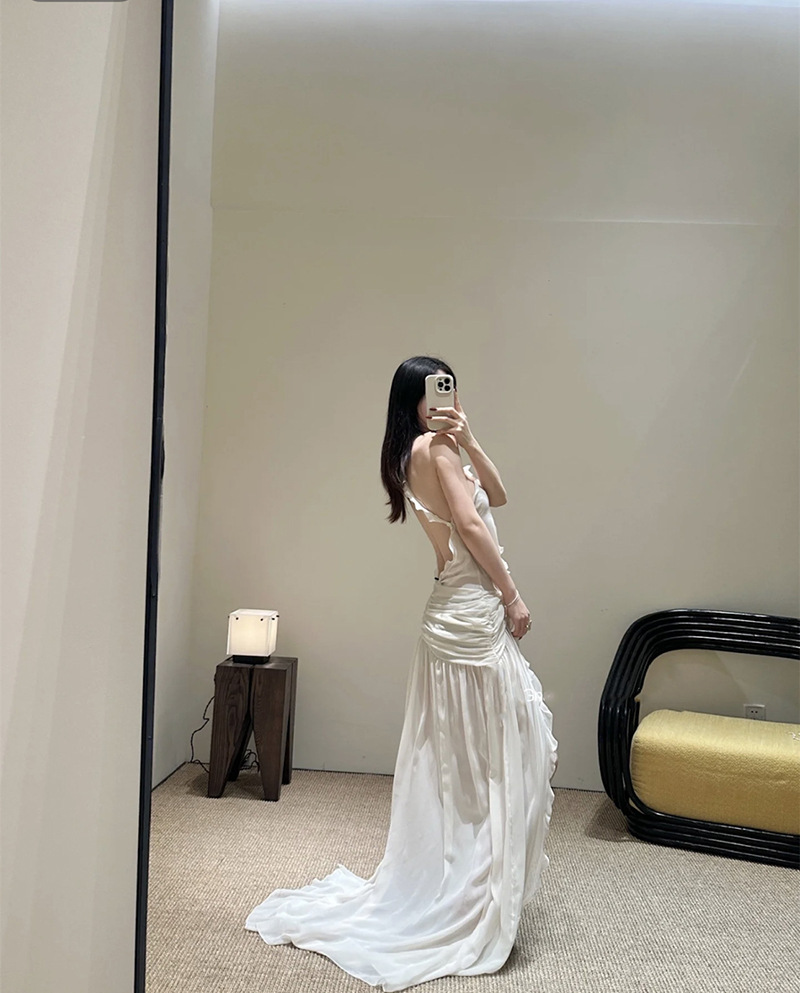 프랑스 스타일 휴가 스타일 V 넥 교수형 목 귀 주름 원피스 쉬폰 3 차원 꽃 백리스 섹시한 저녁 원피스