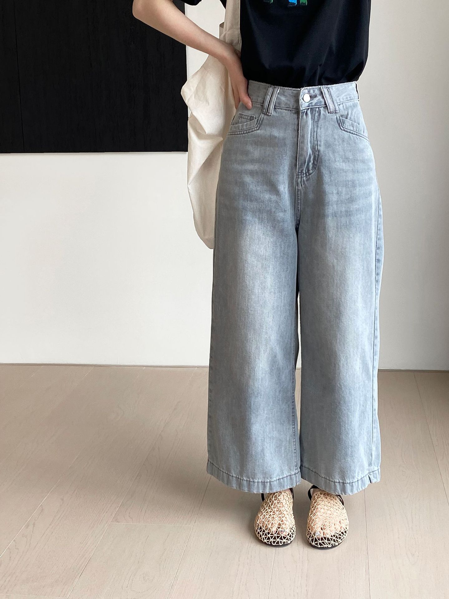 그런 다음 시멘트 데님! 한국 스타일 레트로 오래 된 높은 허리 세척 청바지 여성용 캐주얼 발목 길이 바지 Z3395