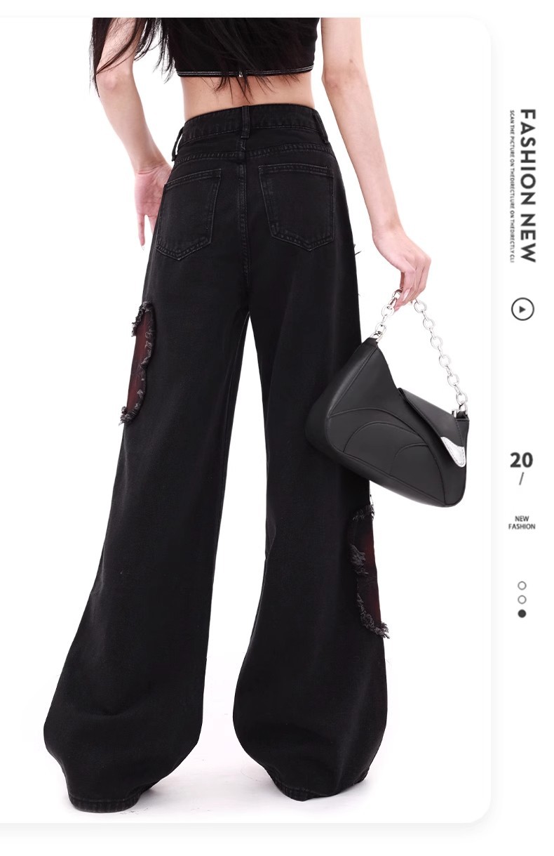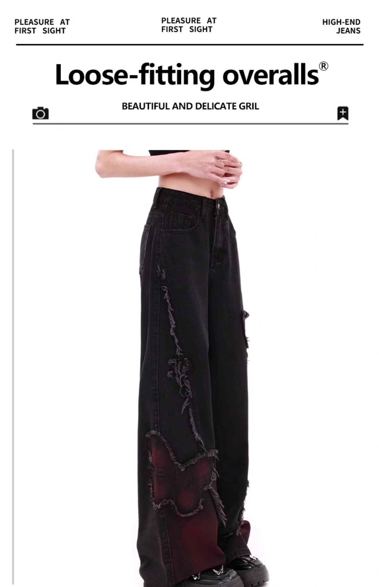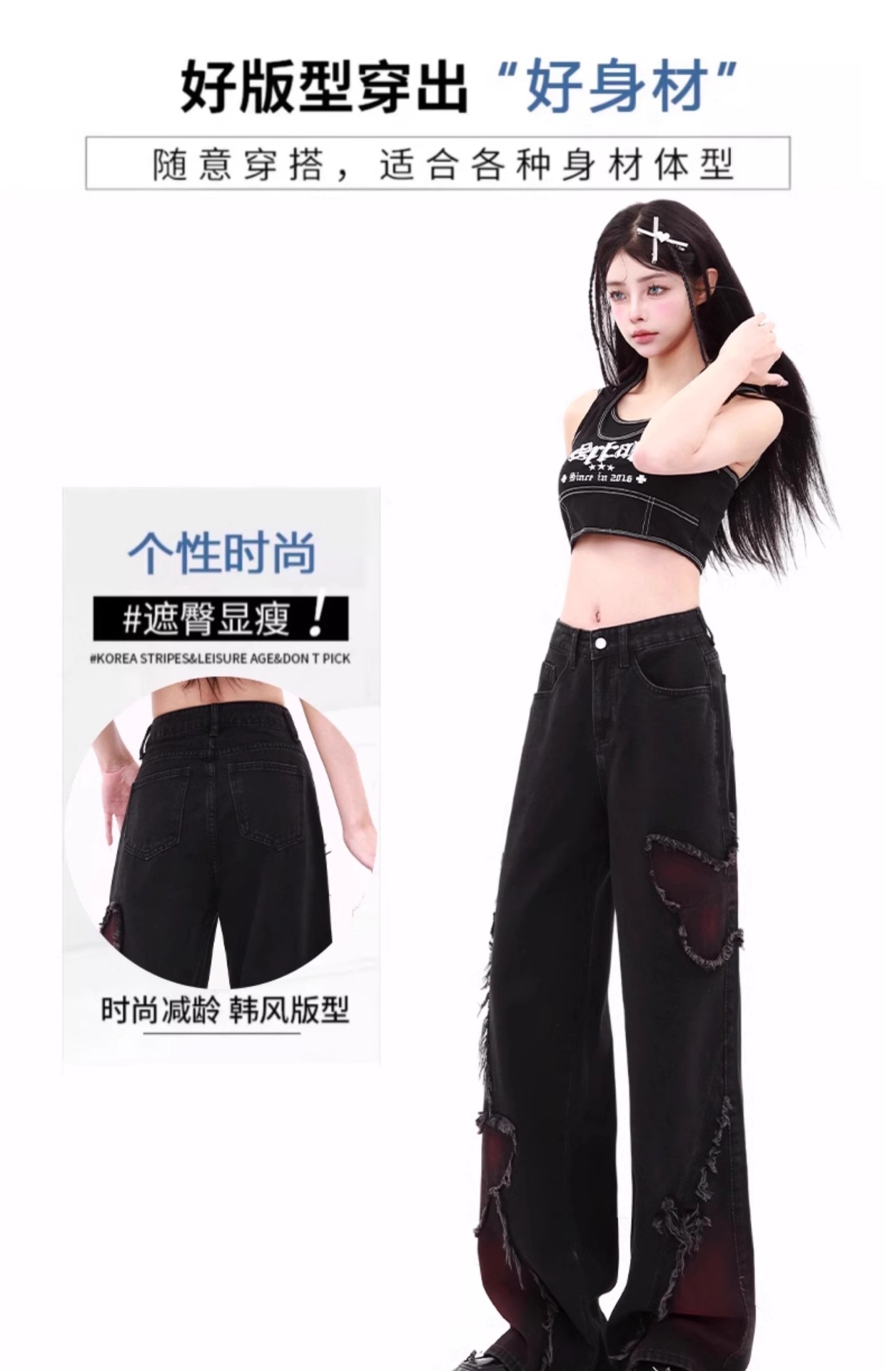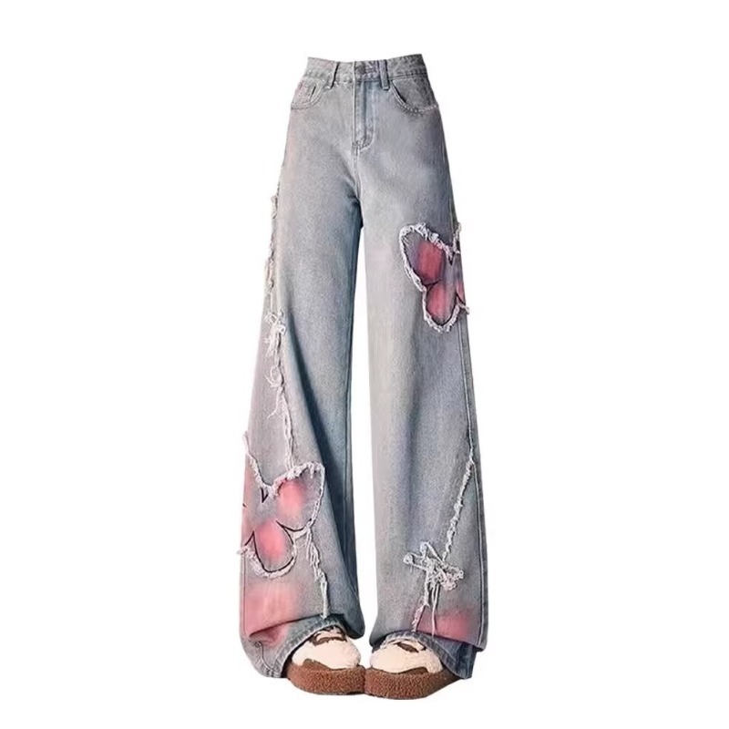 봄 여름 디자인의 여성용 블랙 버터플라이 와이드 레그 청바지, 니치 아메리칸 레트로 하이웨이스트 슬림 스트레이트 팬츠스토어 가기
