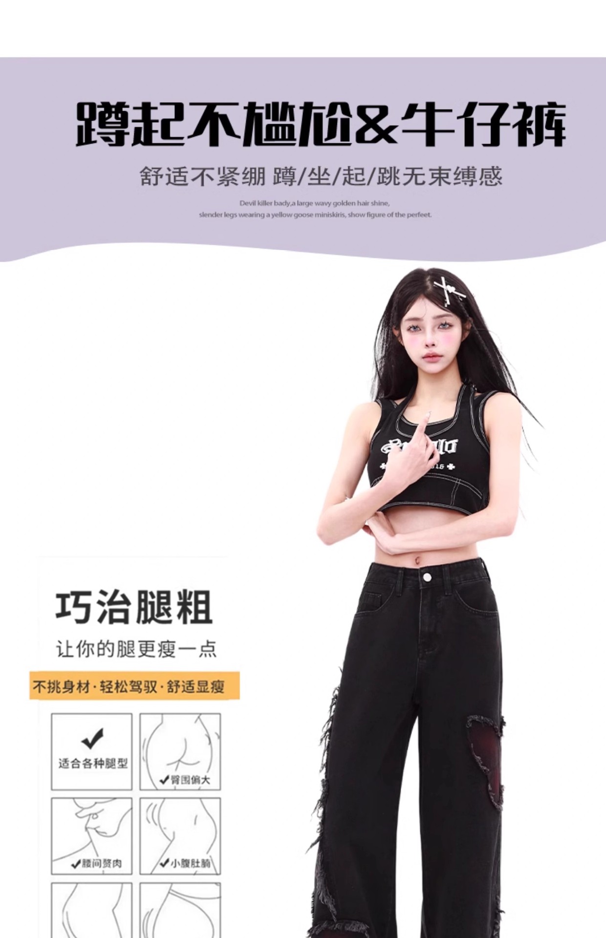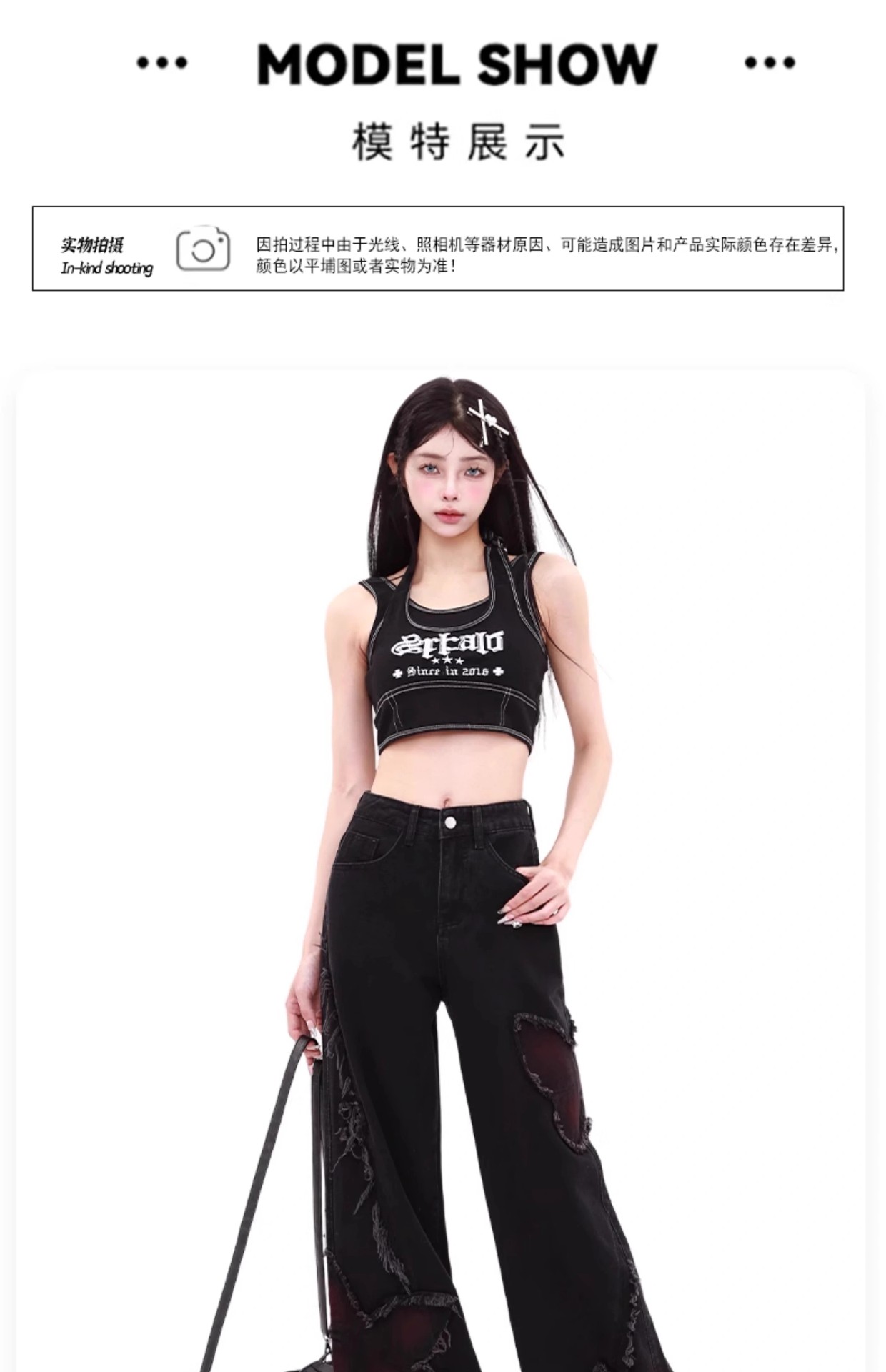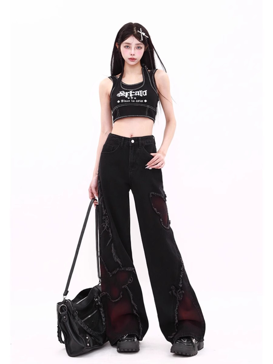 봄 여름 디자인의 여성용 블랙 버터플라이 와이드 레그 청바지, 니치 아메리칸 레트로 하이웨이스트 슬림 스트레이트 팬츠스토어 가기