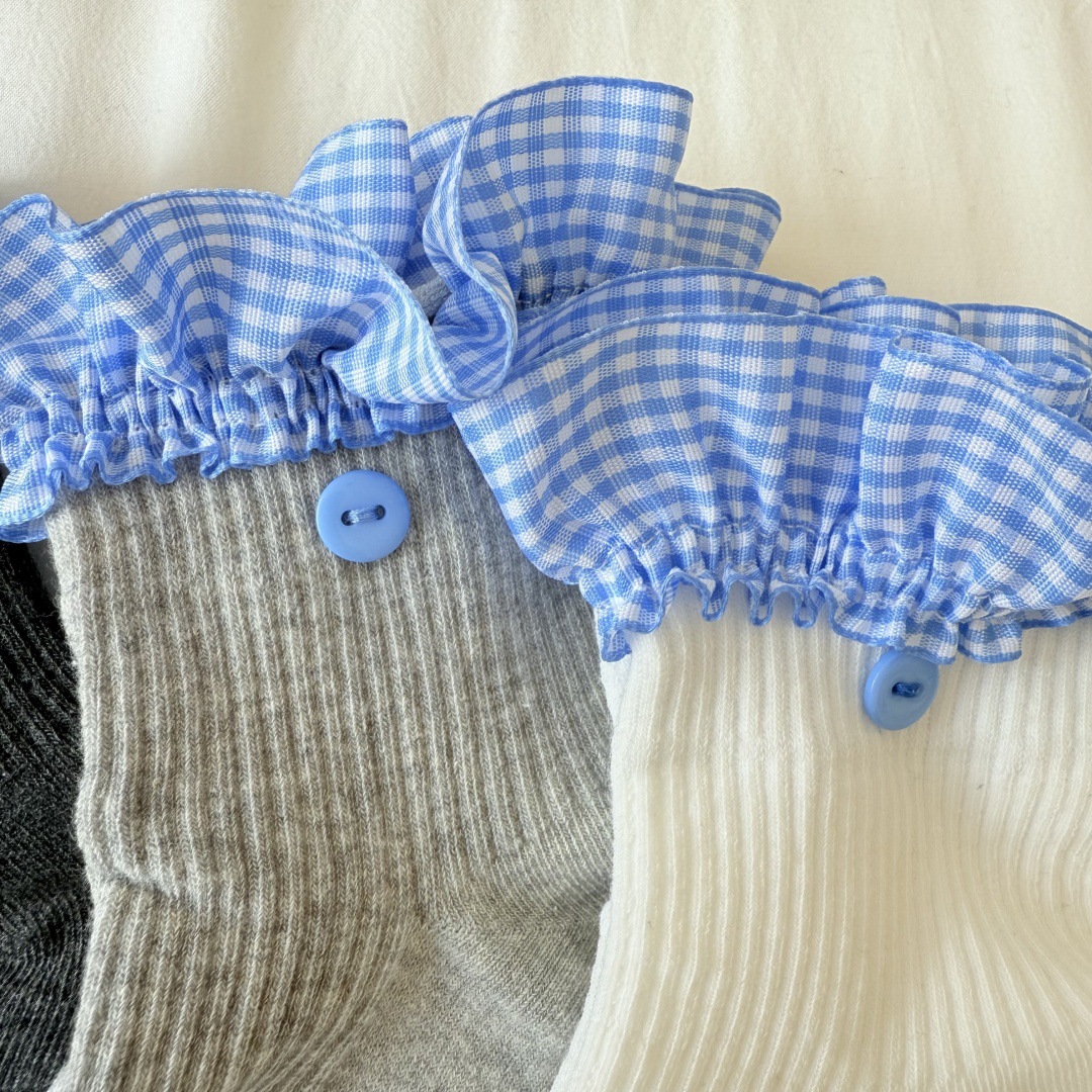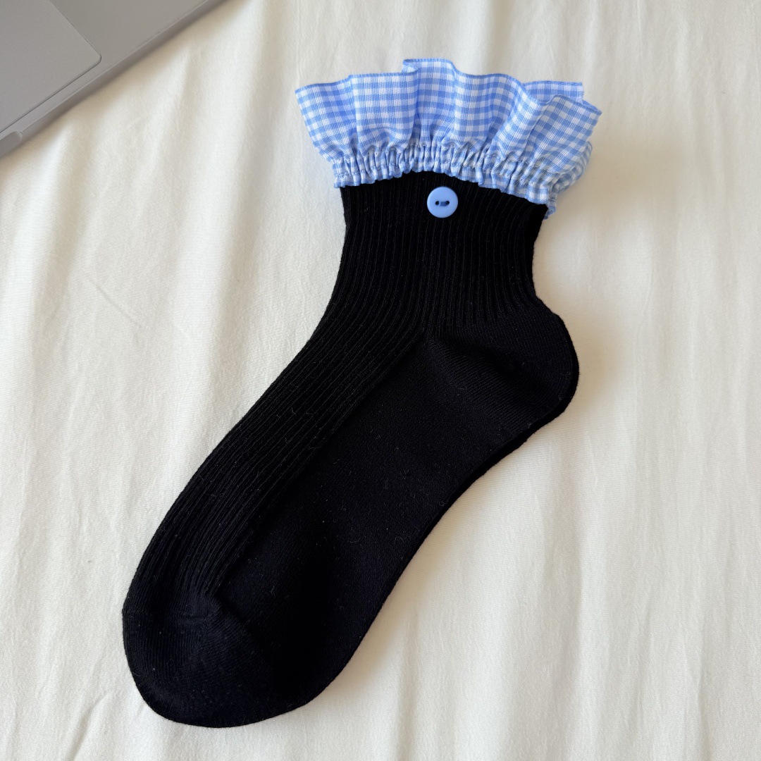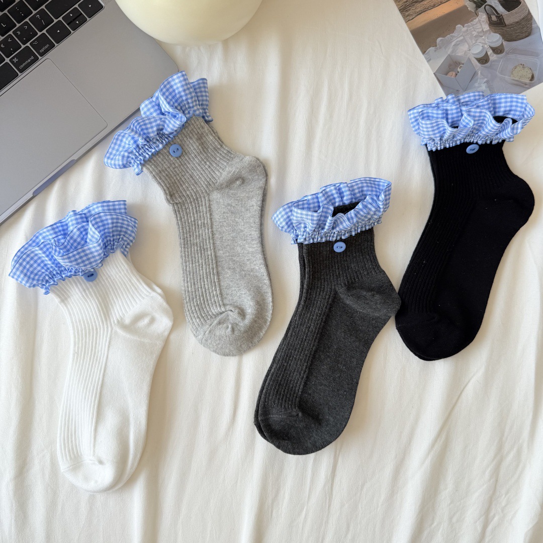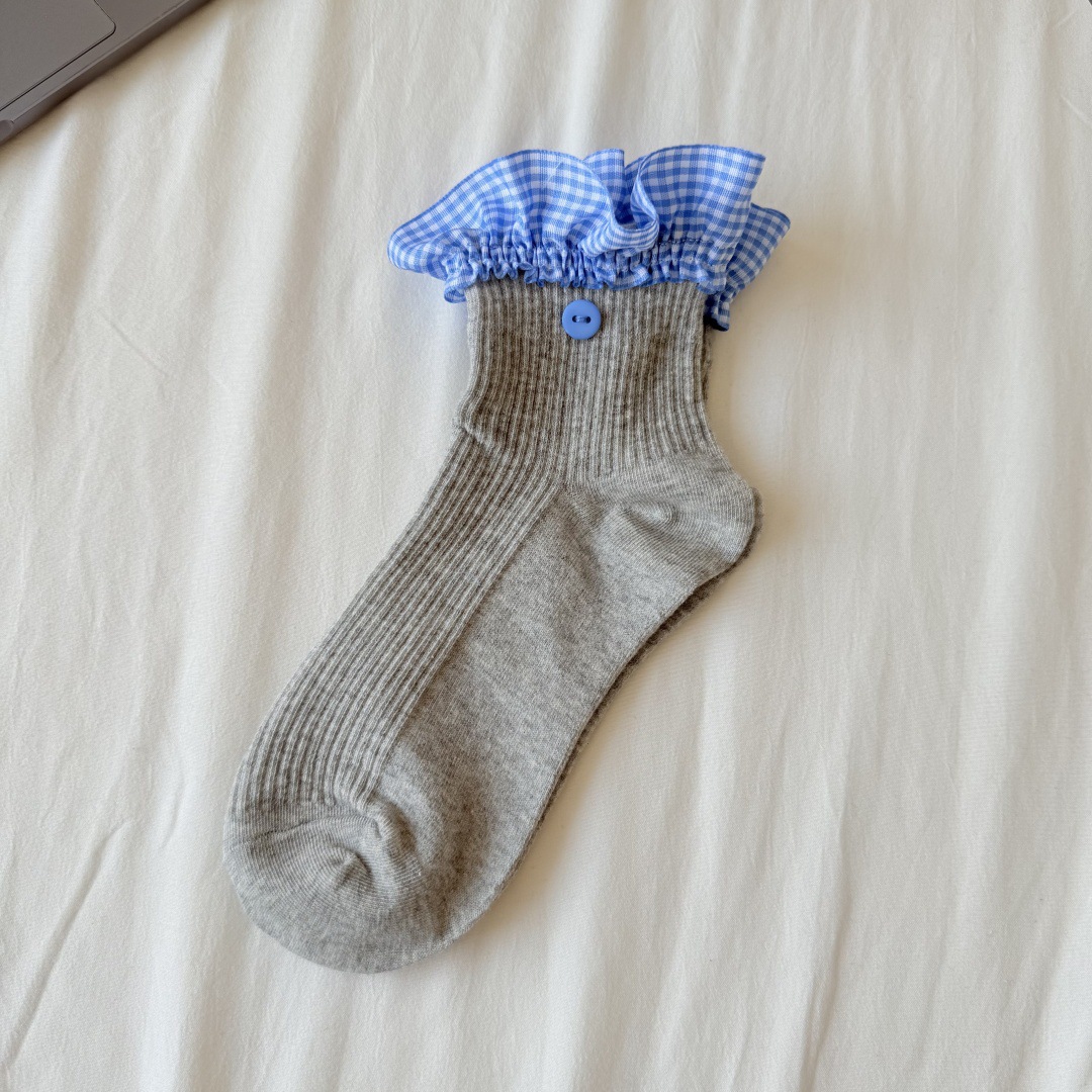 여름 짧은 튜브 여성 양말 귀여운 블루 체크 무늬 레이스 스커트 레이스 버튼 양말 JK 양말 여성 튜브 양말 여자 양말스토어 가기