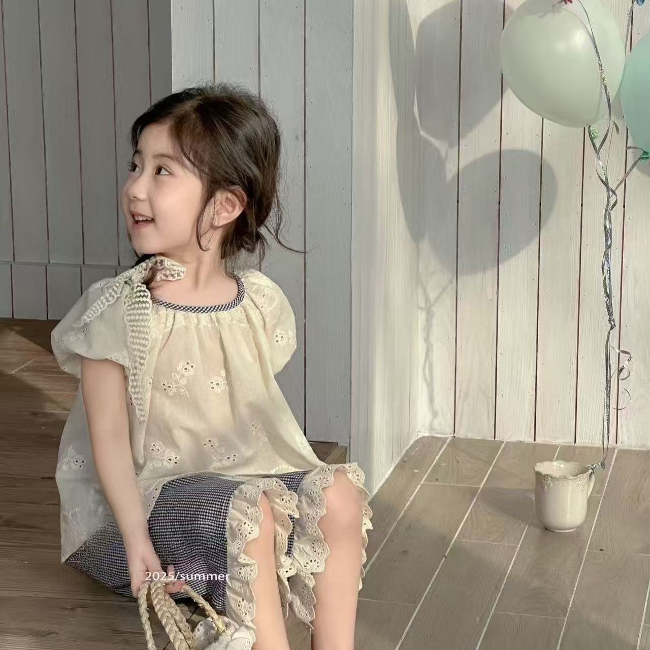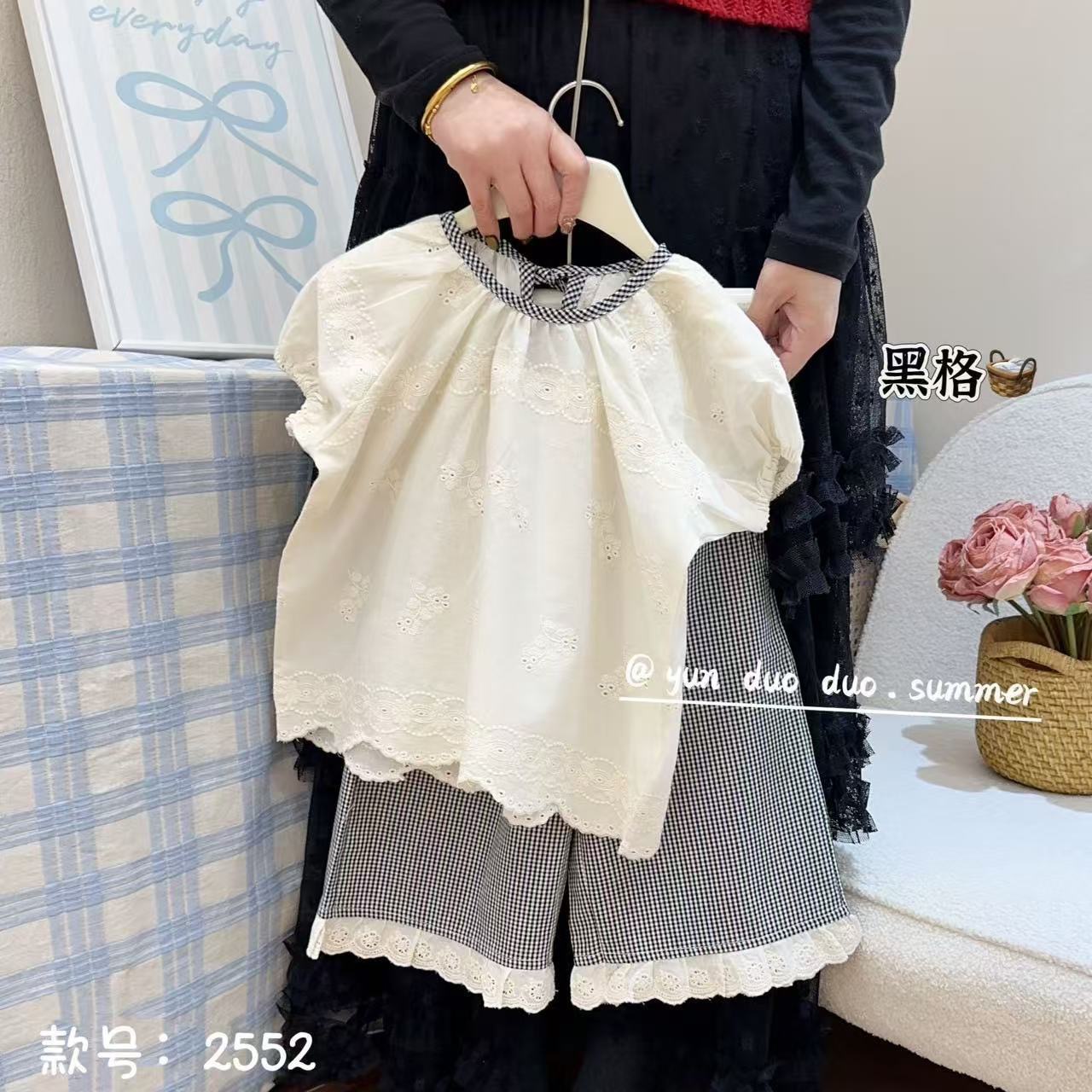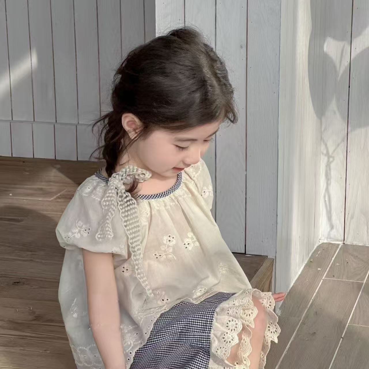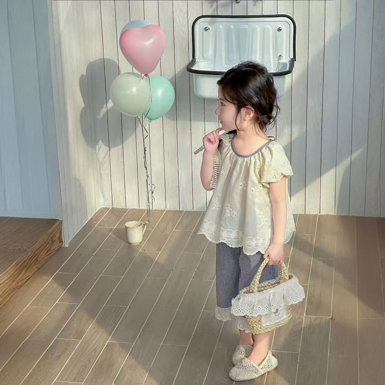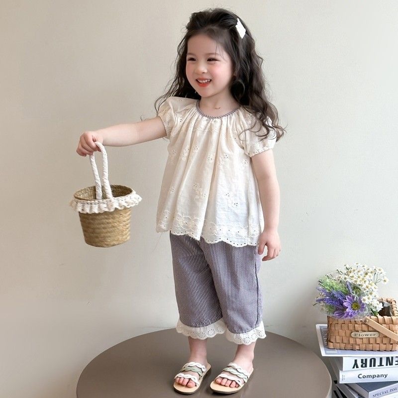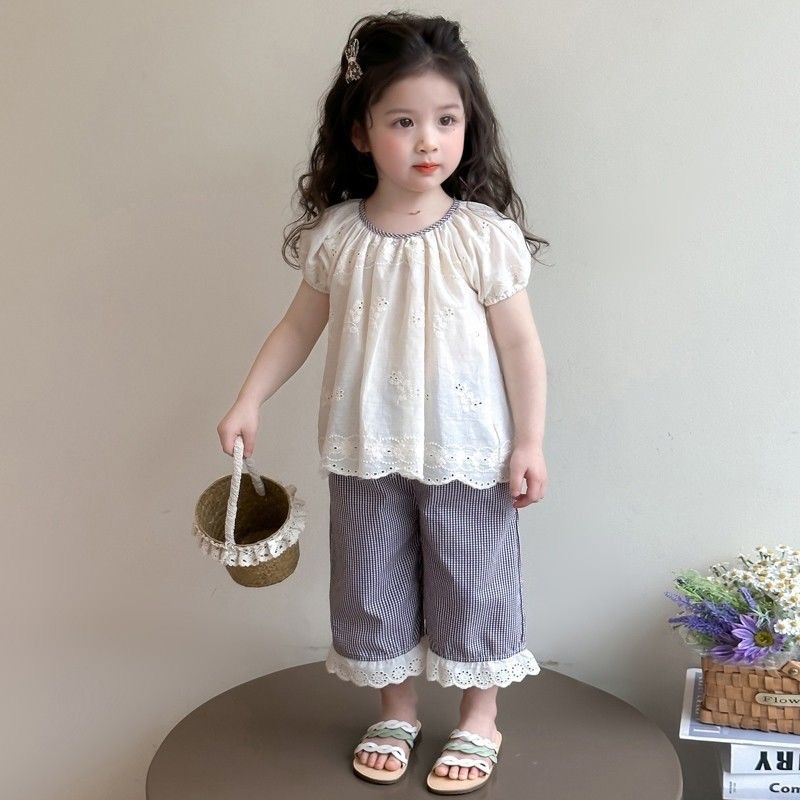 소녀 여름 세트 2025 새 소녀 할로우 반팔 레이스 셔츠 어린이 유료 바지 모리 투피스 세트스토어 가기
