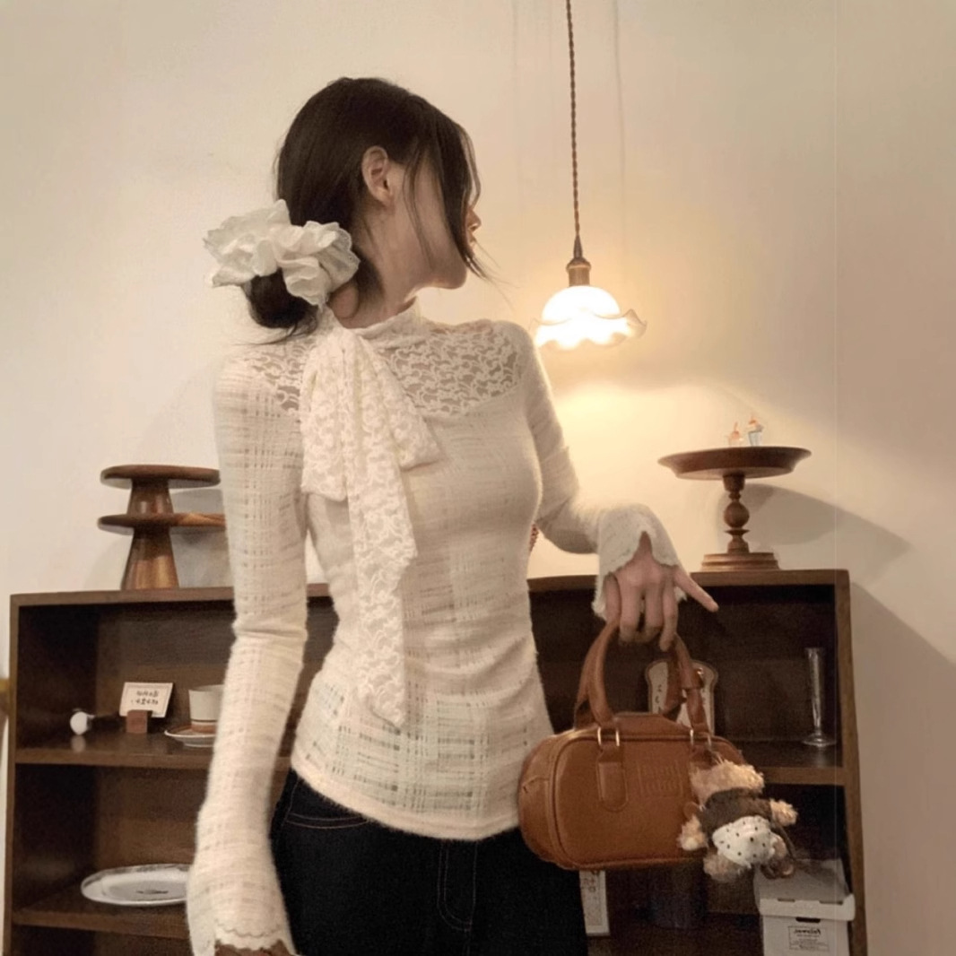플러스 사이즈 여성 순수한 욕망 스타일 보우 레이스 긴팔 티셔츠 2025 가을 새로운 뚱뚱한 MM 흰색 바닥 셔츠 탑