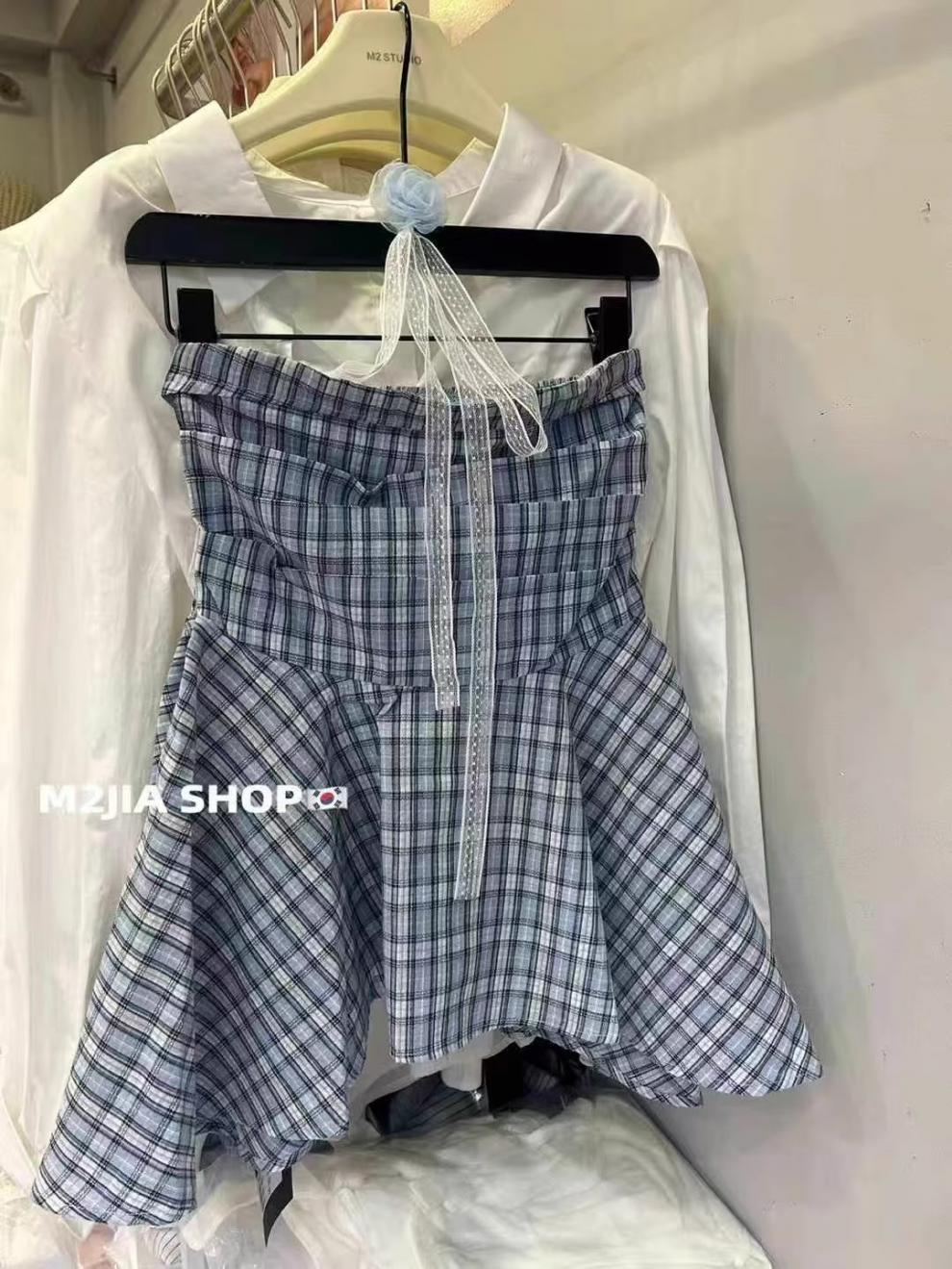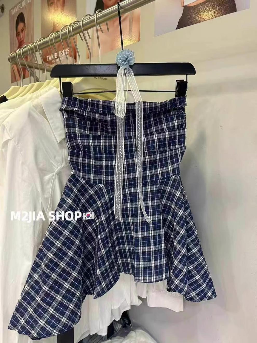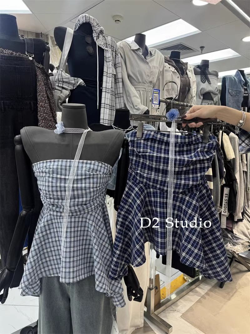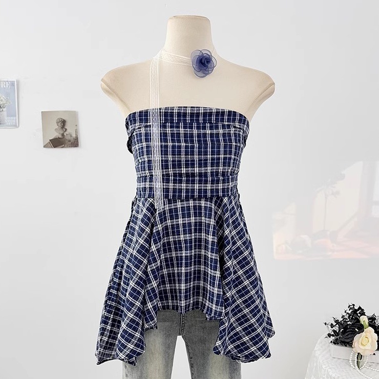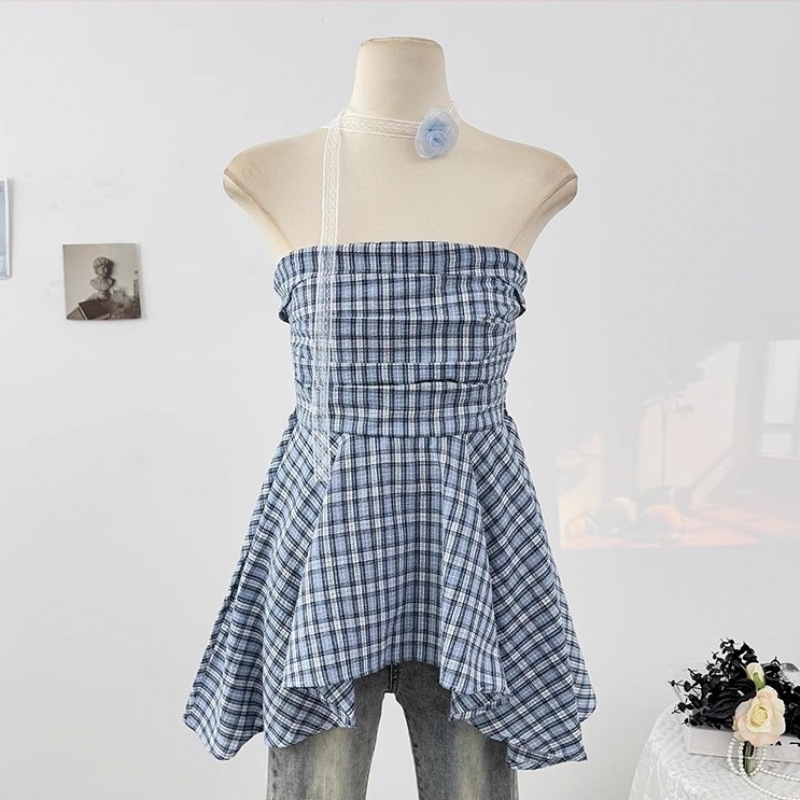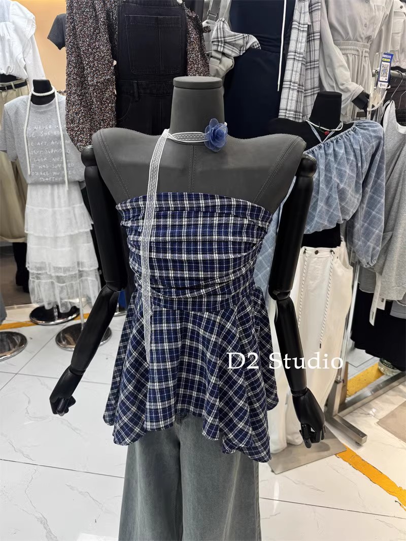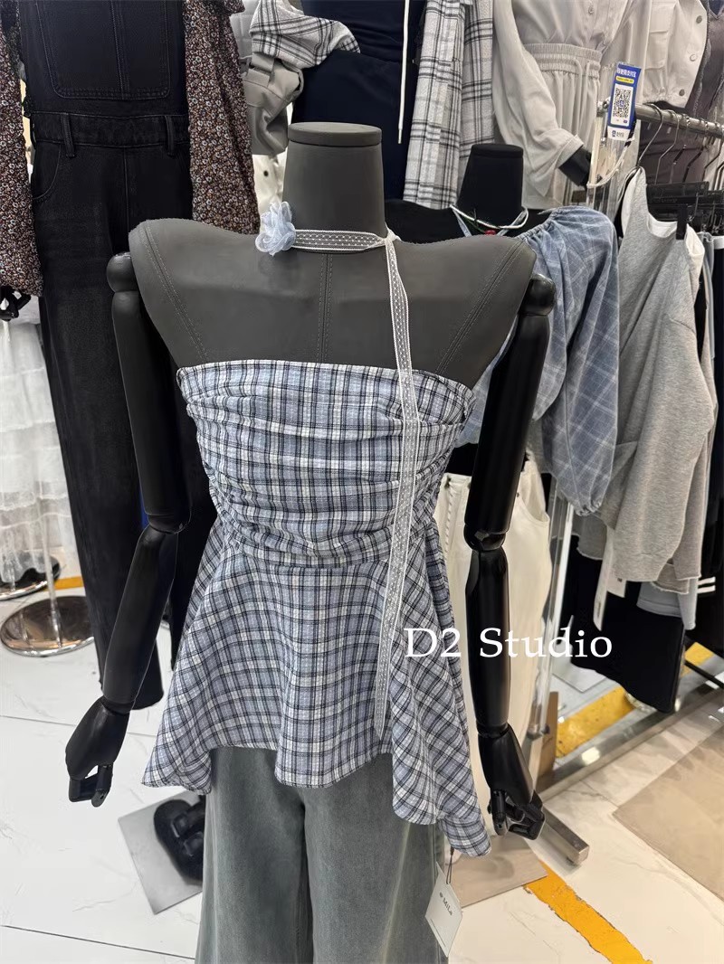 한국 스타일 2025 새로운 스타일 디자인 센스 레이스 플라워 스트랩 튜브 탑 패션 웨스턴 스타일 올 매치 체크 무늬 작은 셔츠스토어 가기