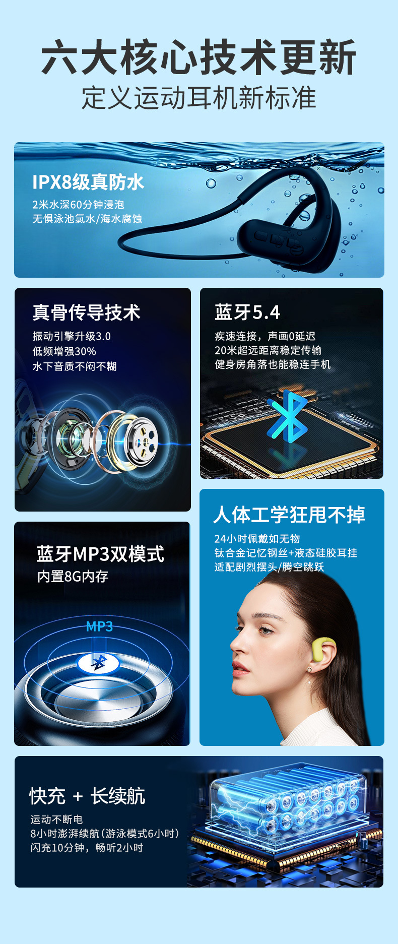 • 오션 블루(골전도 헤드폰 + IP8X 방수 + HIFI 음질 + 자기 고속 충전 + ENC 통화 소음 감소)