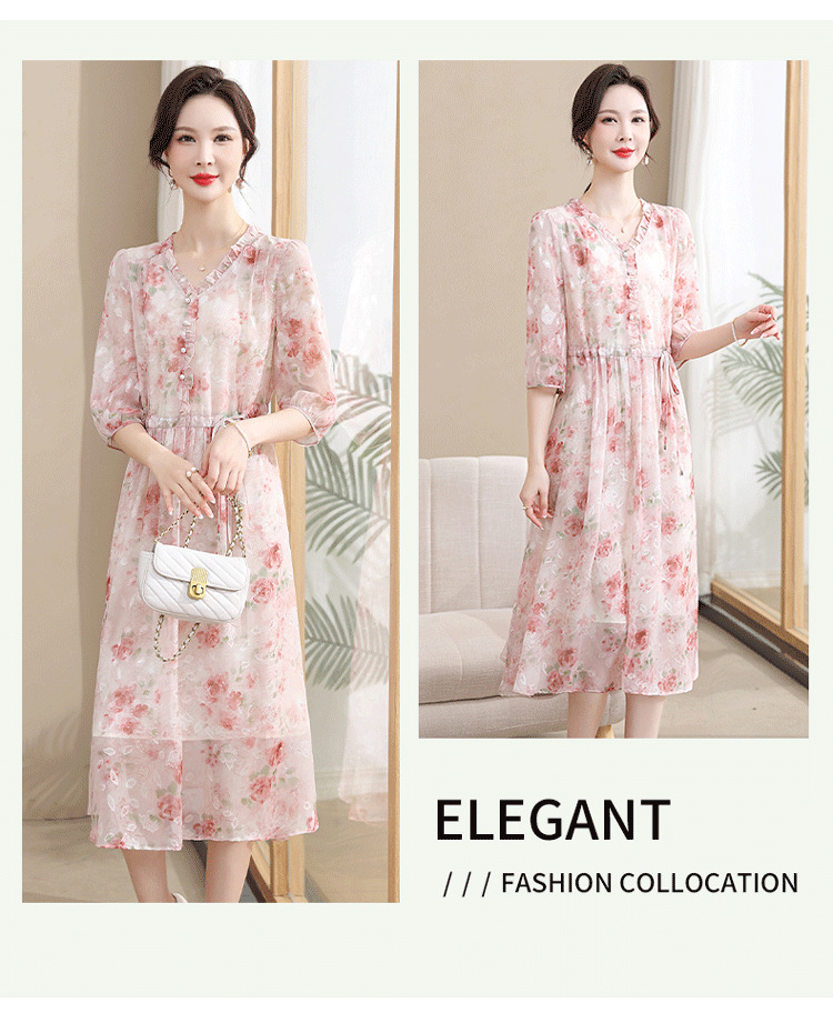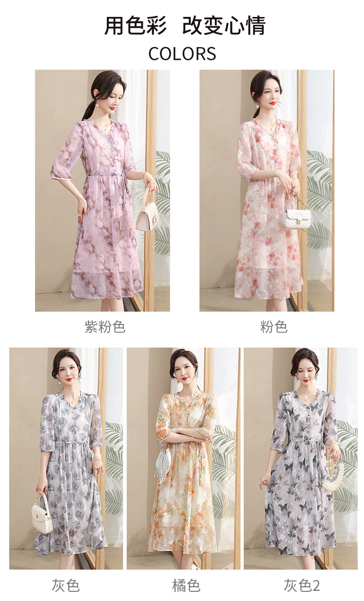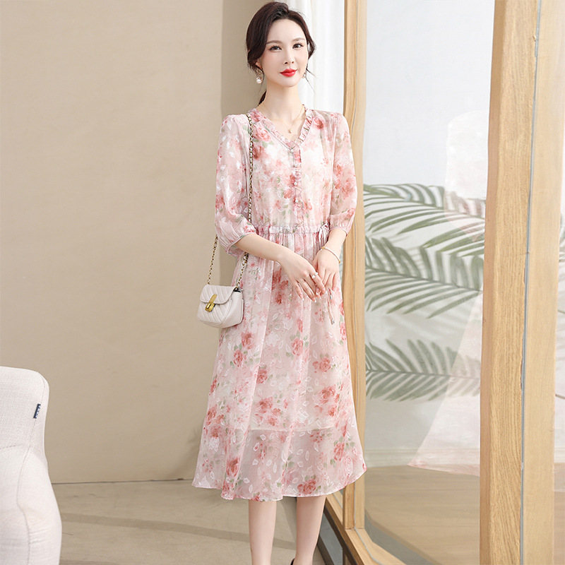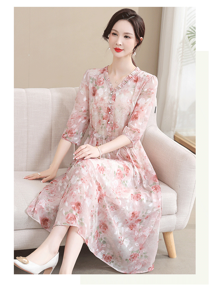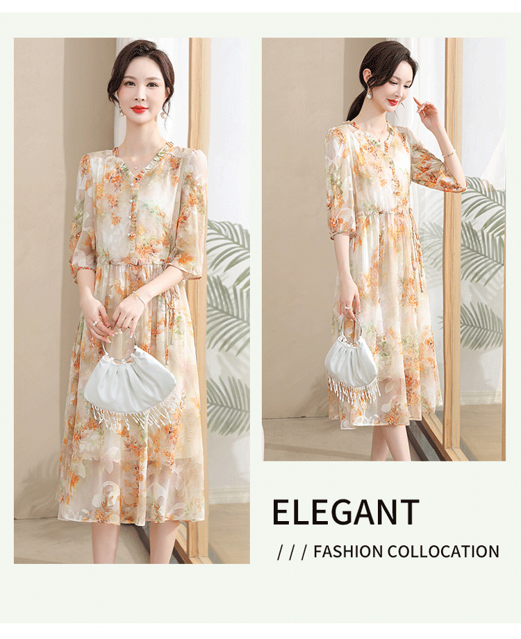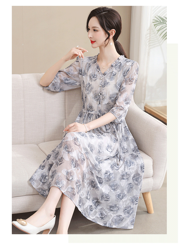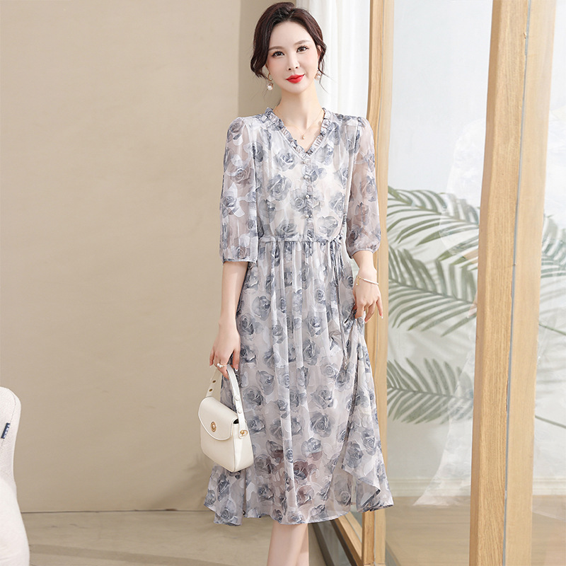 중년 엄마 하이 엔드 플로랄 V 넥 플로랄 스커트 여름 서양식 허리 슬리밍 실크 여성 원피스 뉴스토어 가기