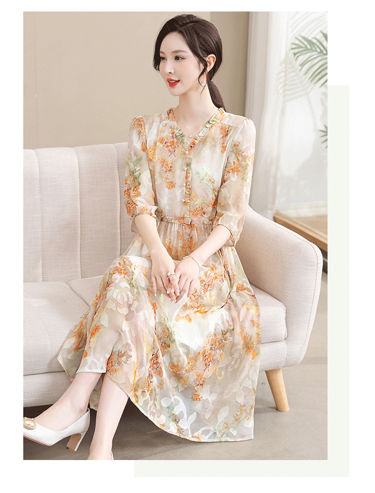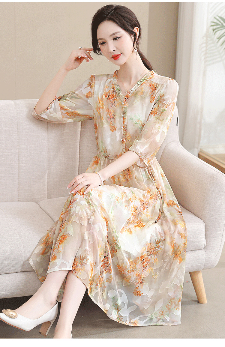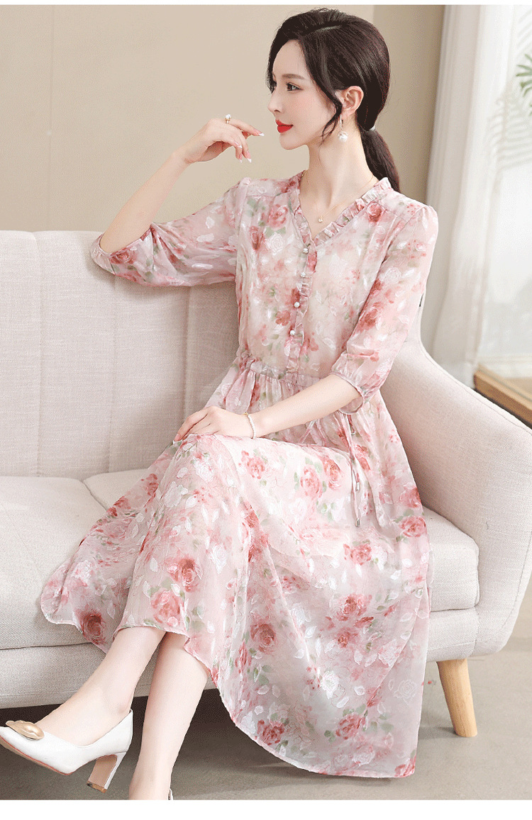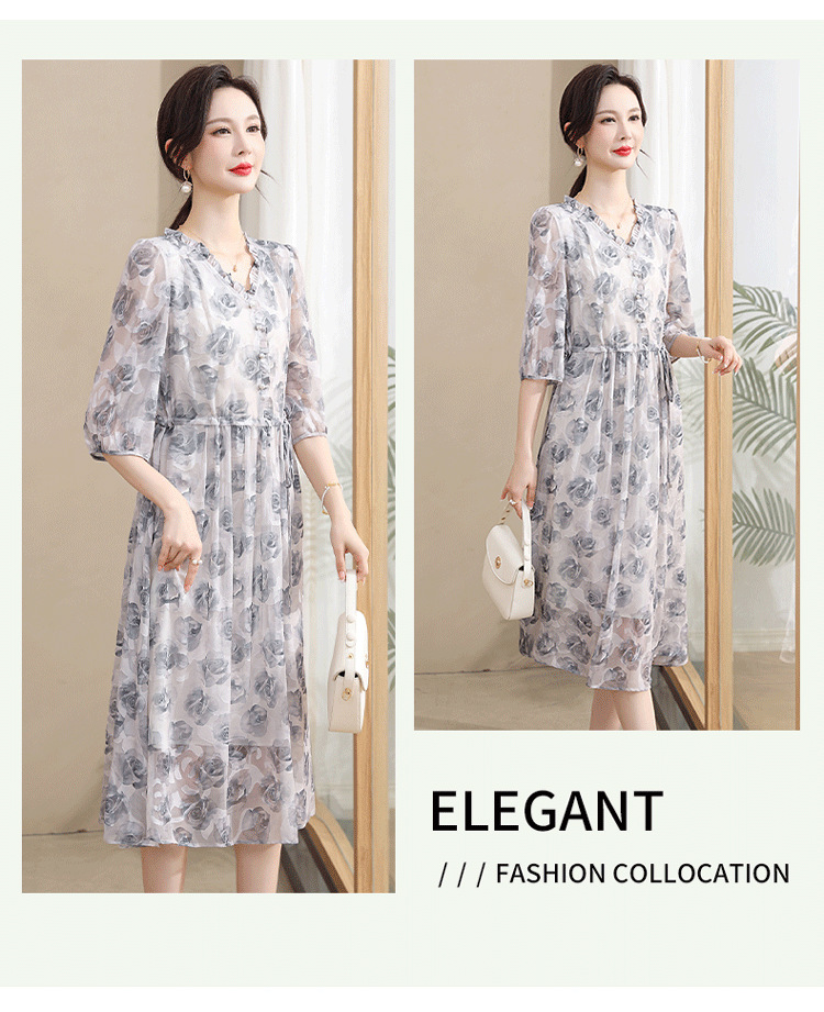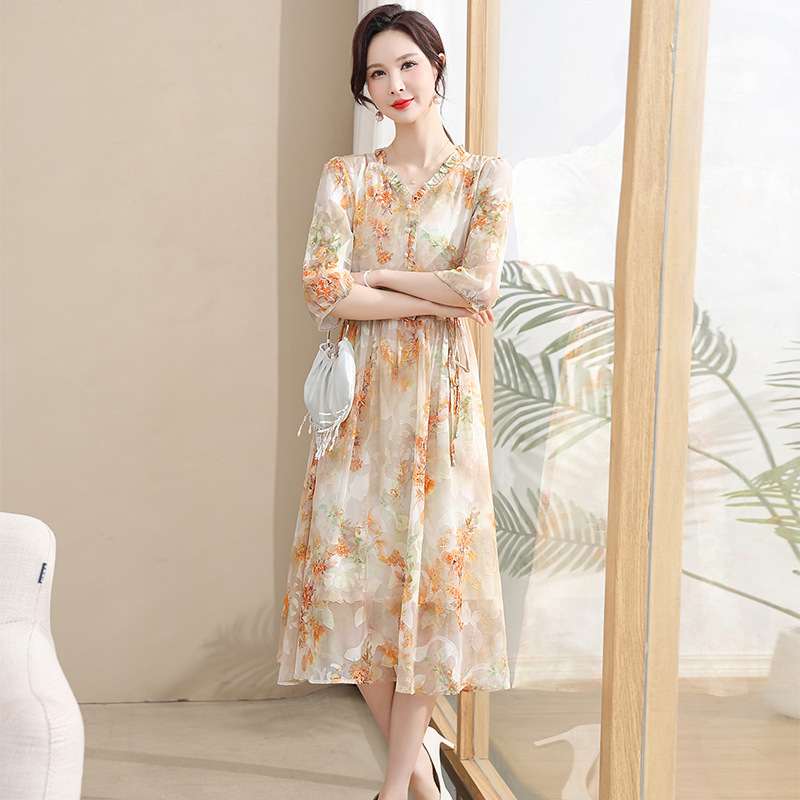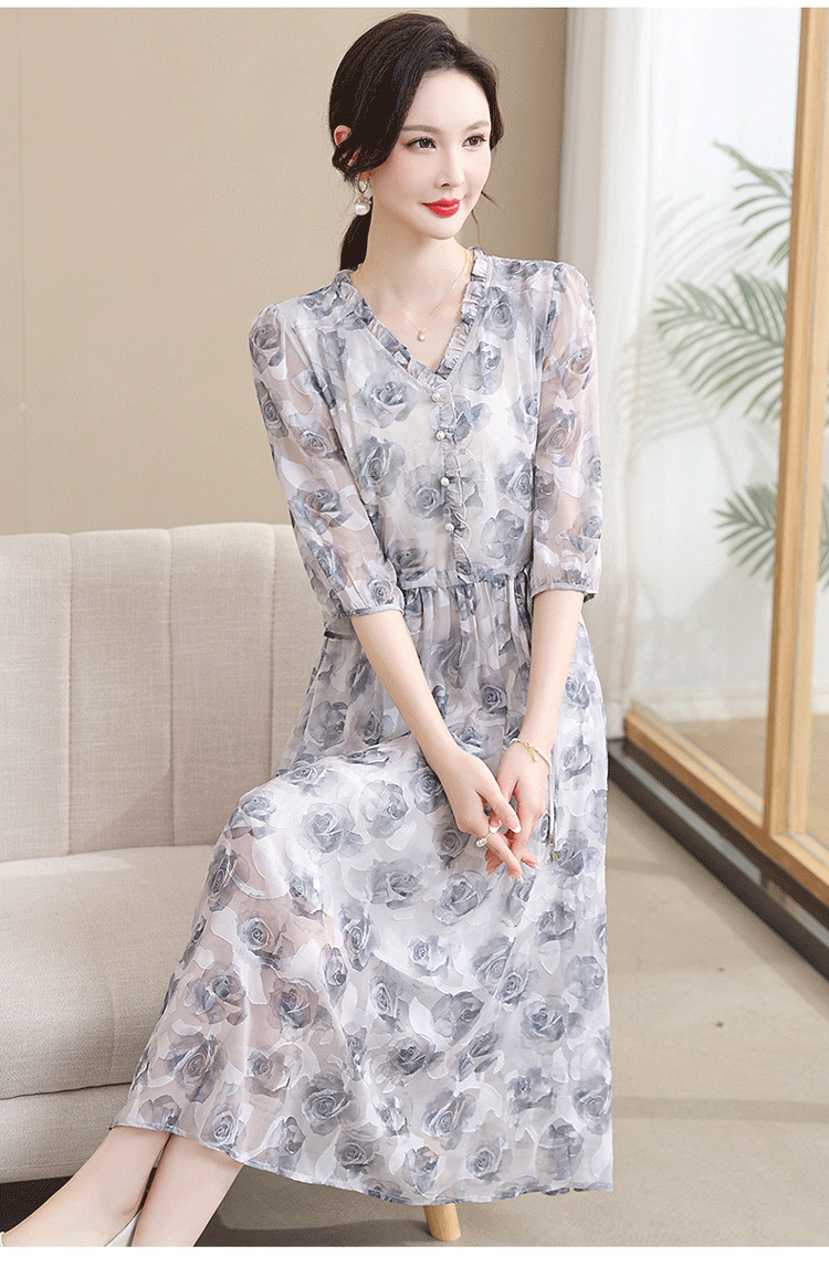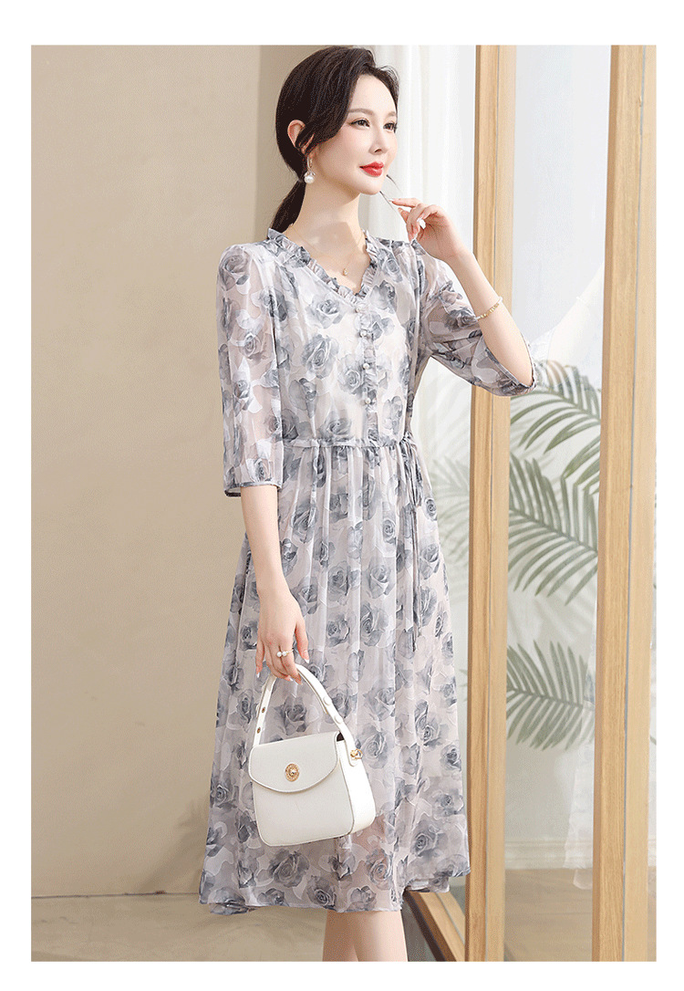 중년 엄마 하이 엔드 플로랄 V 넥 플로랄 스커트 여름 서양식 허리 슬리밍 실크 여성 원피스 뉴스토어 가기