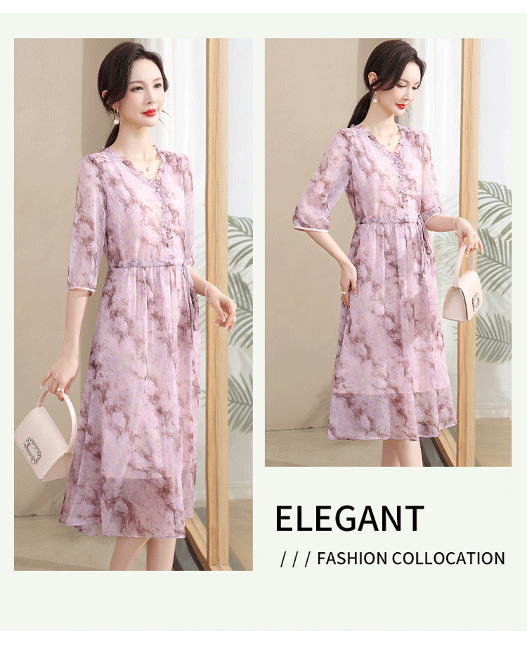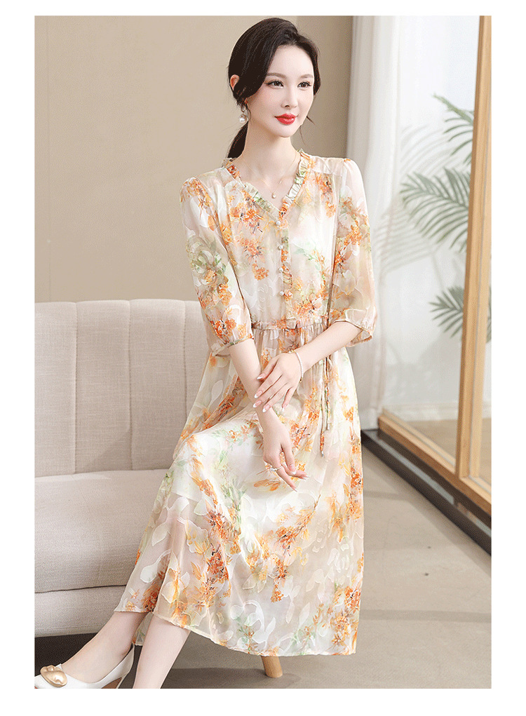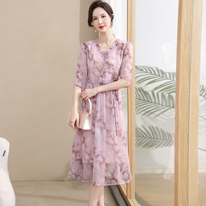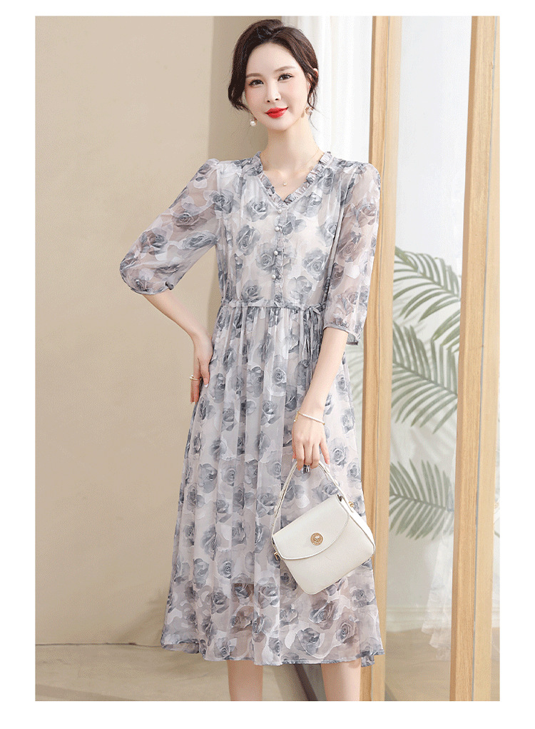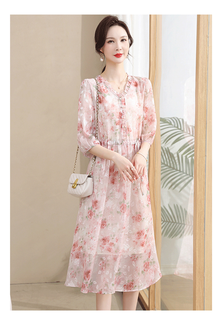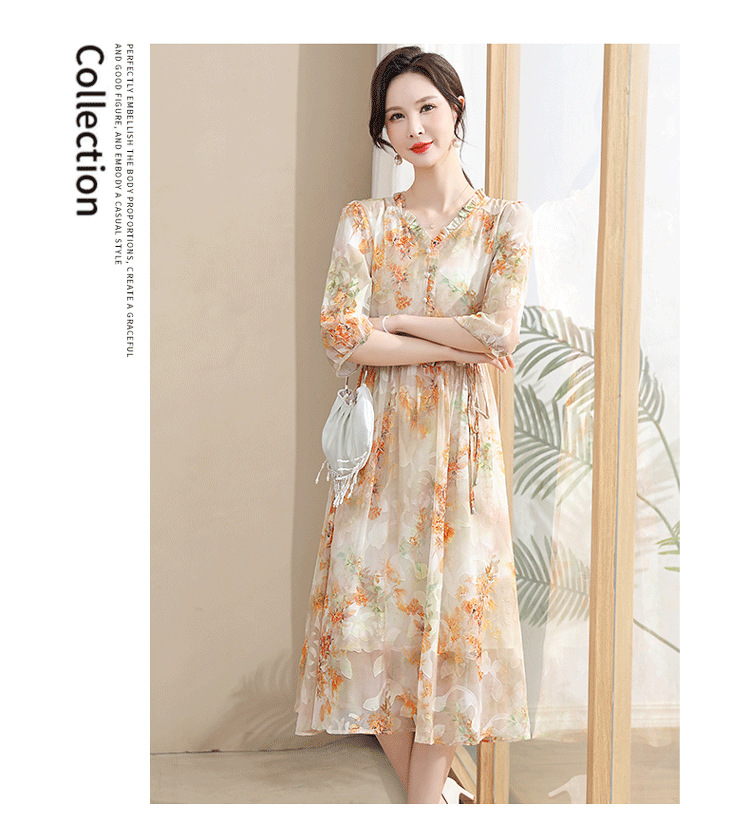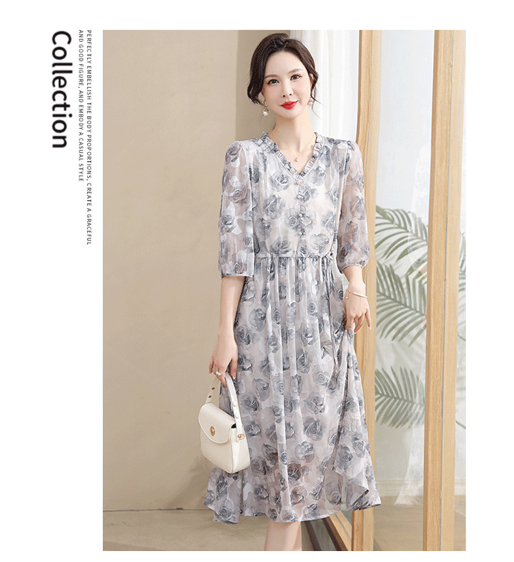 중년 엄마 하이 엔드 플로랄 V 넥 플로랄 스커트 여름 서양식 허리 슬리밍 실크 여성 원피스 뉴스토어 가기