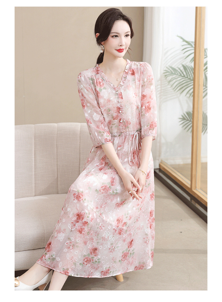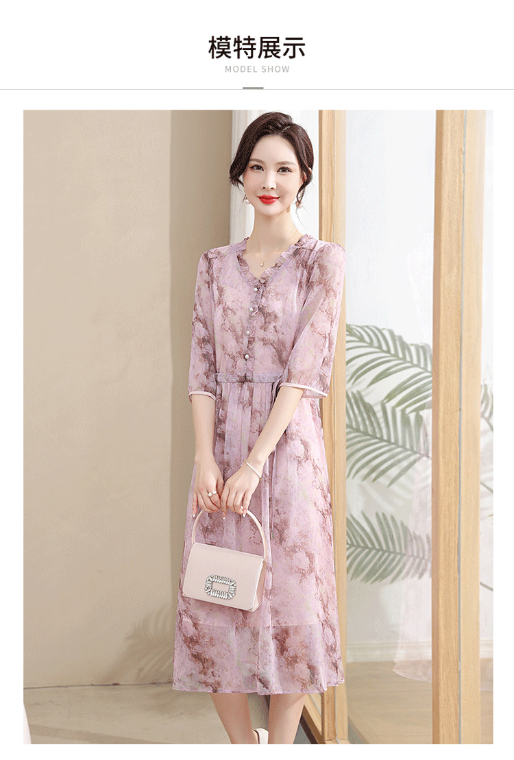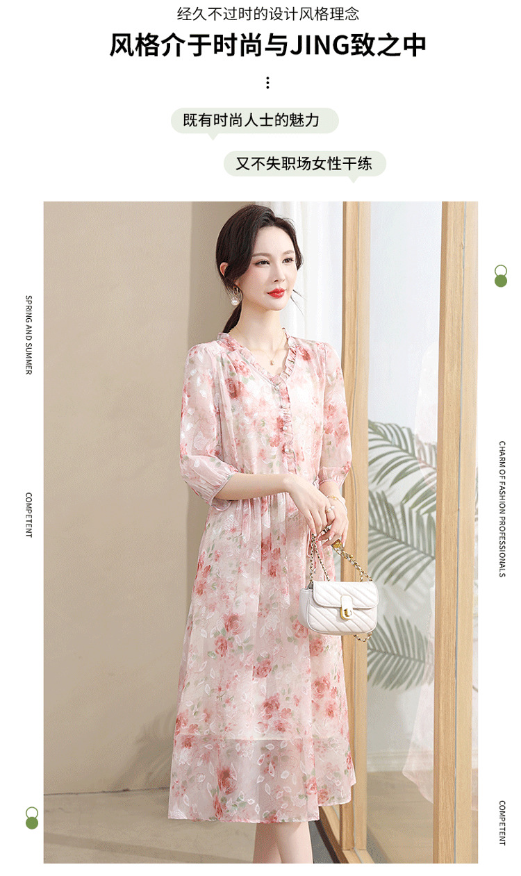 중년 엄마 하이 엔드 플로랄 V 넥 플로랄 스커트 여름 서양식 허리 슬리밍 실크 여성 원피스 뉴