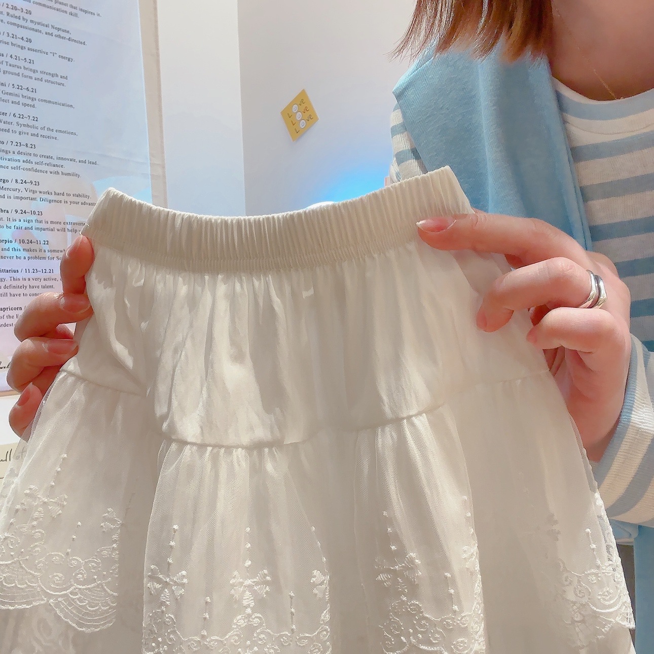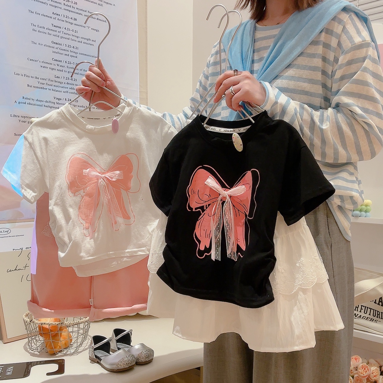 소녀의 케이크 치마 세트 2025 여름 새로운 인쇄 티셔츠 중간 길이 레이스 슈퍼 요정 케이크 스커트 투피스 세트