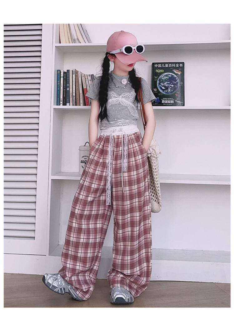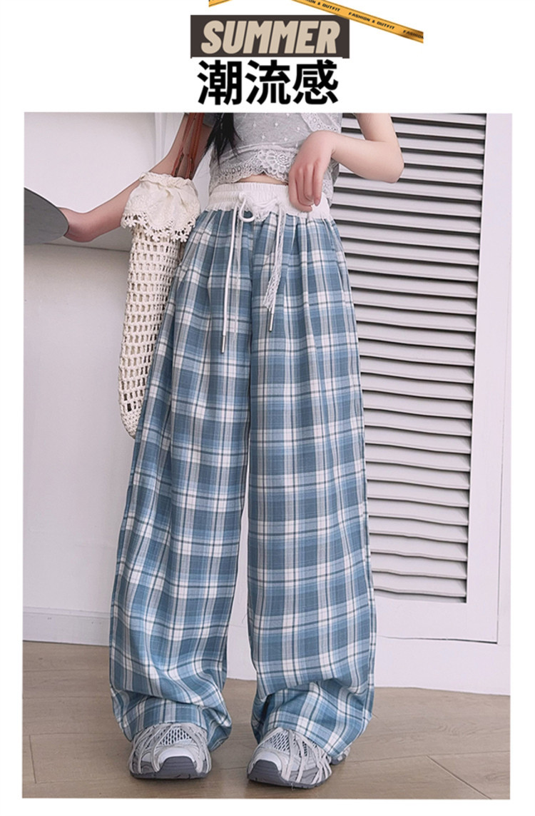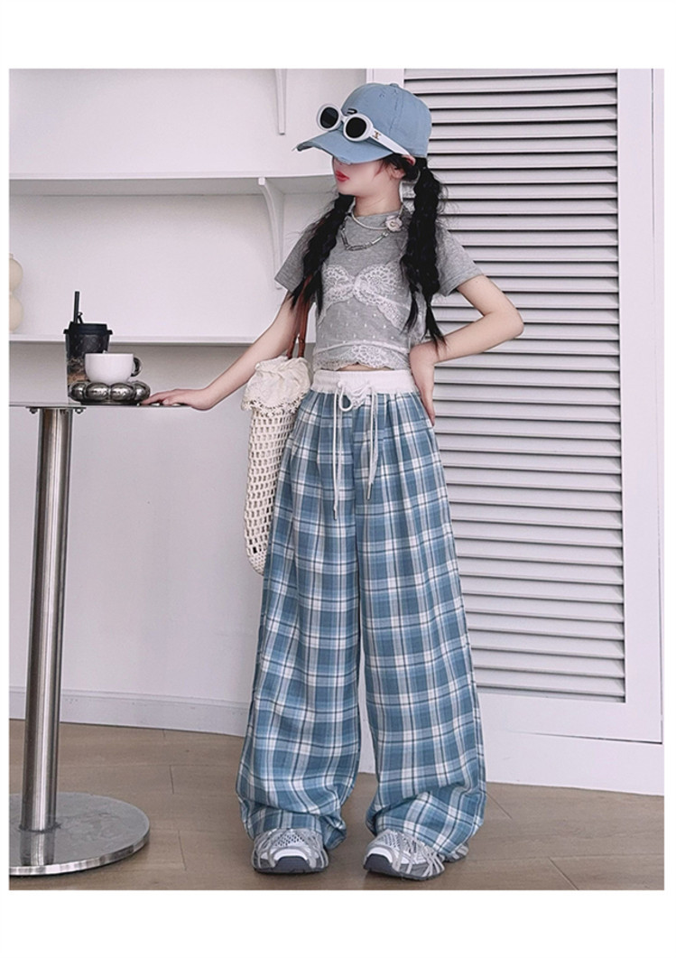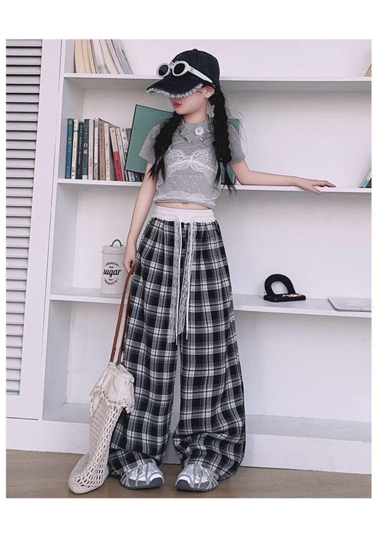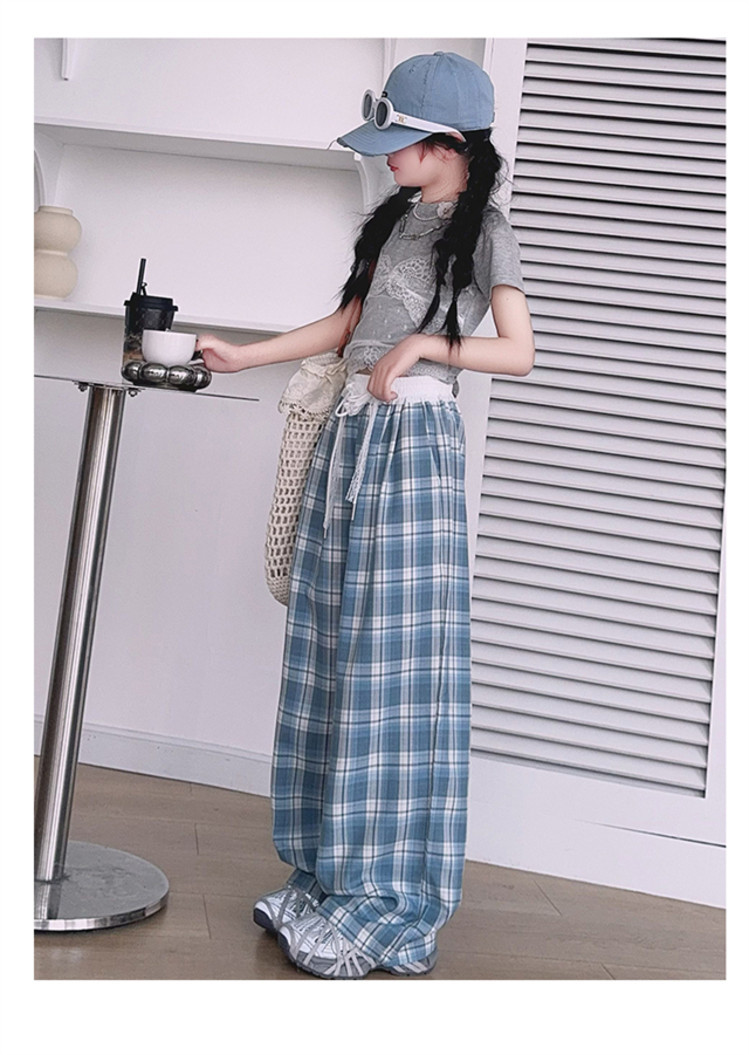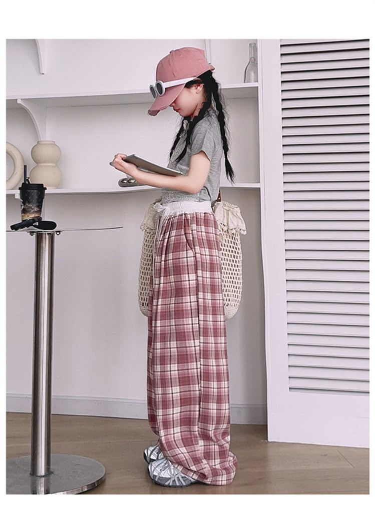 소녀의 봄과 여름 바지 2025 새로운 도착 중대형 어린이 격자 무늬 느슨한 넓은 다리 바지 유행 세련된 와이드 다리 바지스토어 가기