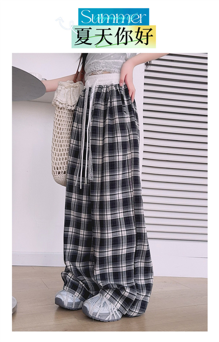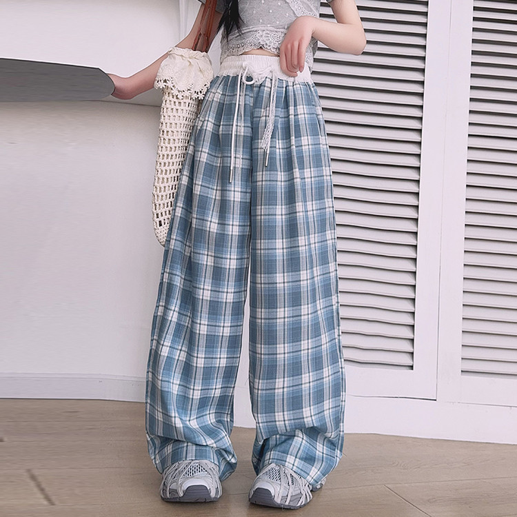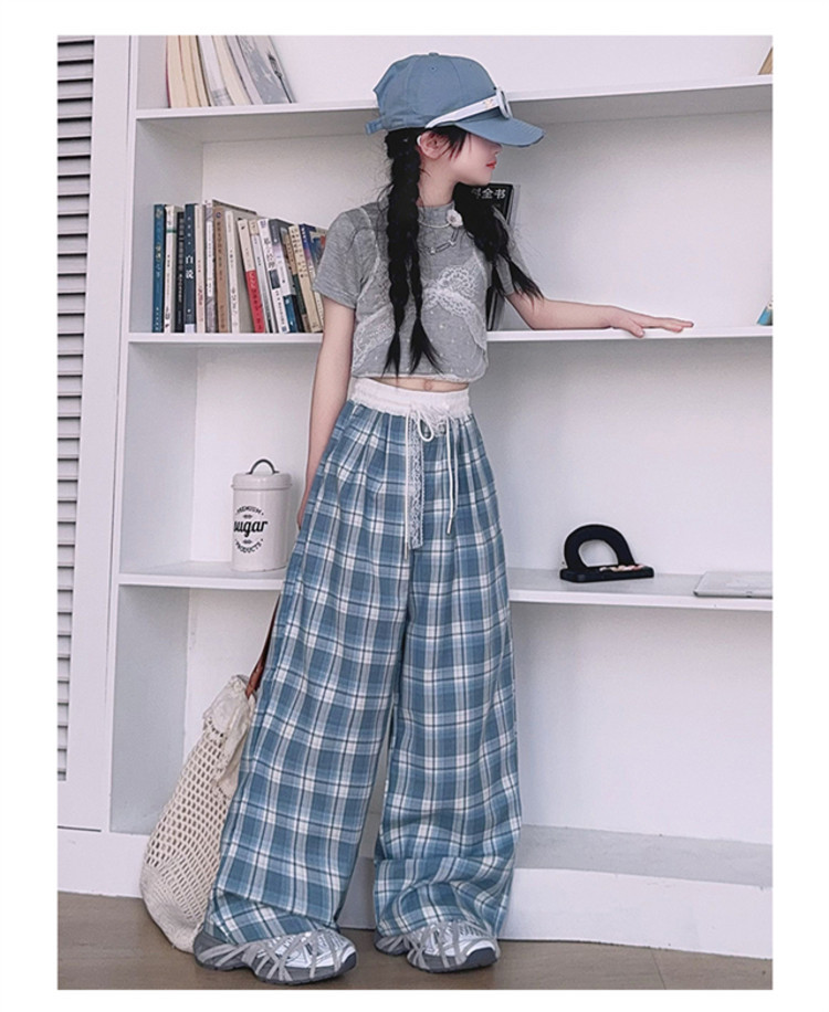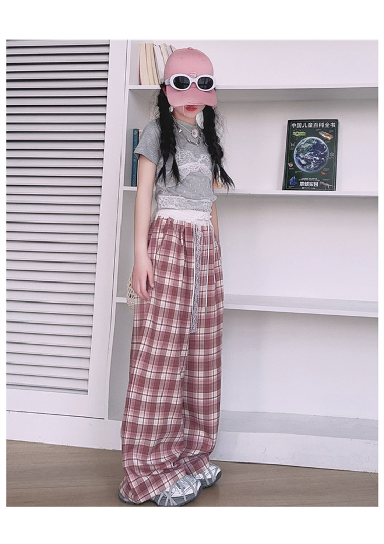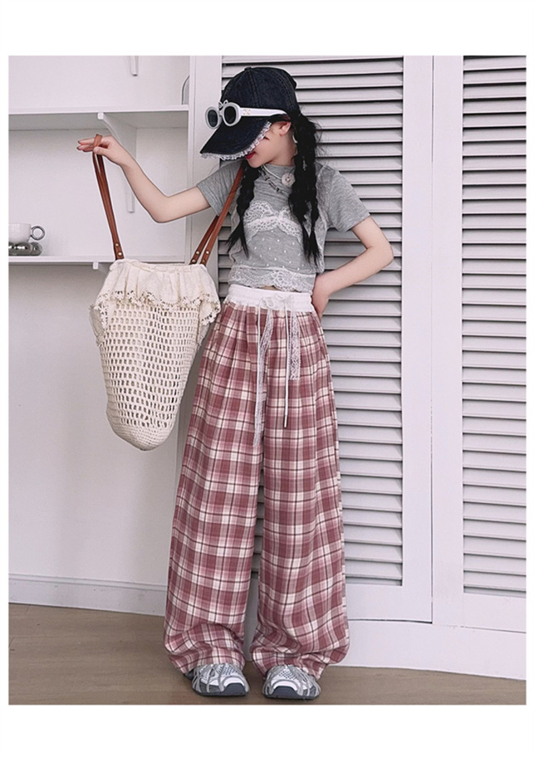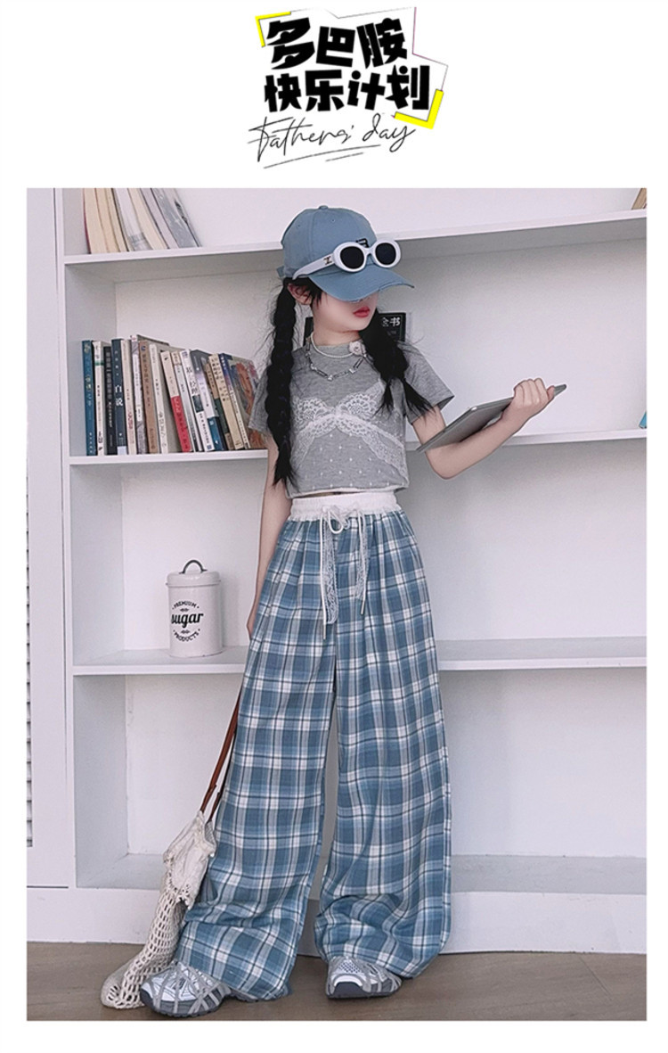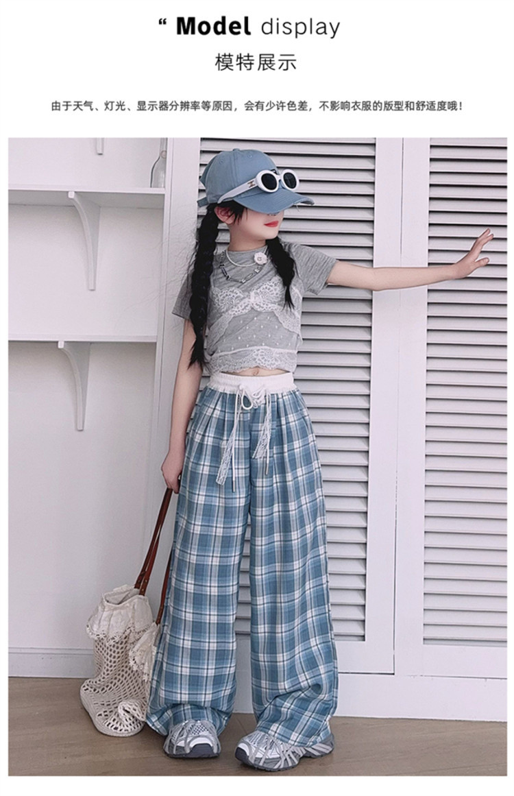 소녀의 봄과 여름 바지 2025 새로운 도착 중대형 어린이 격자 무늬 느슨한 넓은 다리 바지 유행 세련된 와이드 다리 바지스토어 가기