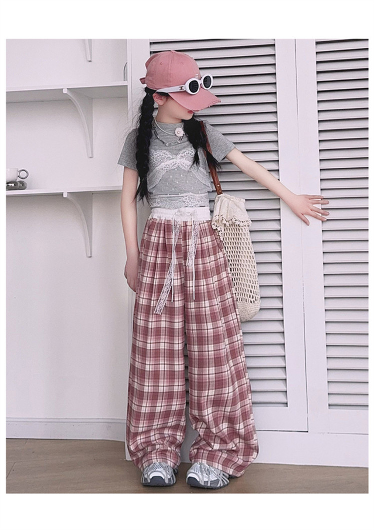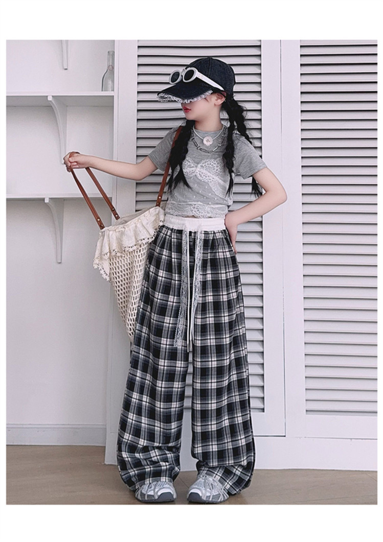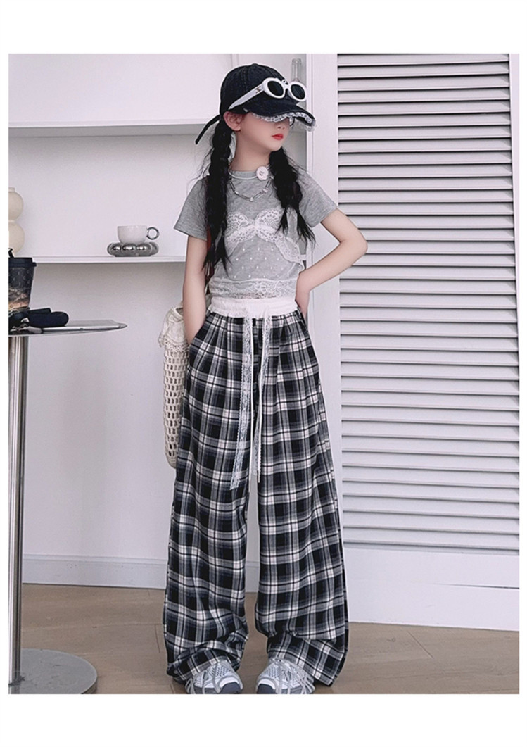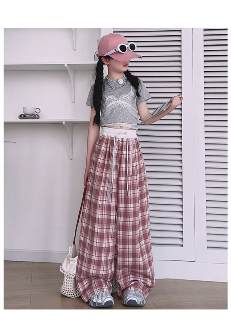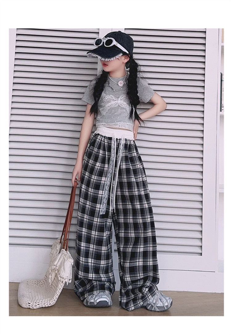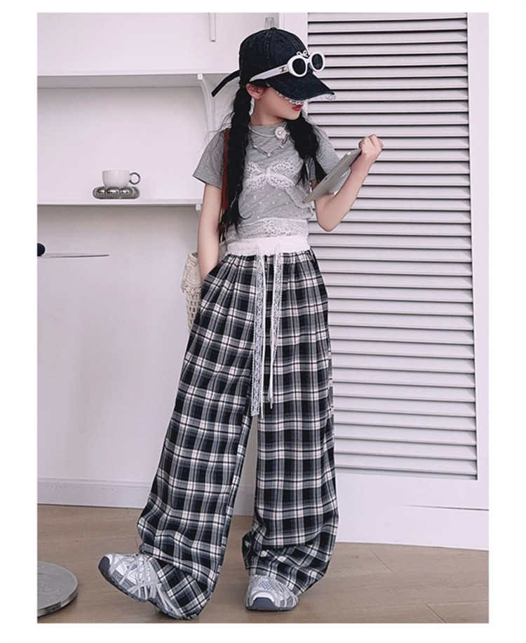 소녀의 봄과 여름 바지 2025 새로운 도착 중대형 어린이 격자 무늬 느슨한 넓은 다리 바지 유행 세련된 와이드 다리 바지
