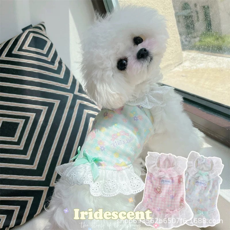 애완 동물 고양이와 개 테디 포메라니안 비숑 의류 봄과 여름 가정 의류 레이스 격자 무늬 얇은 활 공주 드레스스토어 가기