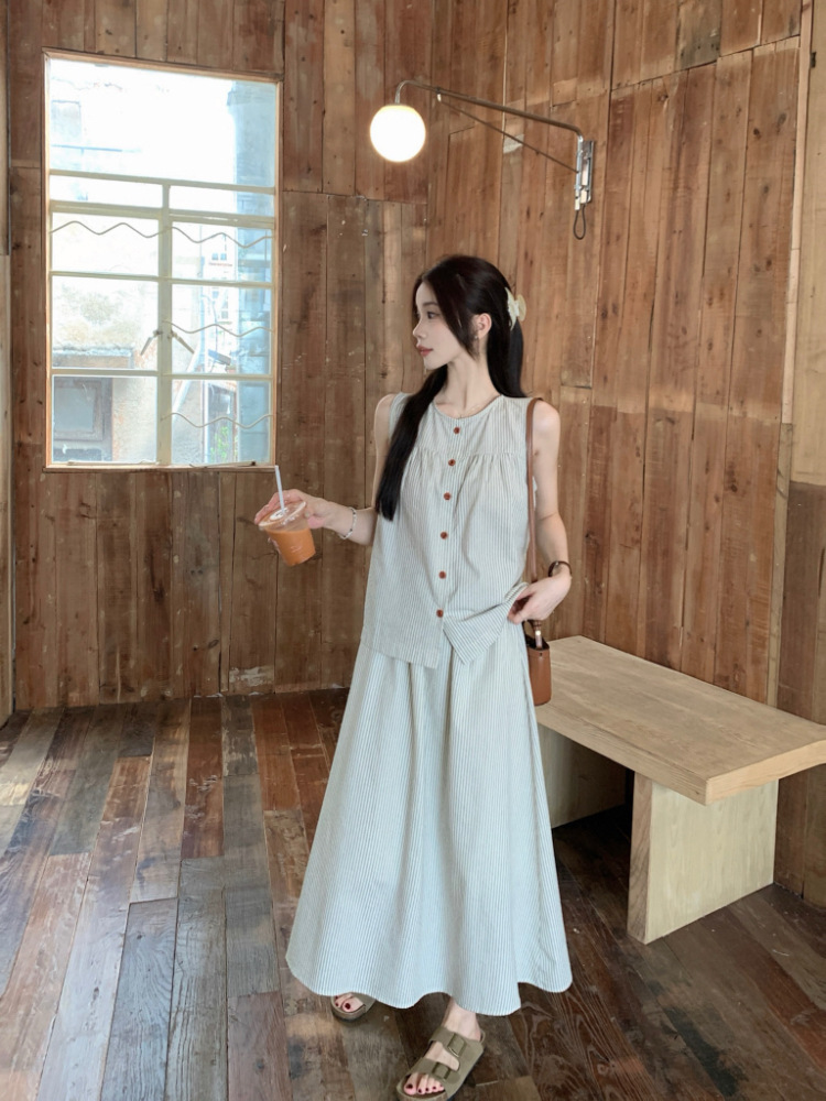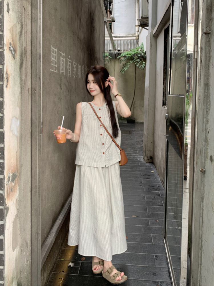 간단한 캐주얼 세트 여자 2025 여름 새로운 슬랙 스트라이프 민소매 조끼 A 라인 스커트 투피스 세트