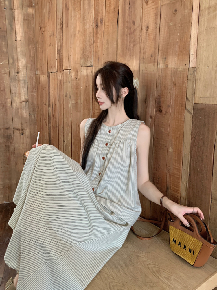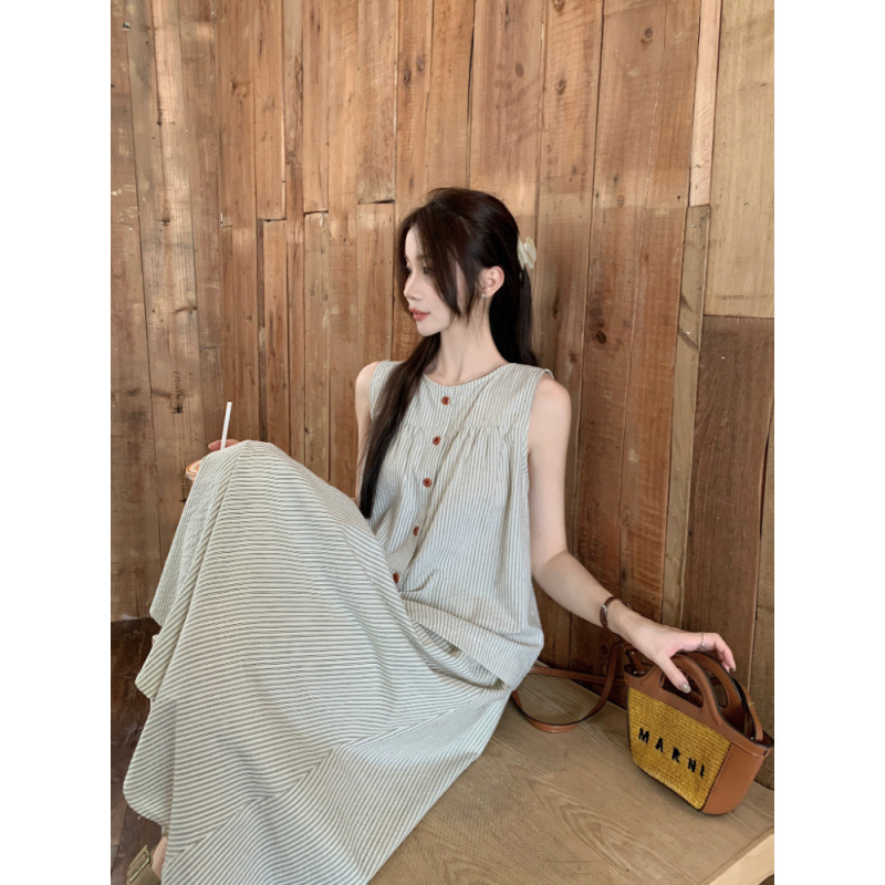 간단한 캐주얼 세트 여자 2025 여름 새로운 슬랙 스트라이프 민소매 조끼 A 라인 스커트 투피스 세트스토어 가기