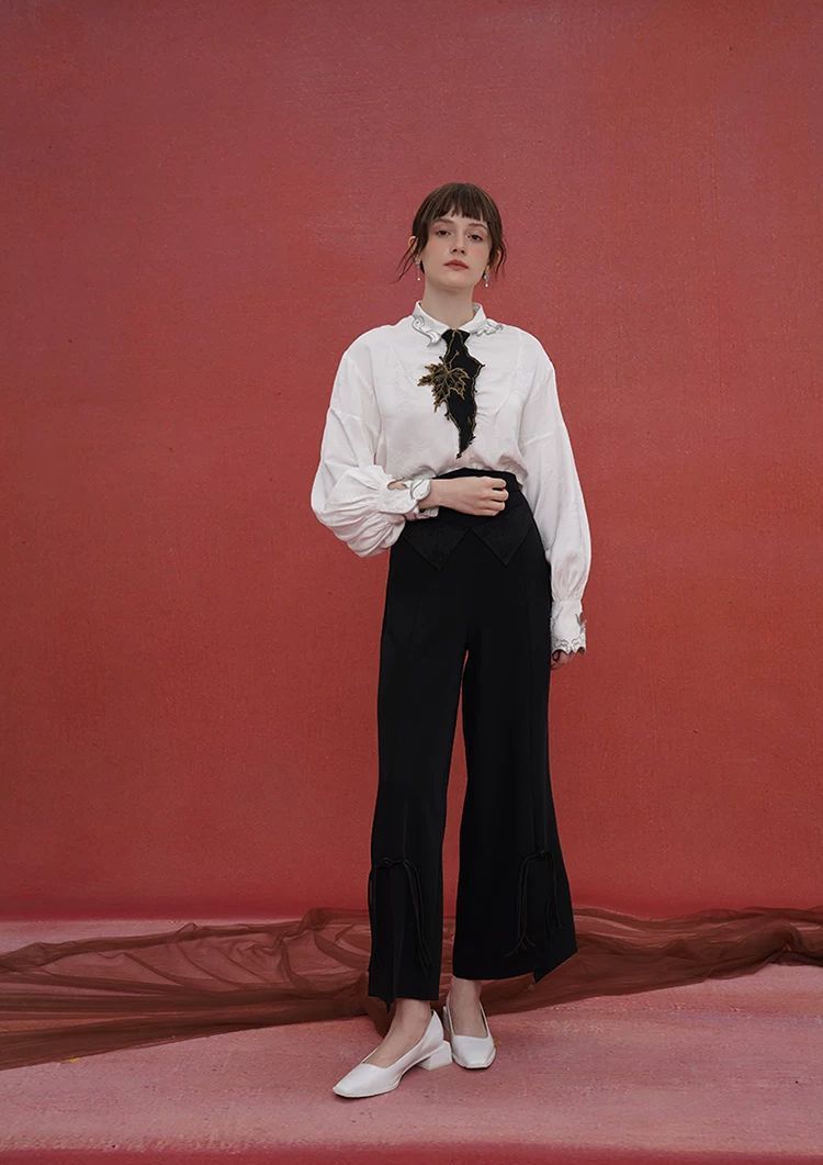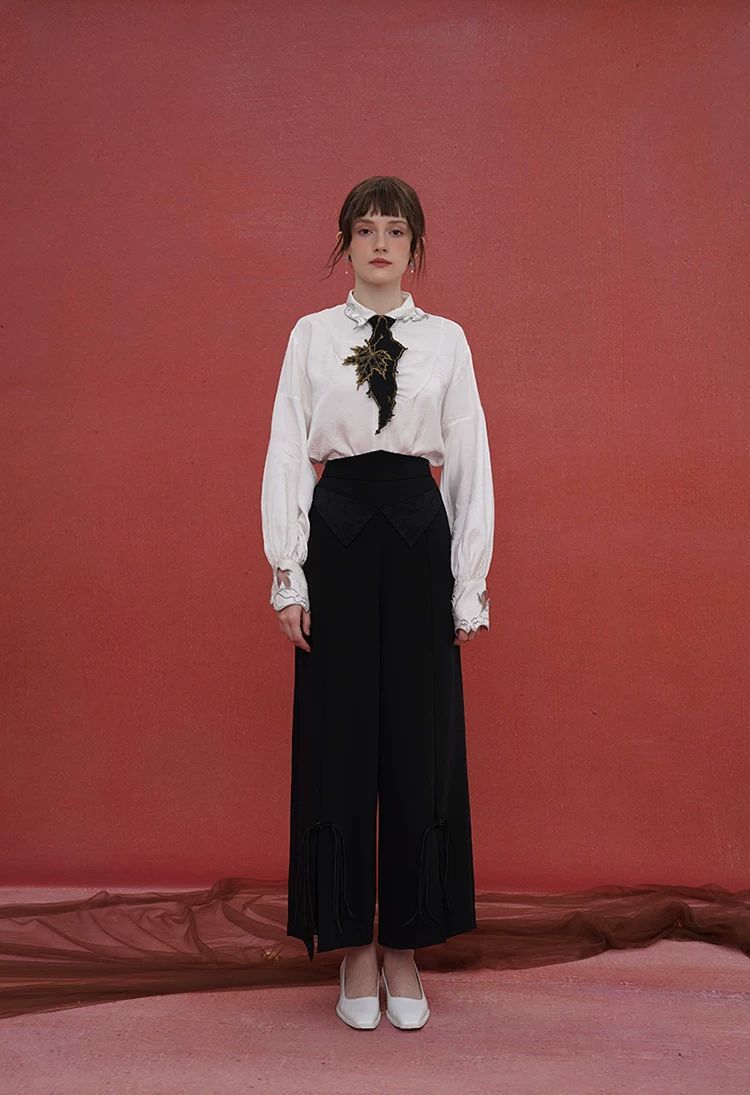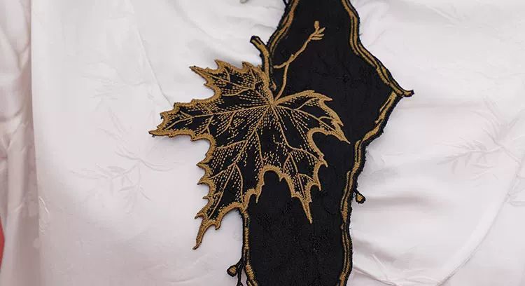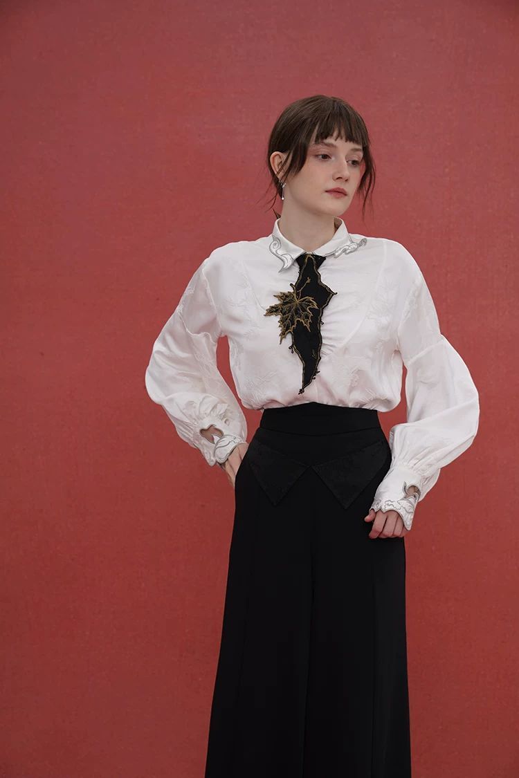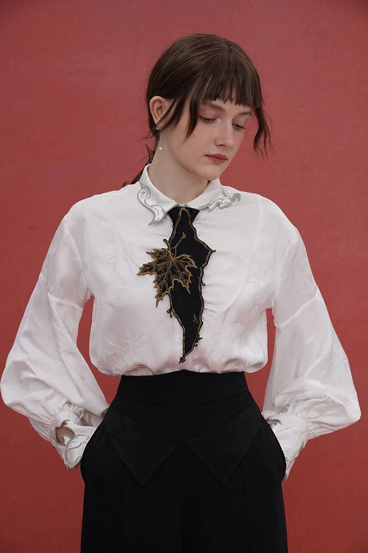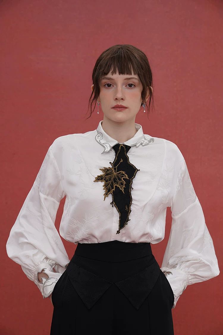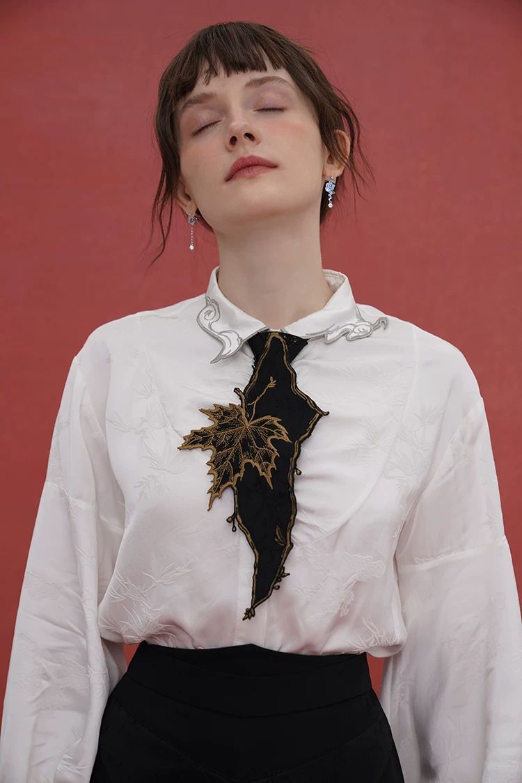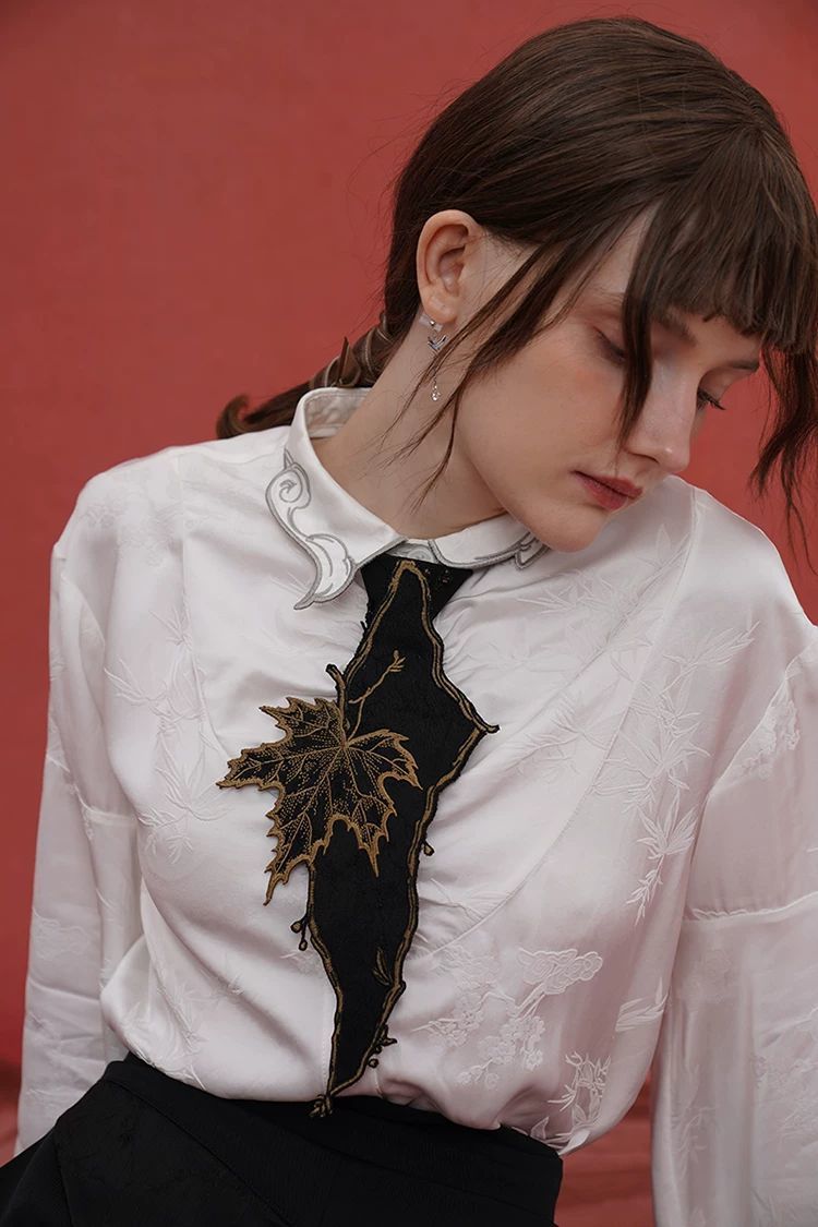 여성을 위한 오리지널 복고풍 중국 스타일 자수 셔츠 넥타이, 캐주얼하고 매우 아름다운 가을 단풍 낙엽 틈새 시장