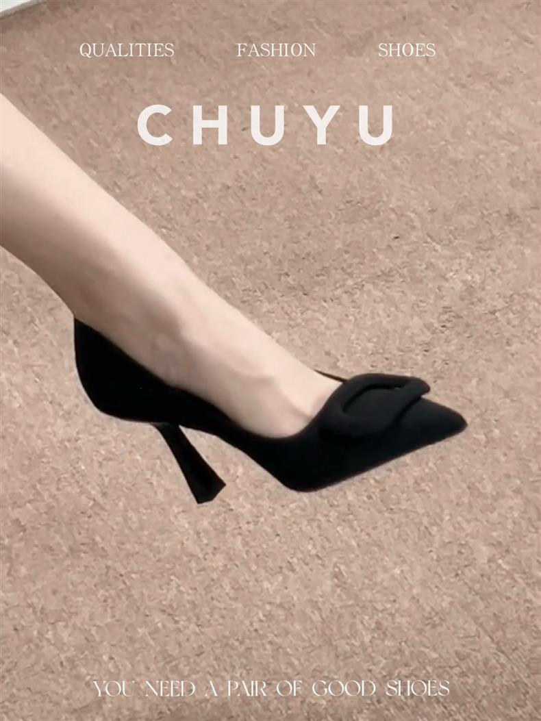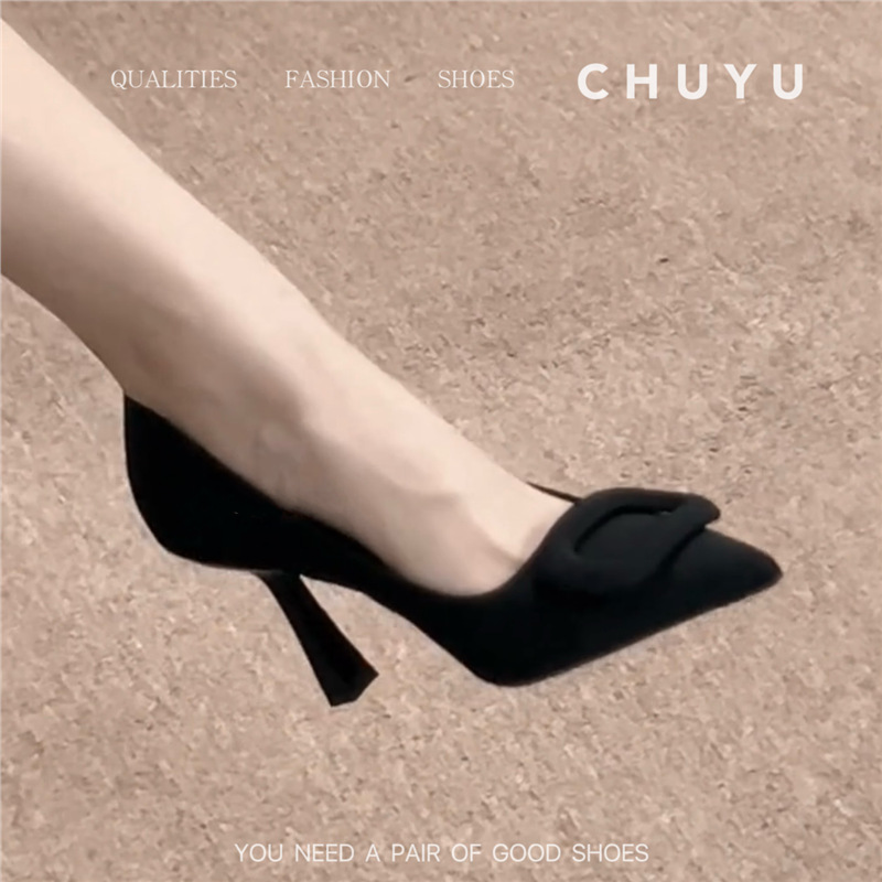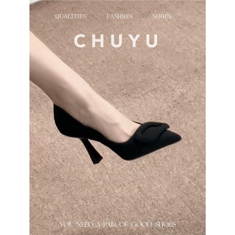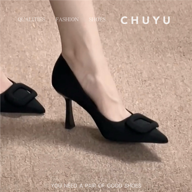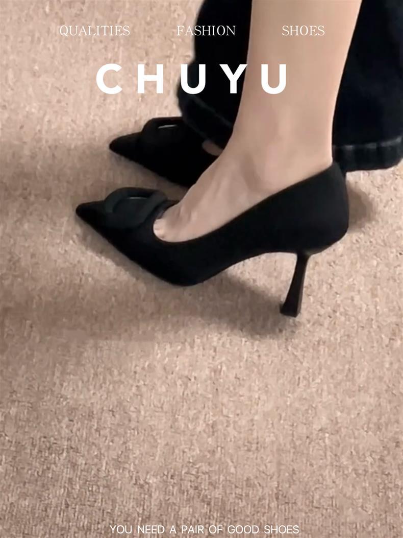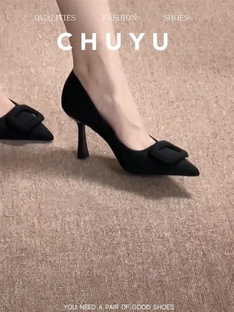 프랑스 뾰족한 발가락 블랙 스퀘어 버클 하이힐 여성 스틸레토 힐 2025 새로운 스타일 전문 얕은 입 OL 스타일 싱글 레이어 신발 우아한 올매치스토어 가기