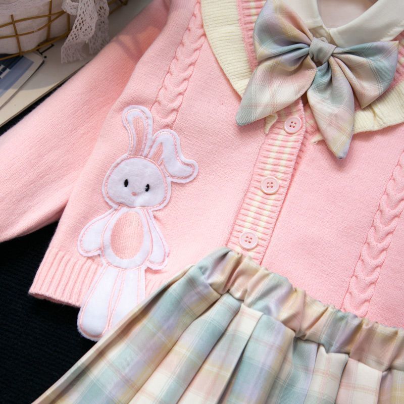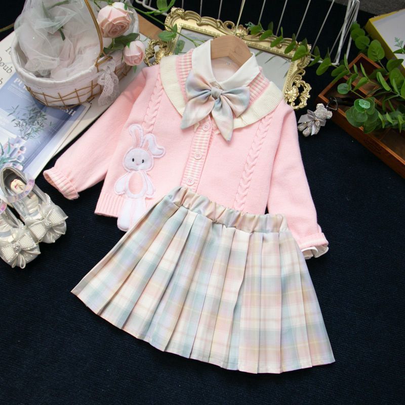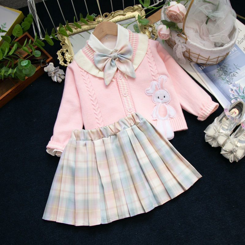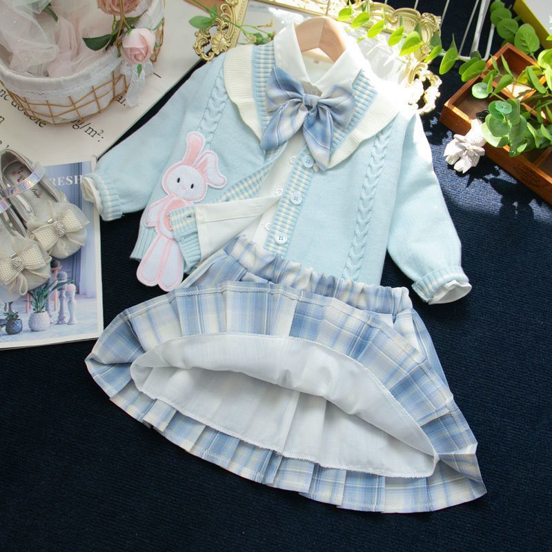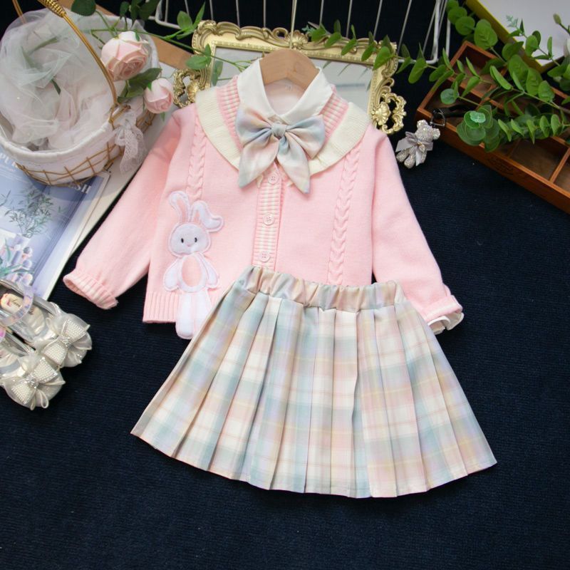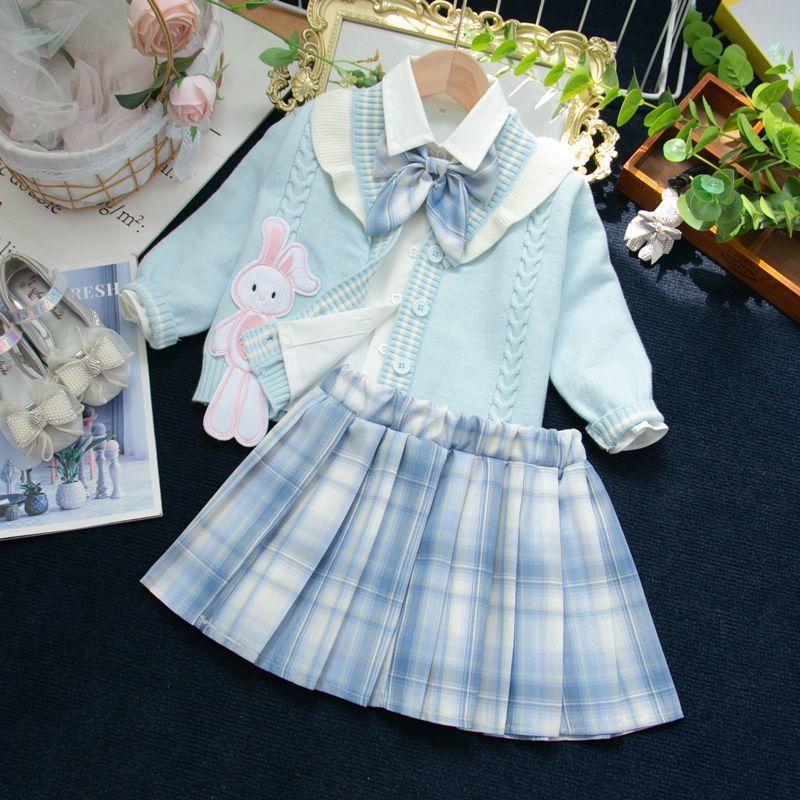 여자 가을 의류 세트 대학 스타일 jk 주름 치마 2025 새로운 여자 토끼 카디건 스웨터 셔츠 3 피스 세트스토어 가기