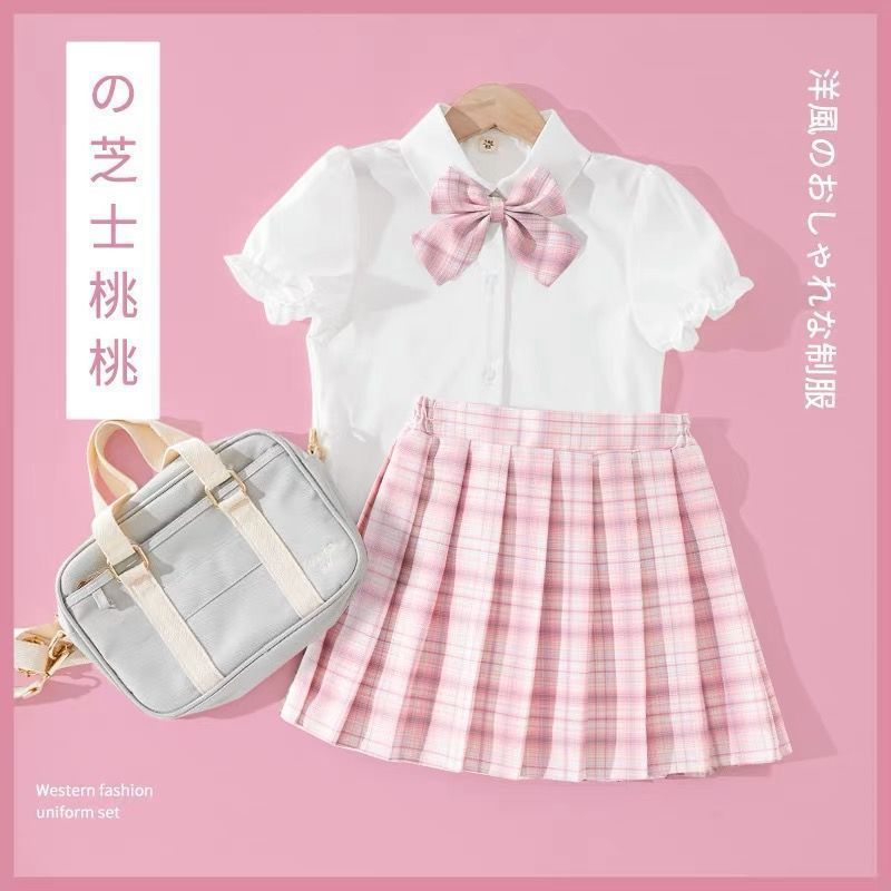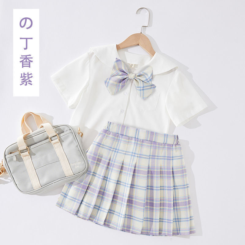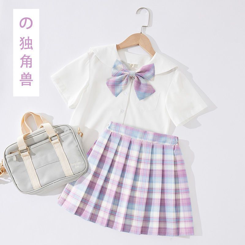 Jk 유니폼 소녀 정장 여름 신작 어린이 일본 대학 반팔 흰색 셔츠 격자 무늬 스커트 투피스 세트