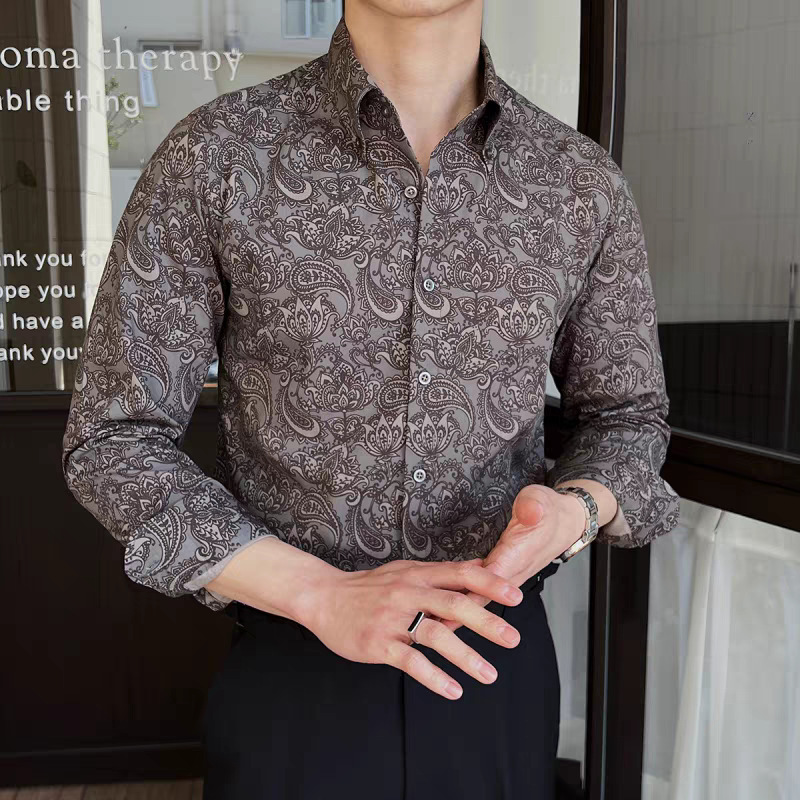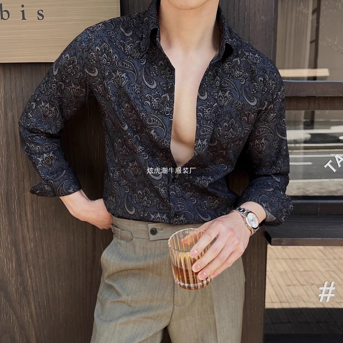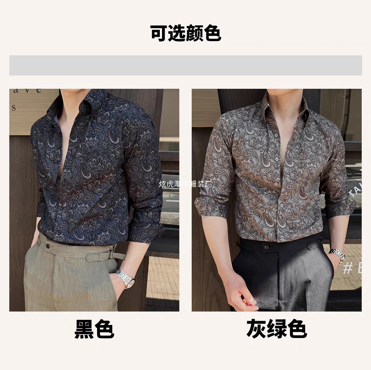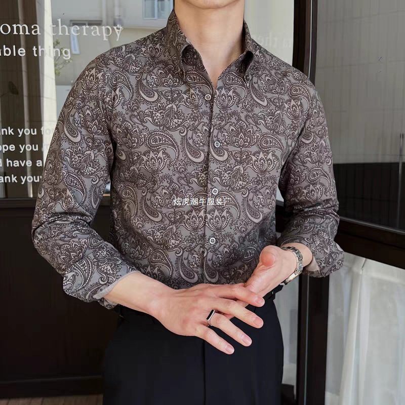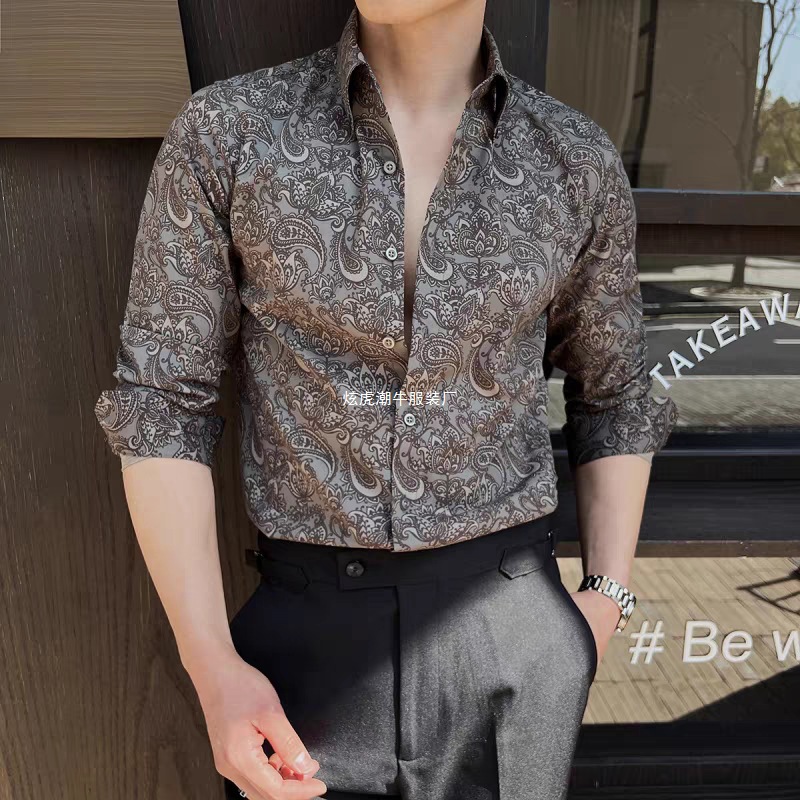 유럽 스타일 패션 트렌드 맞춤형 프린트 셔츠 남성용 긴팔 이너웨어 슬림 라펠 긴팔 꽃무늬 셔츠 남성용