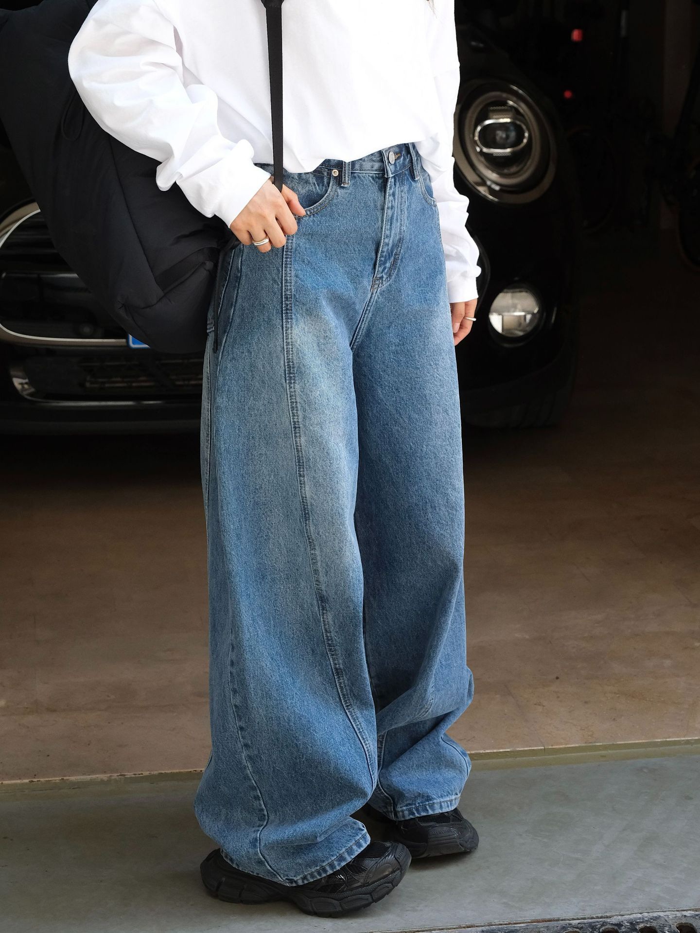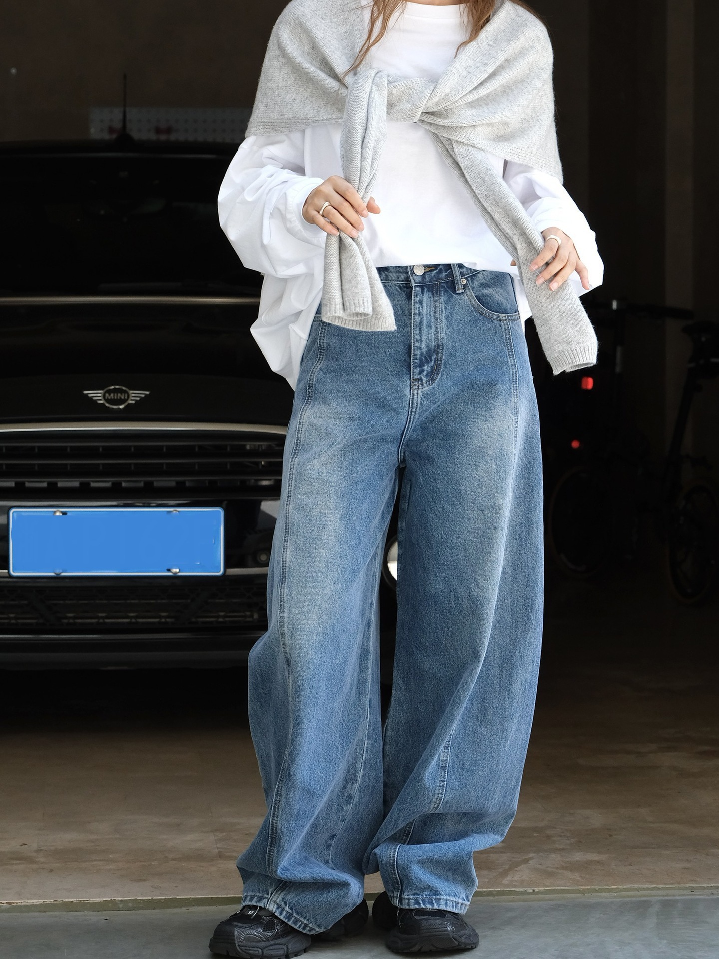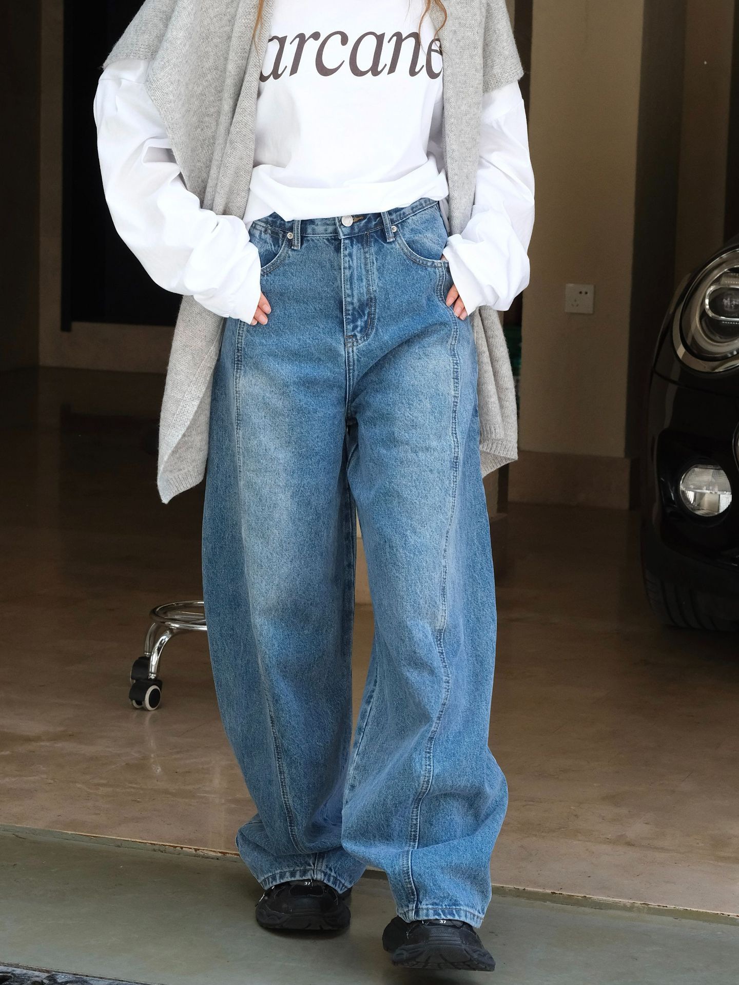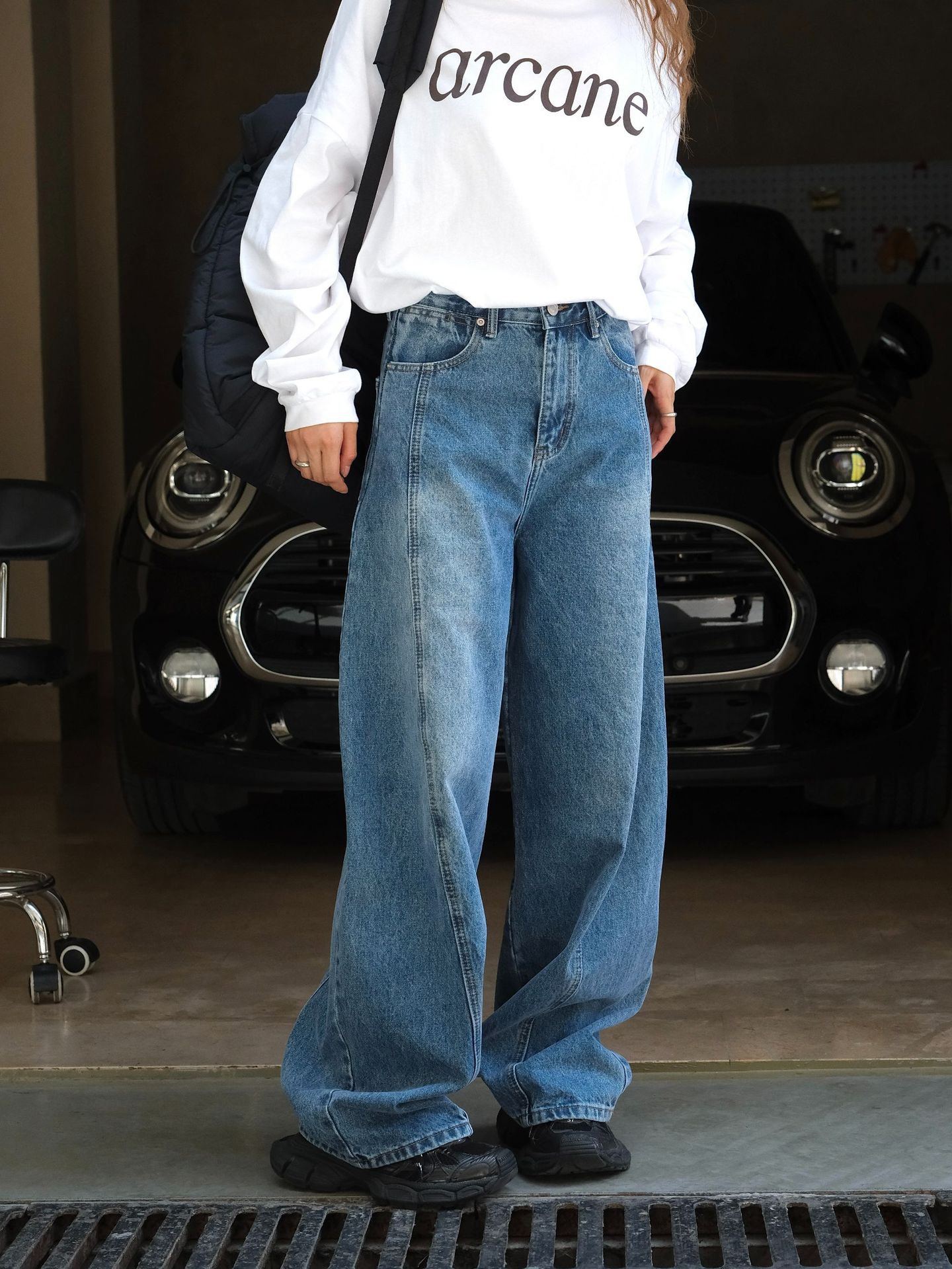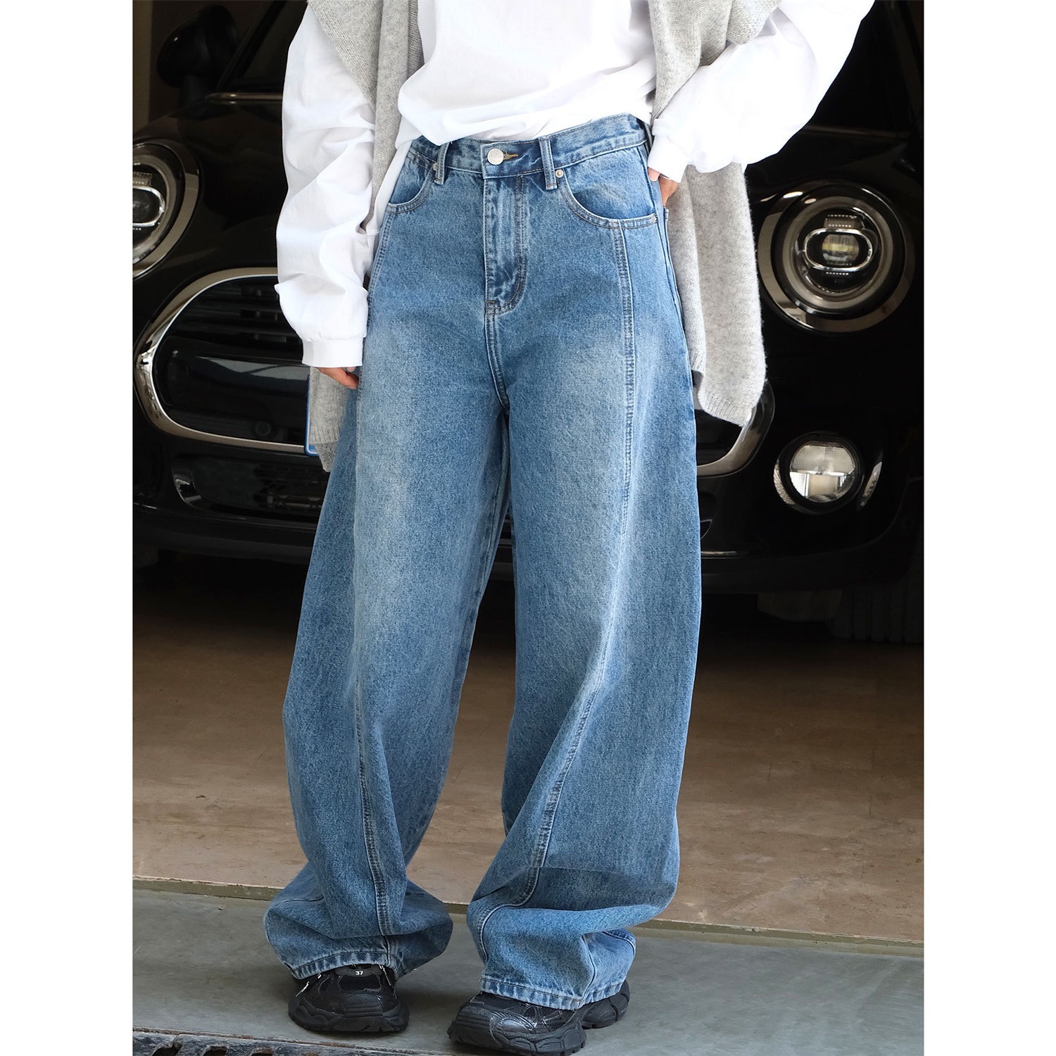 가을, 겨울 새로운 미국 복고풍 곡선 스플 라이스 청바지 여성용 하이 웨이스트 와이드 레그 슬림 캐주얼 바지