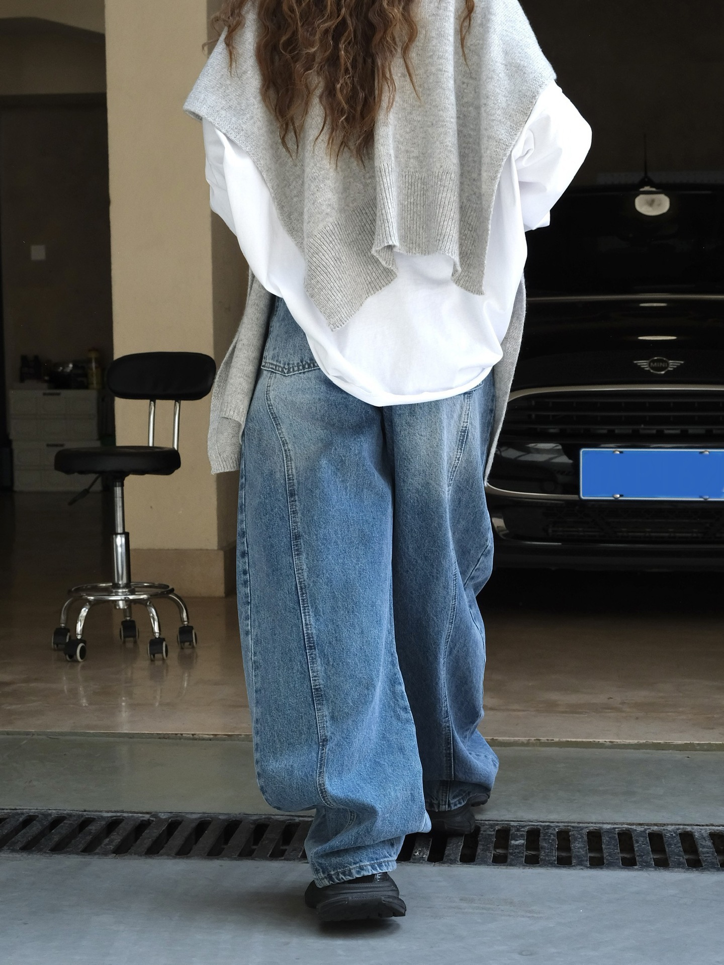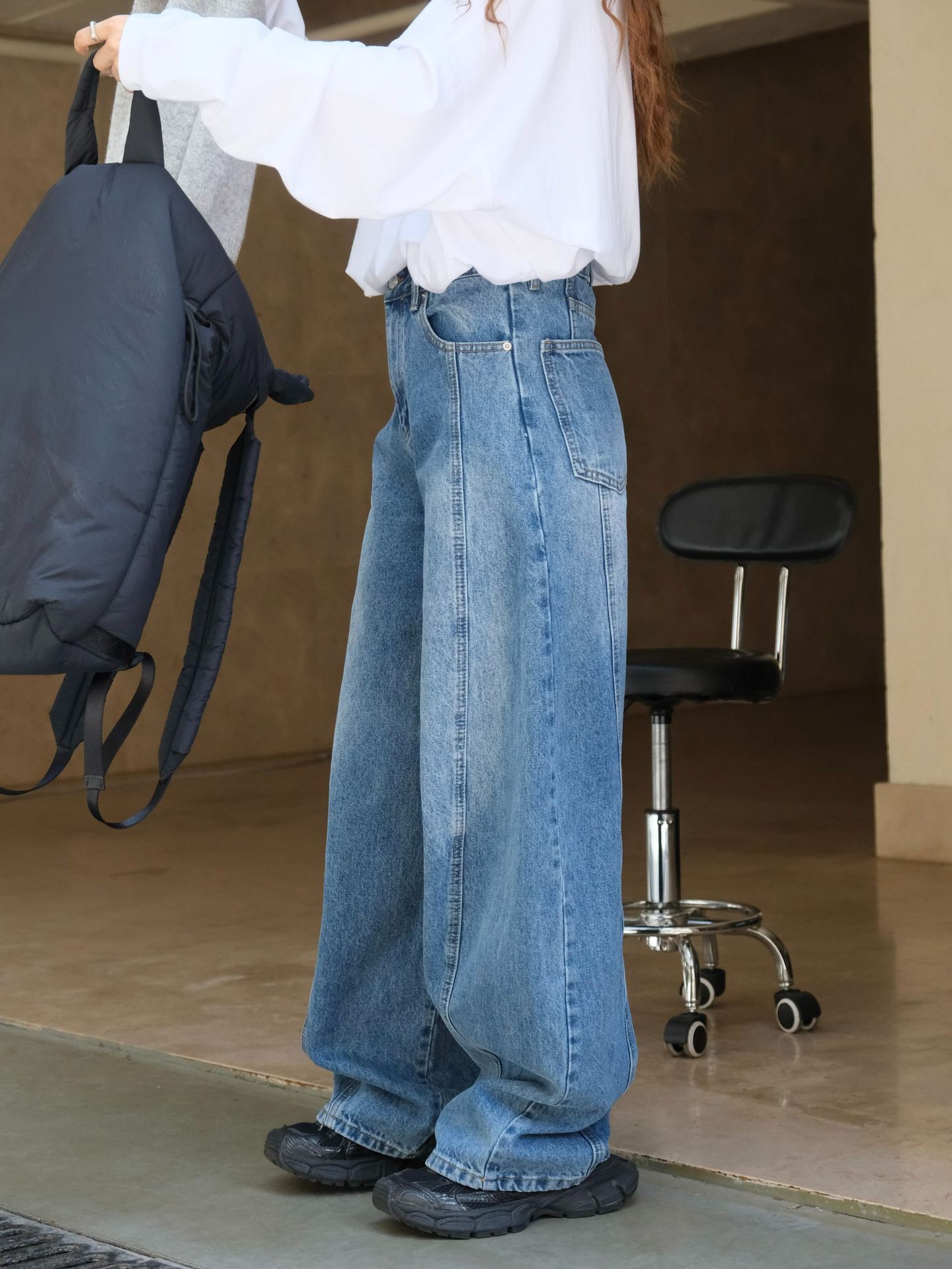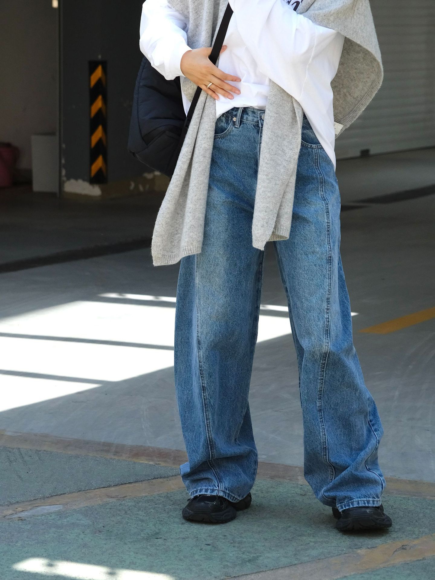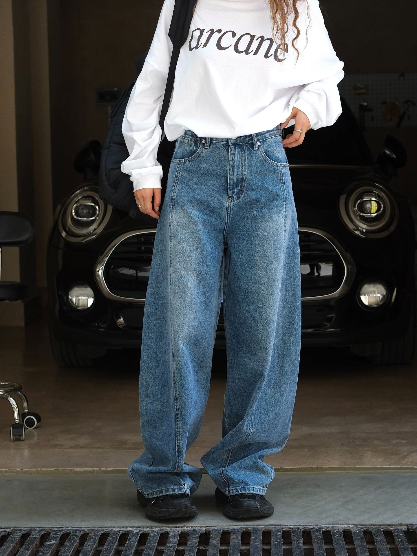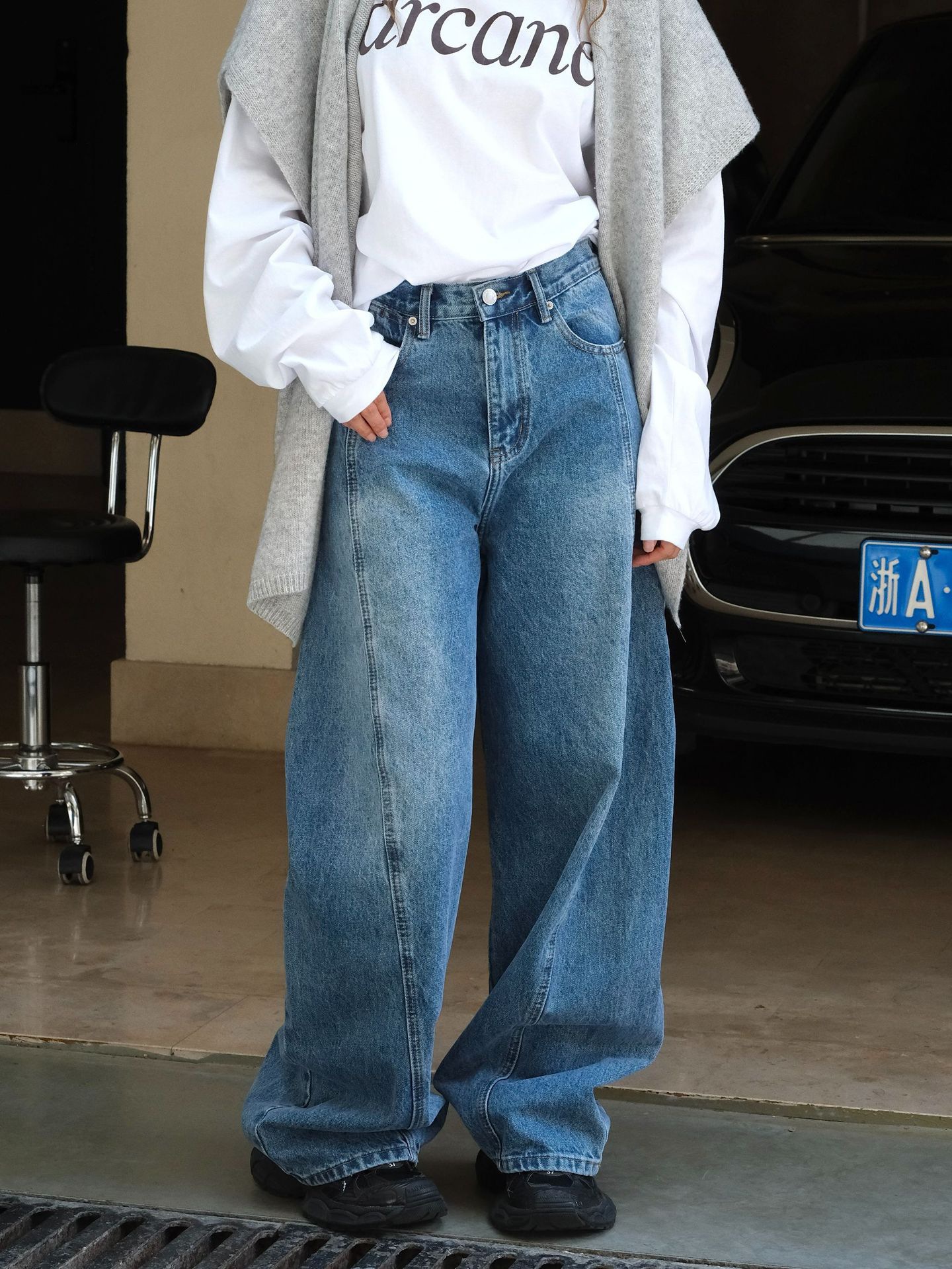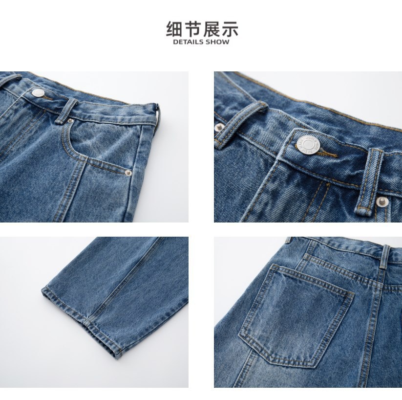 가을, 겨울 새로운 미국 복고풍 곡선 스플 라이스 청바지 여성용 하이 웨이스트 와이드 레그 슬림 캐주얼 바지