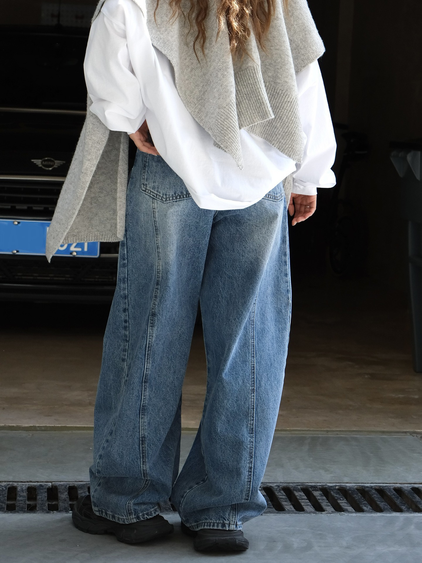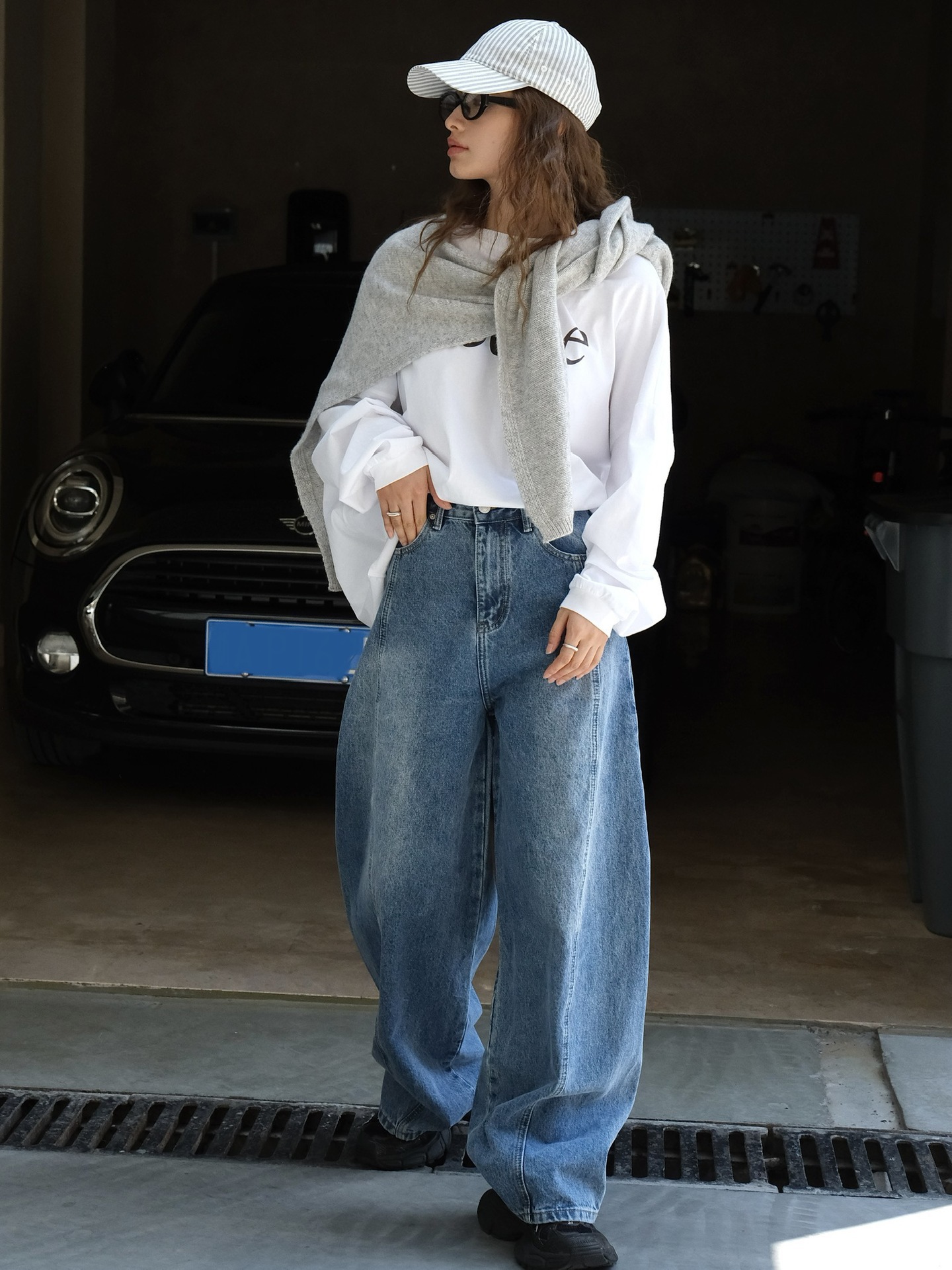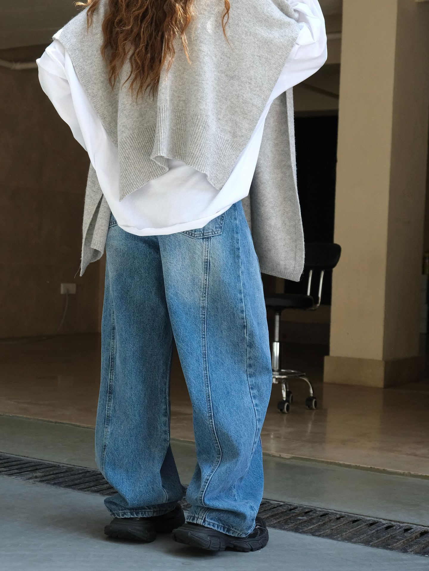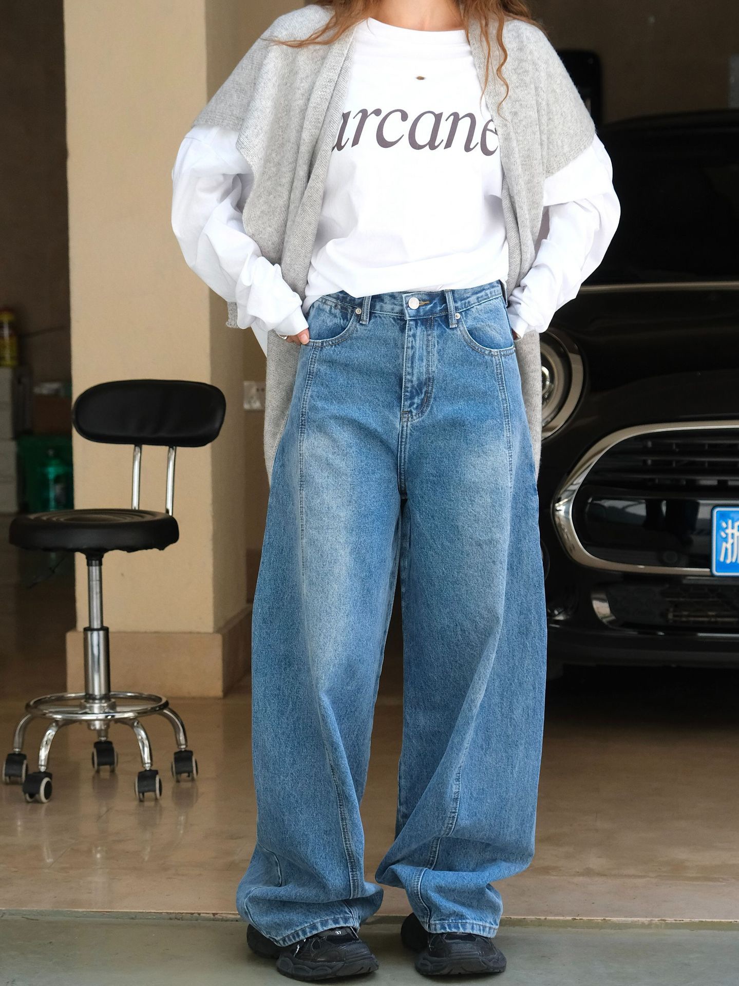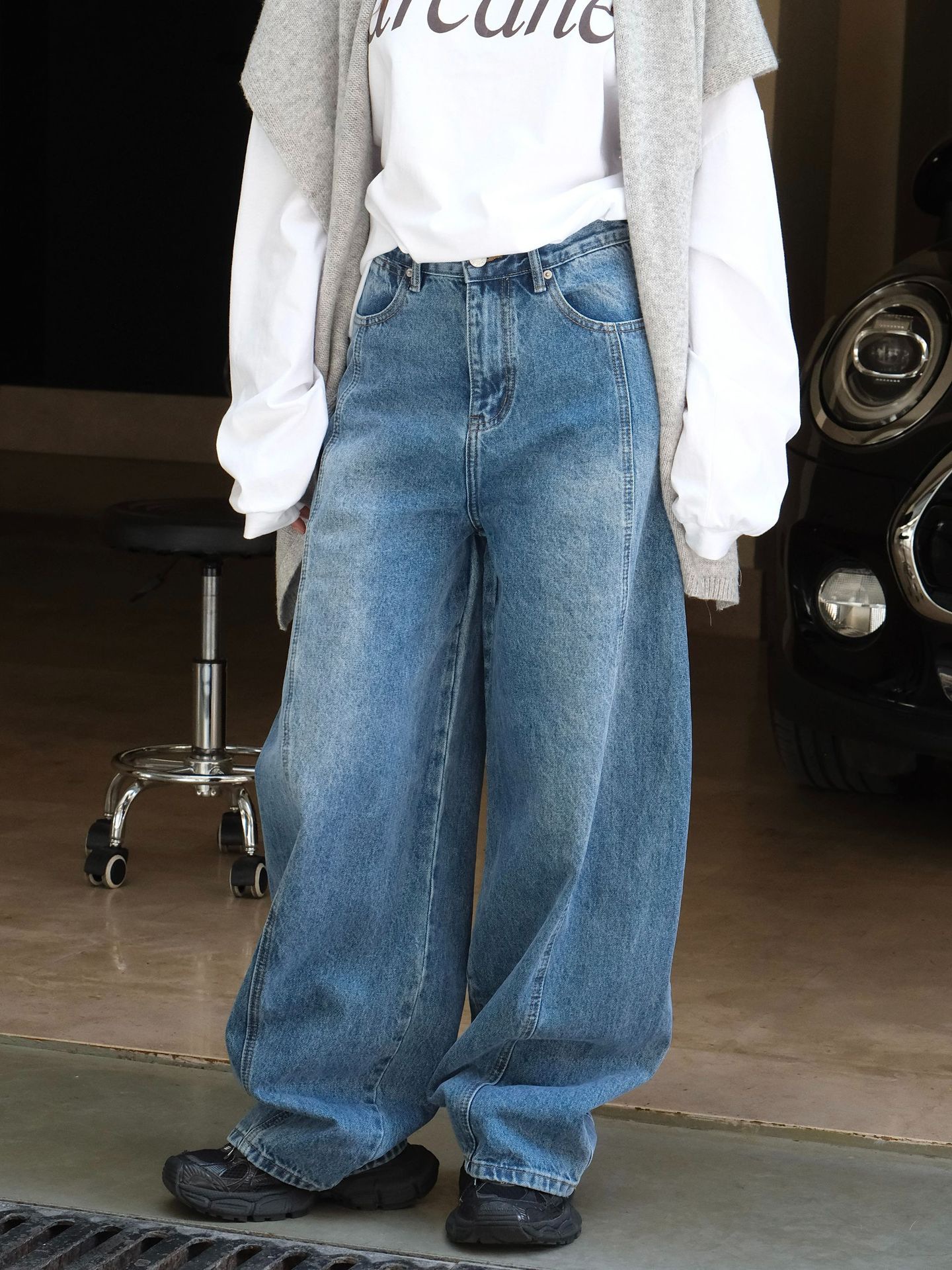가을, 겨울 새로운 미국 복고풍 곡선 스플 라이스 청바지 여성용 하이 웨이스트 와이드 레그 슬림 캐주얼 바지
