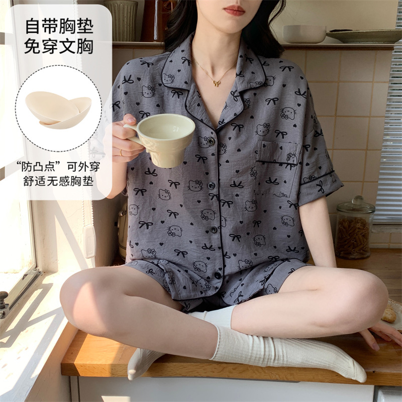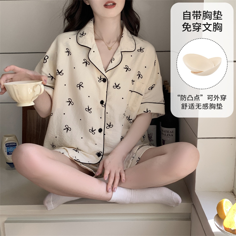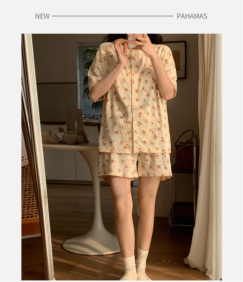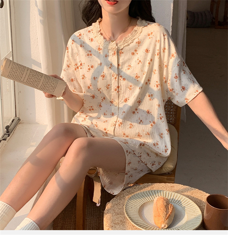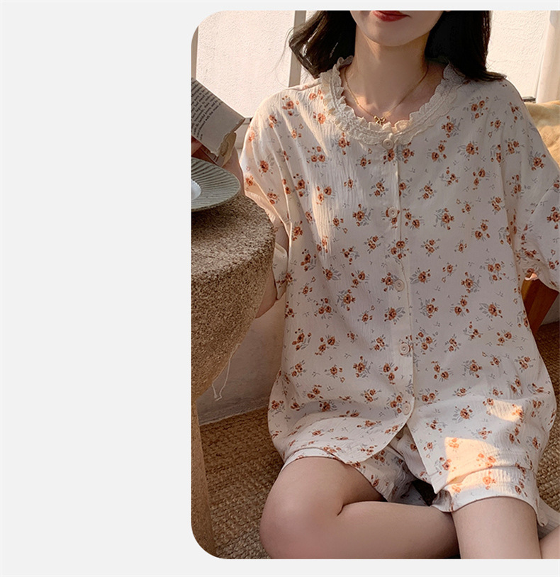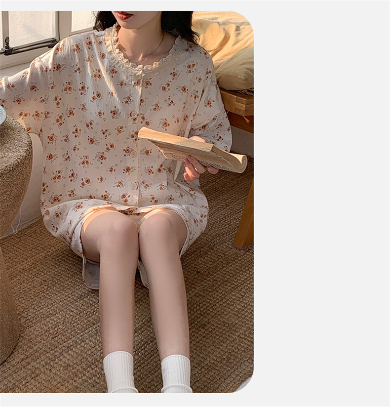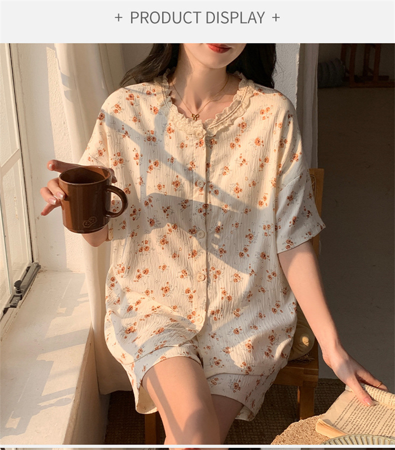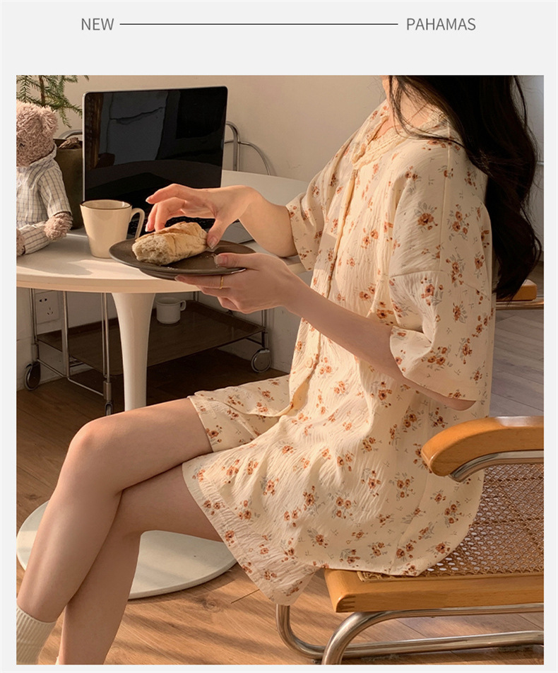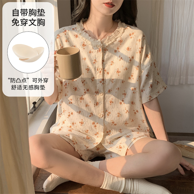 가슴 패드가 있는 새로운 스타일의 반팔 반바지 꽃무늬 가디건 잠옷 여성 여름 세트 대형 심플 캐주얼 홈웨어스토어 가기