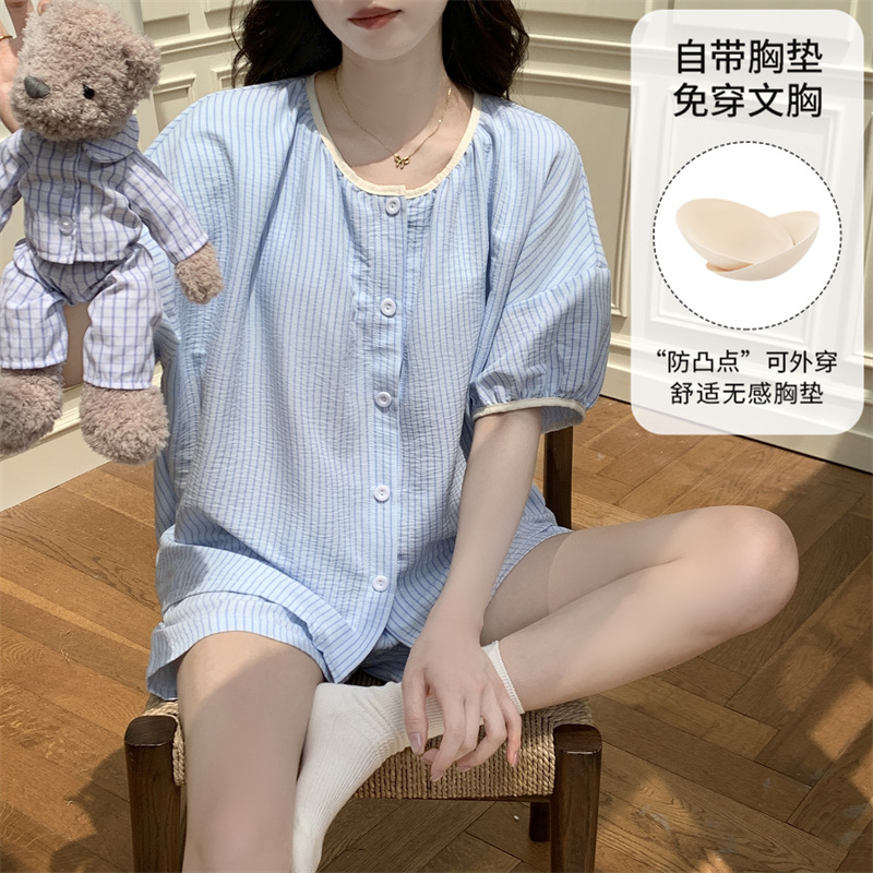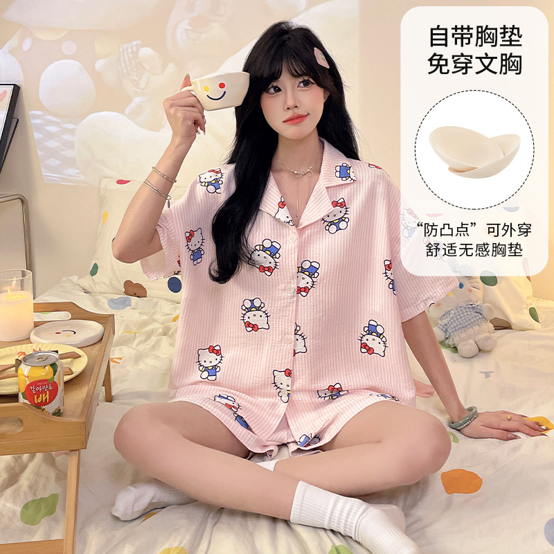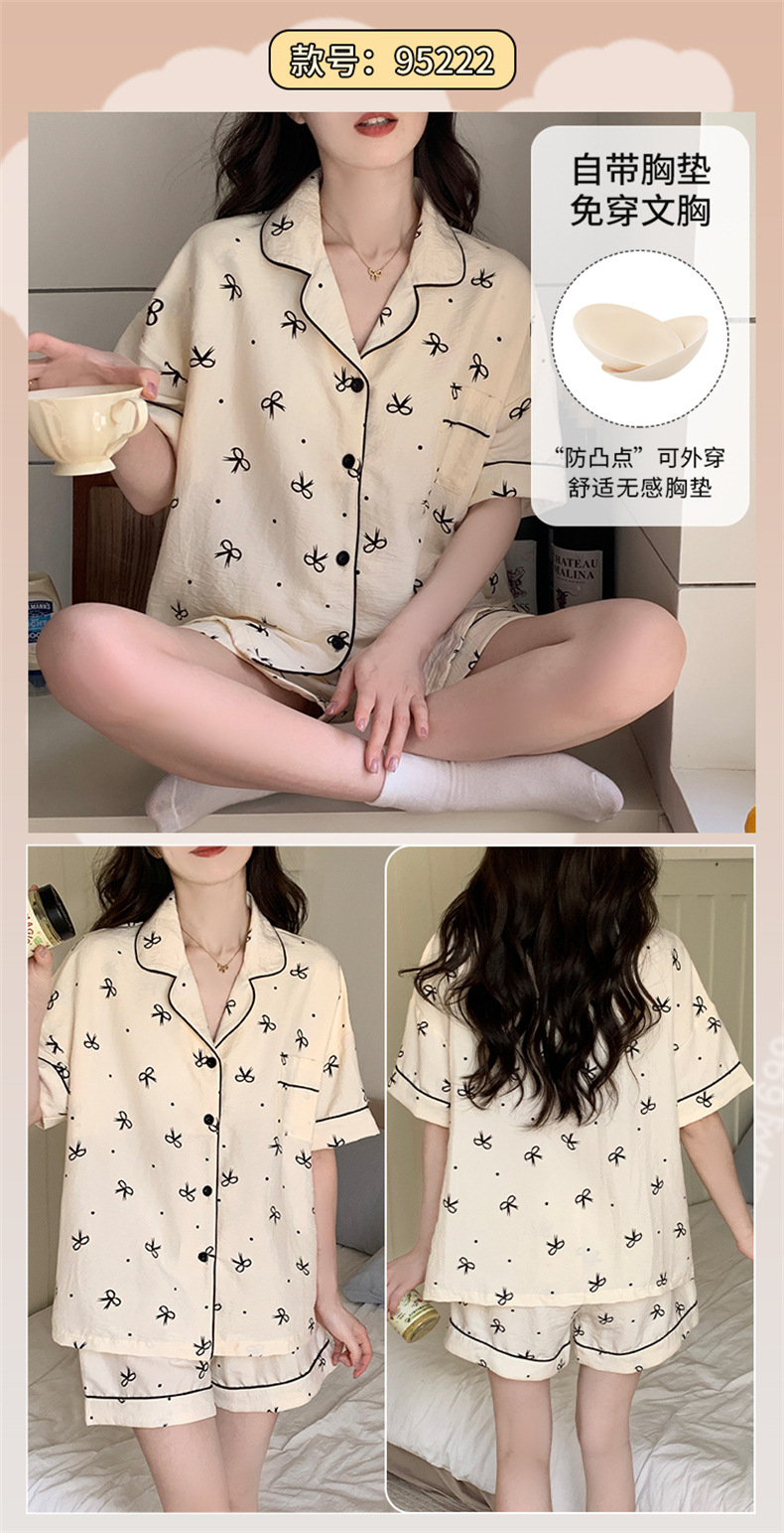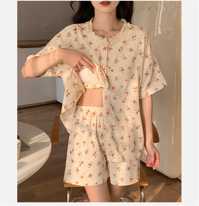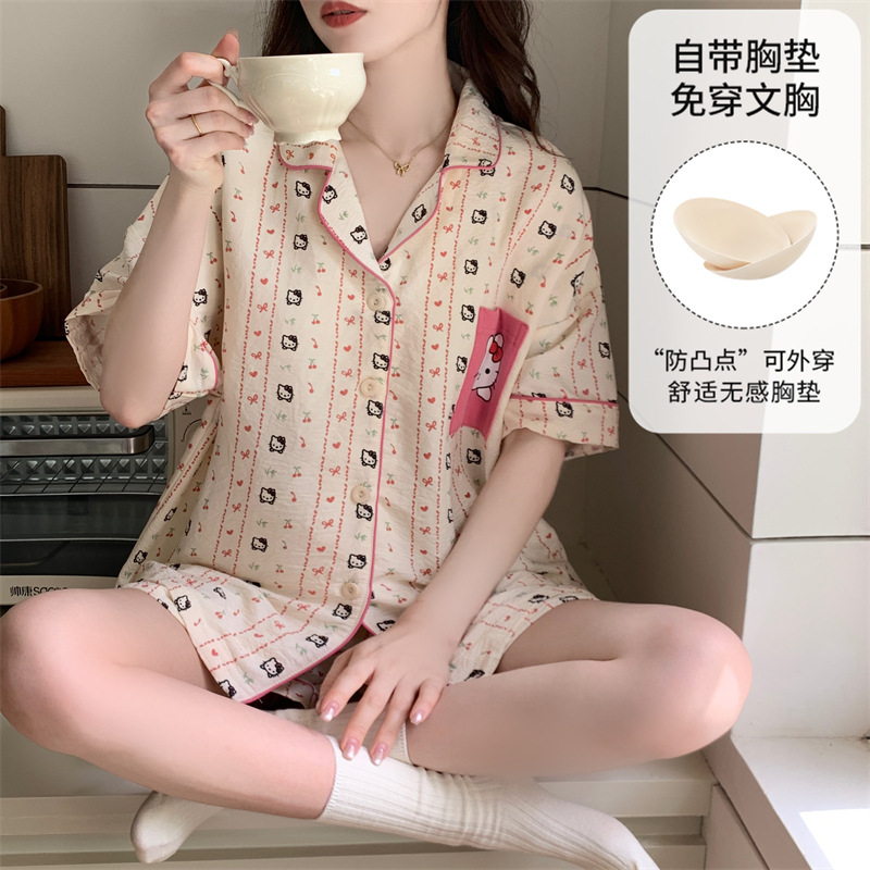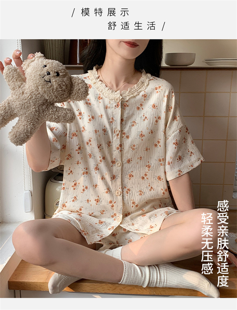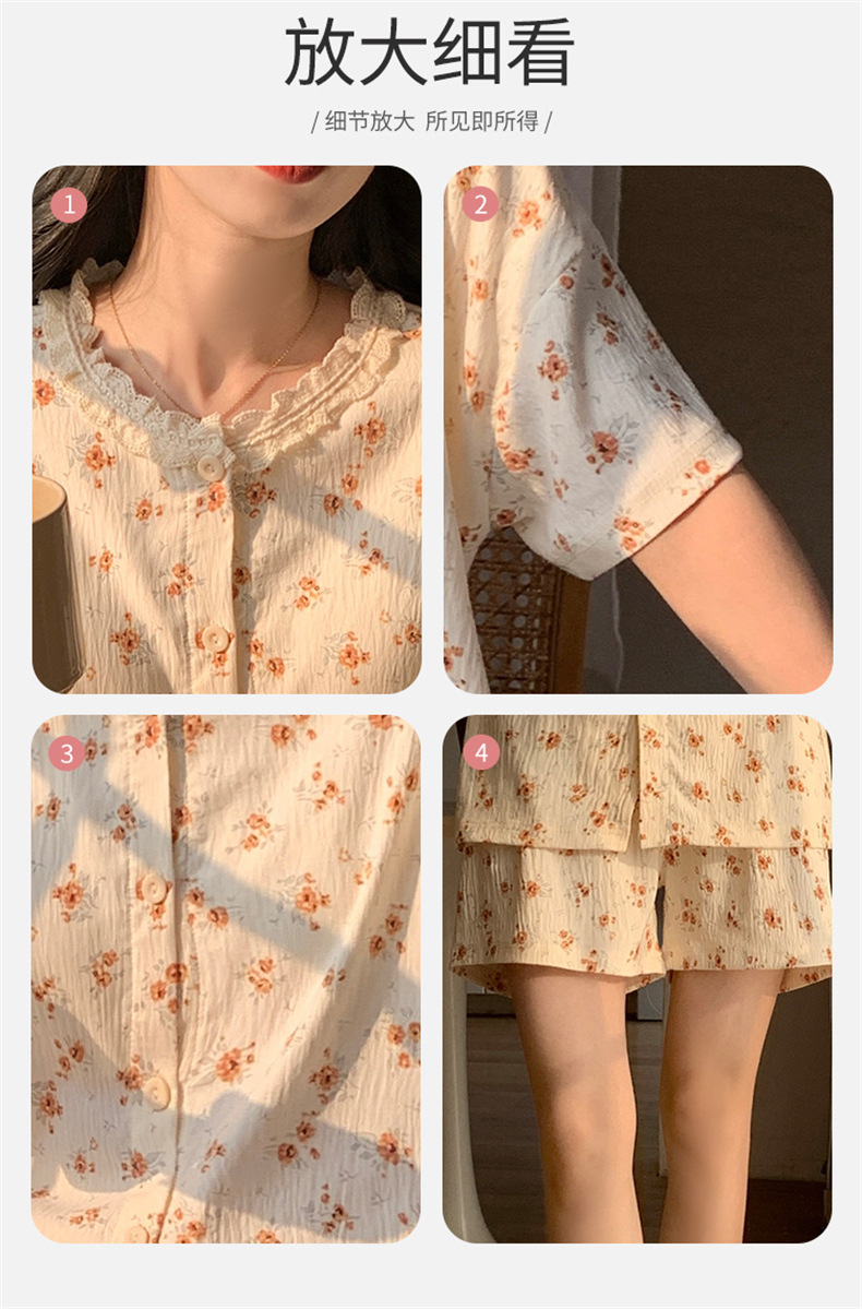 가슴 패드가 있는 새로운 스타일의 반팔 반바지 꽃무늬 가디건 잠옷 여성 여름 세트 대형 심플 캐주얼 홈웨어스토어 가기