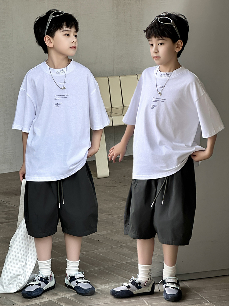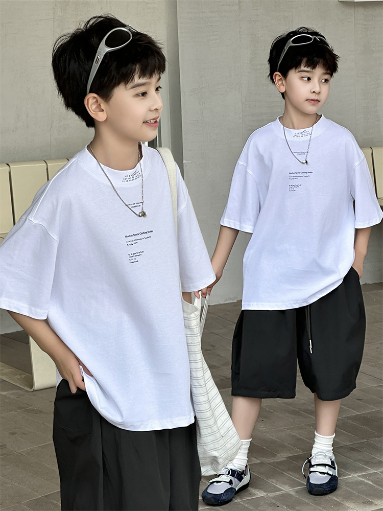 여름 신작 2025 소년 티셔츠 반팔 고중량 트렌디 브랜드 프린트 캐주얼 티셔츠 화이트 탑