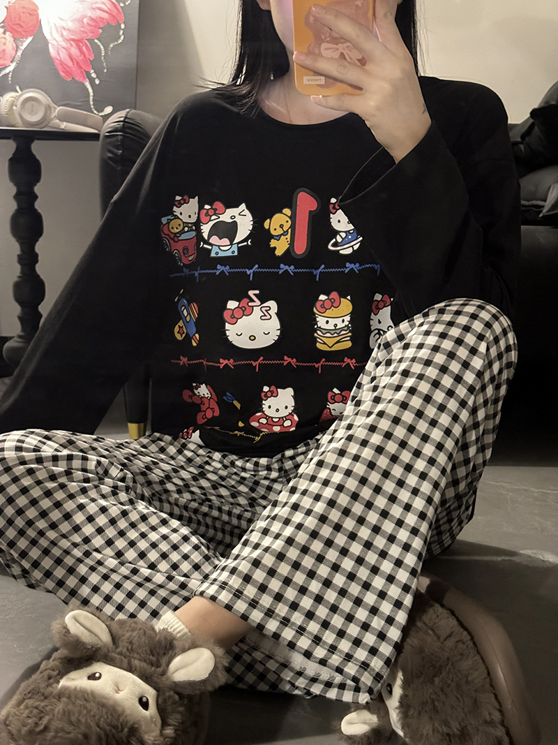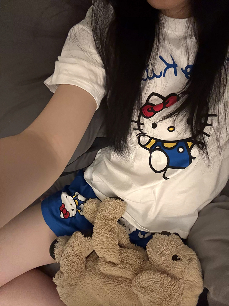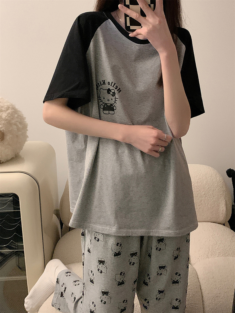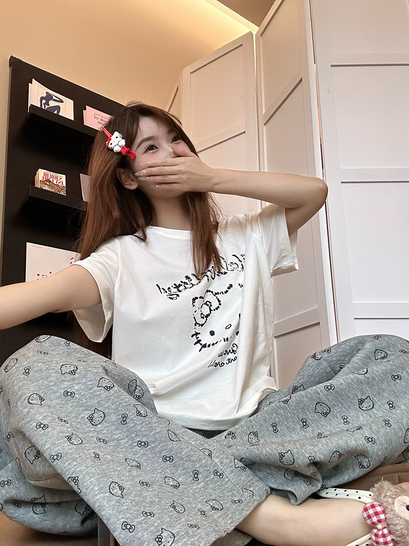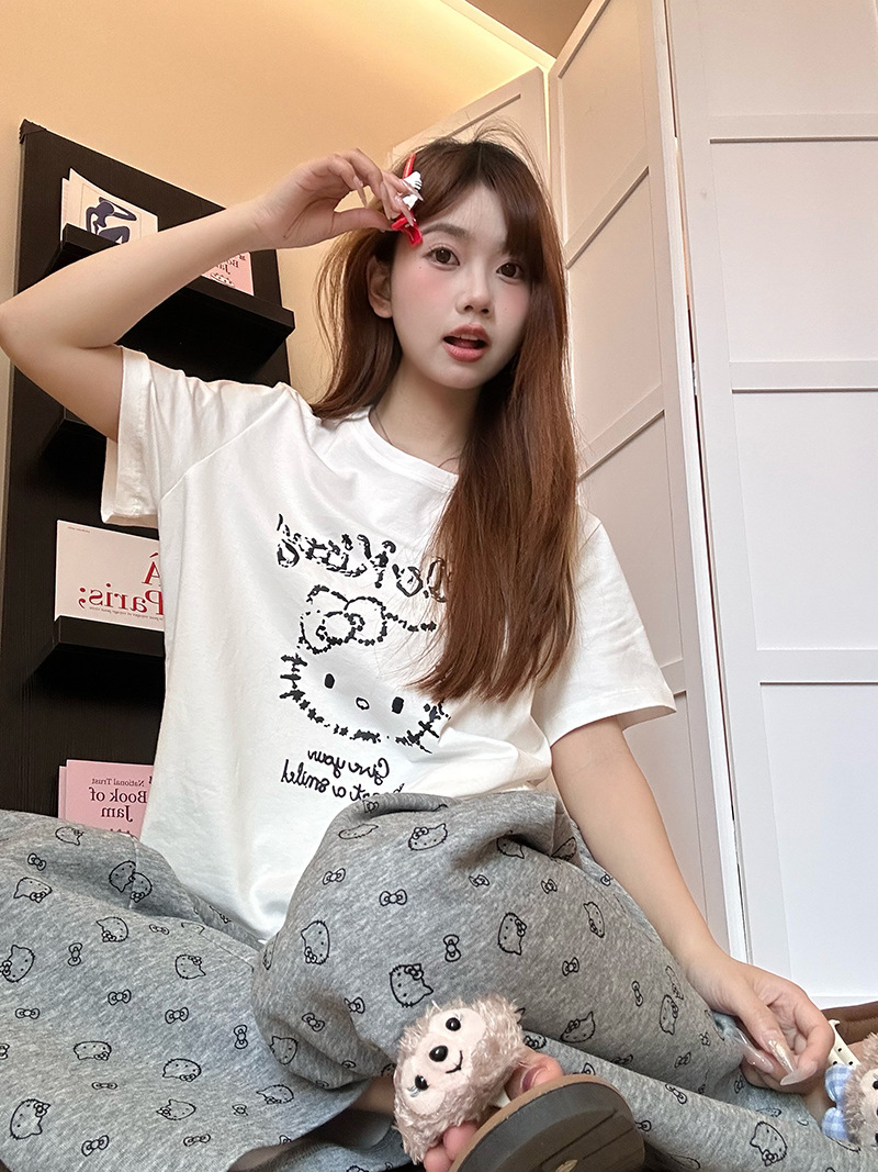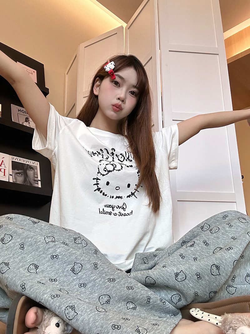 Ins Girls 귀여운 헬로 키티 짧은 소매 파자마 여성의 봄과 여름 2025 새로운 티셔츠 바지 홈 의류 세트
