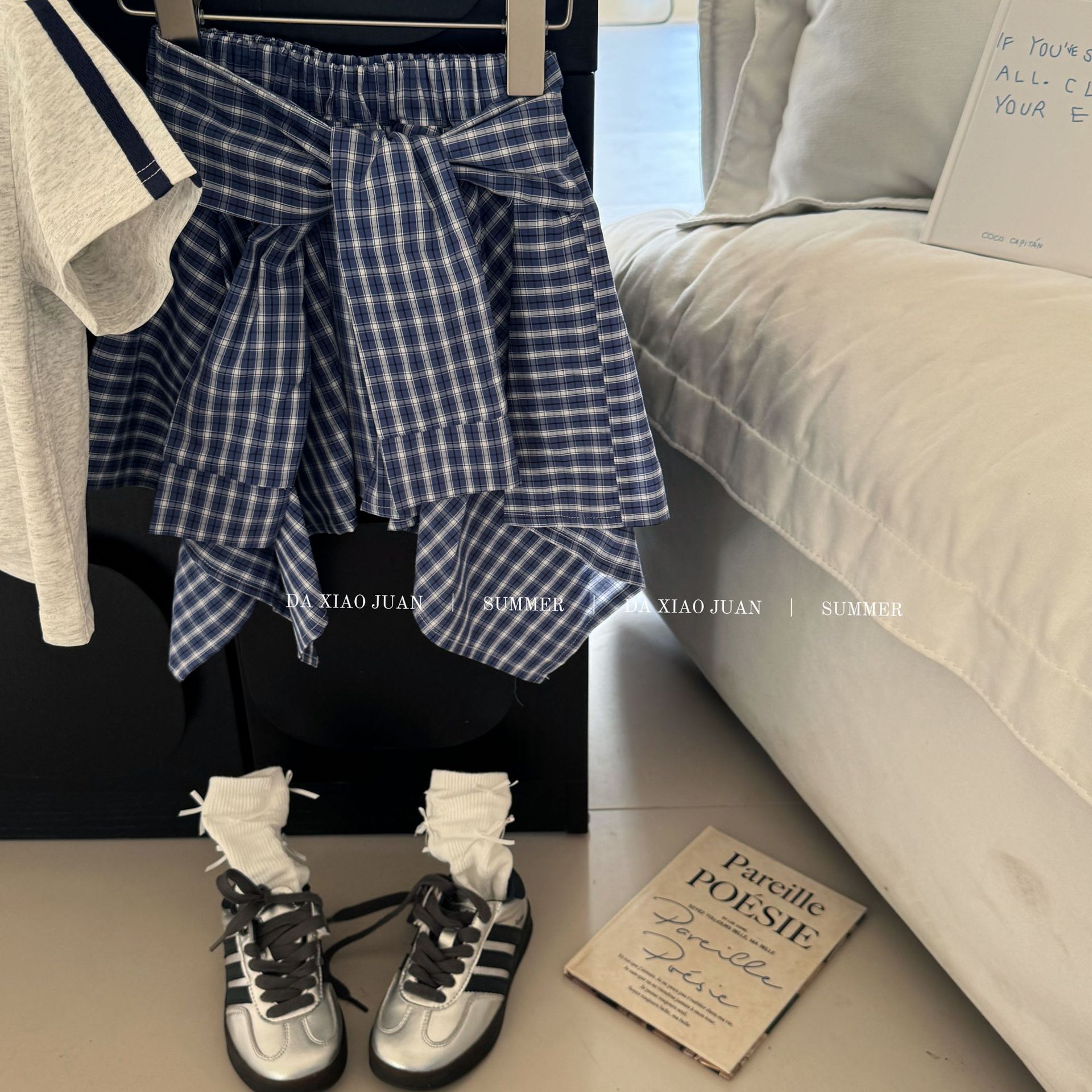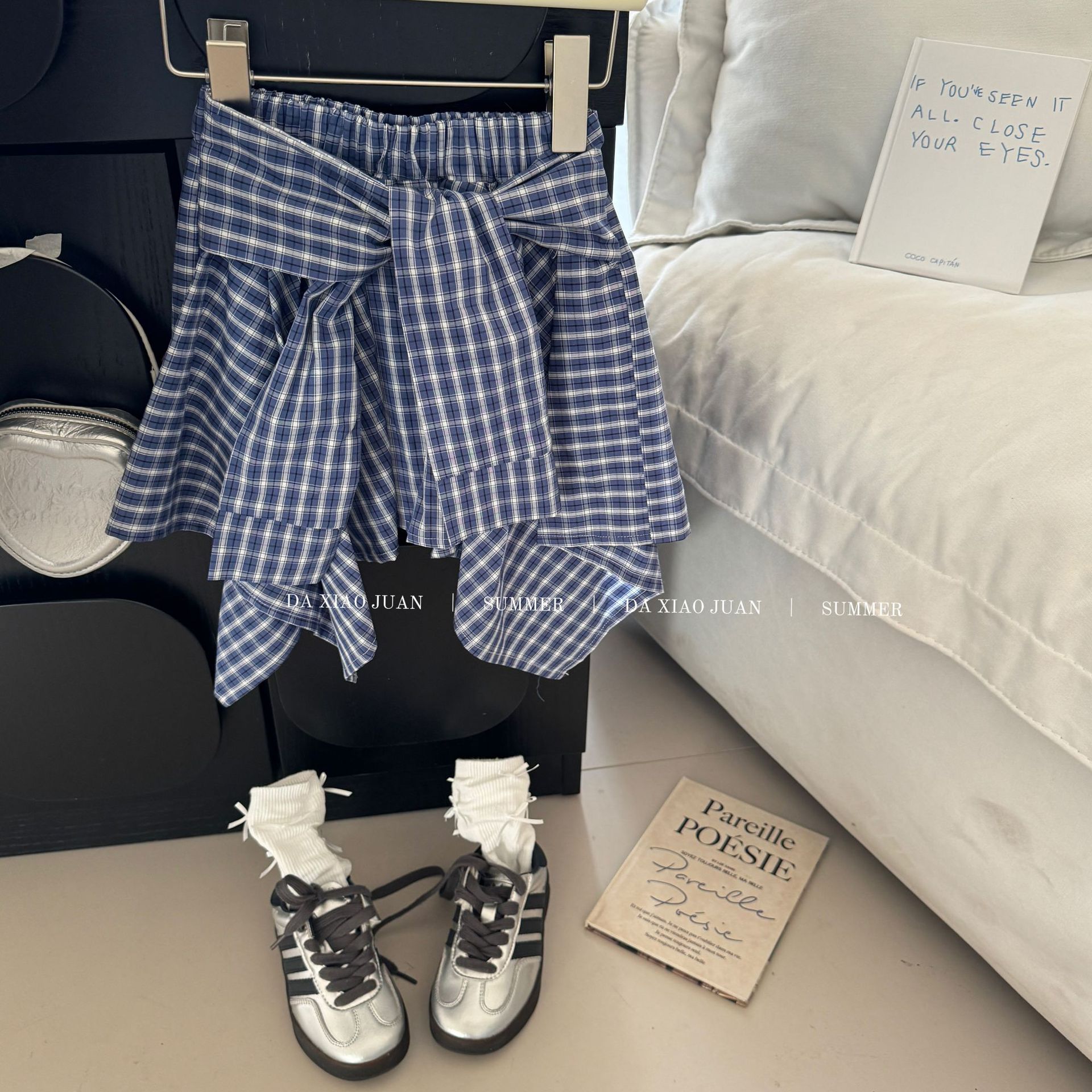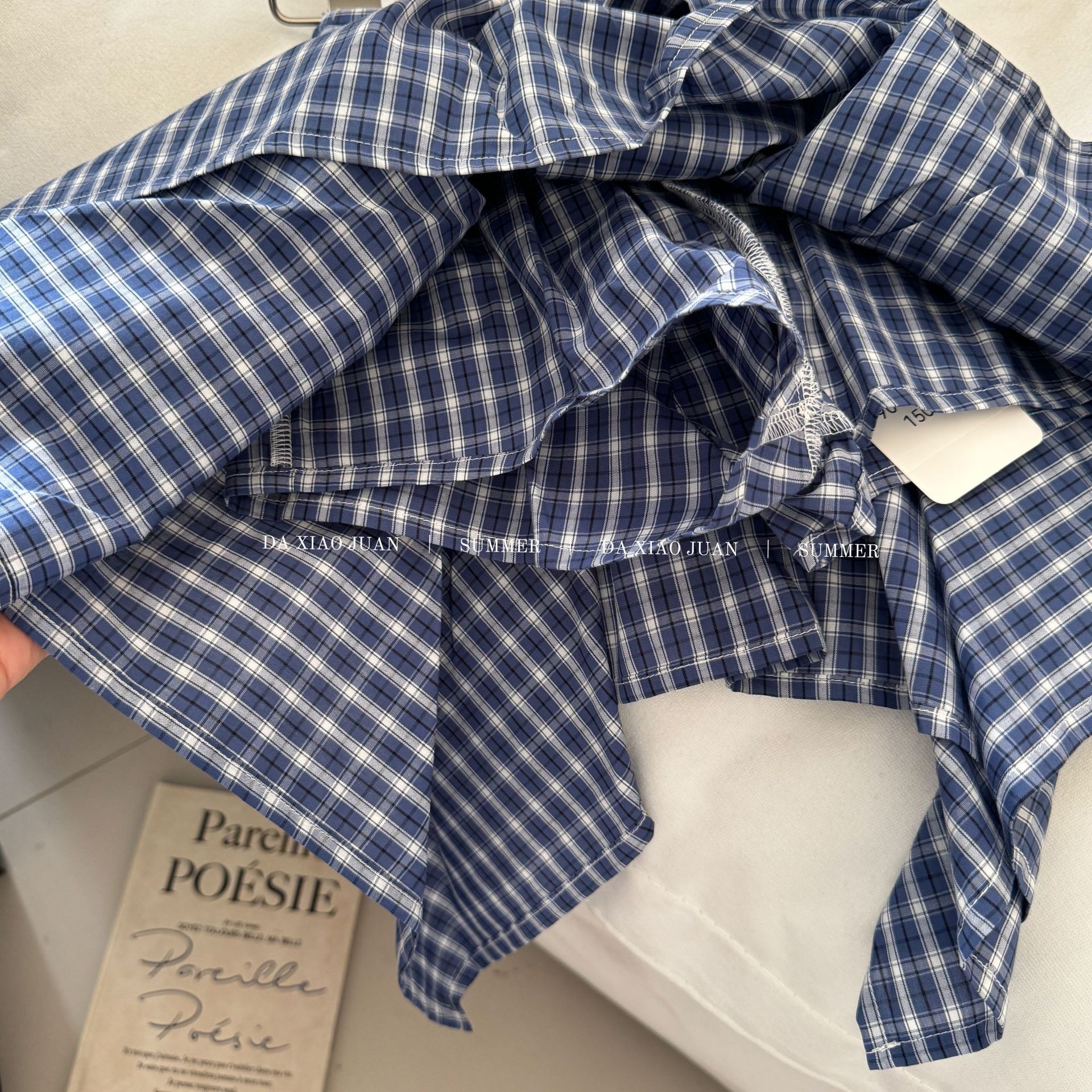 다양한 사이즈의 재고 상품, 25 여름 신상 여아 블루 체크무늬 짧은 치마, 귀여운 투피스 스타일의 작은 치마, 아동복 코디