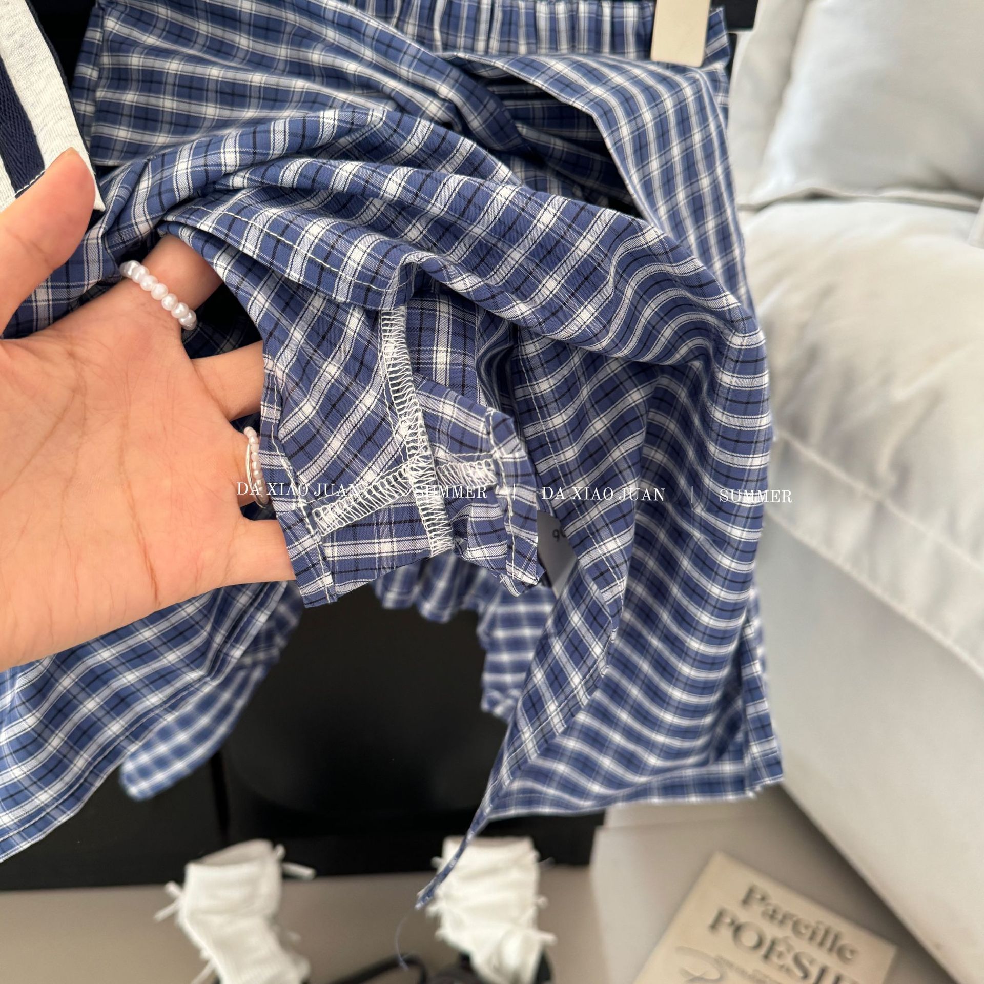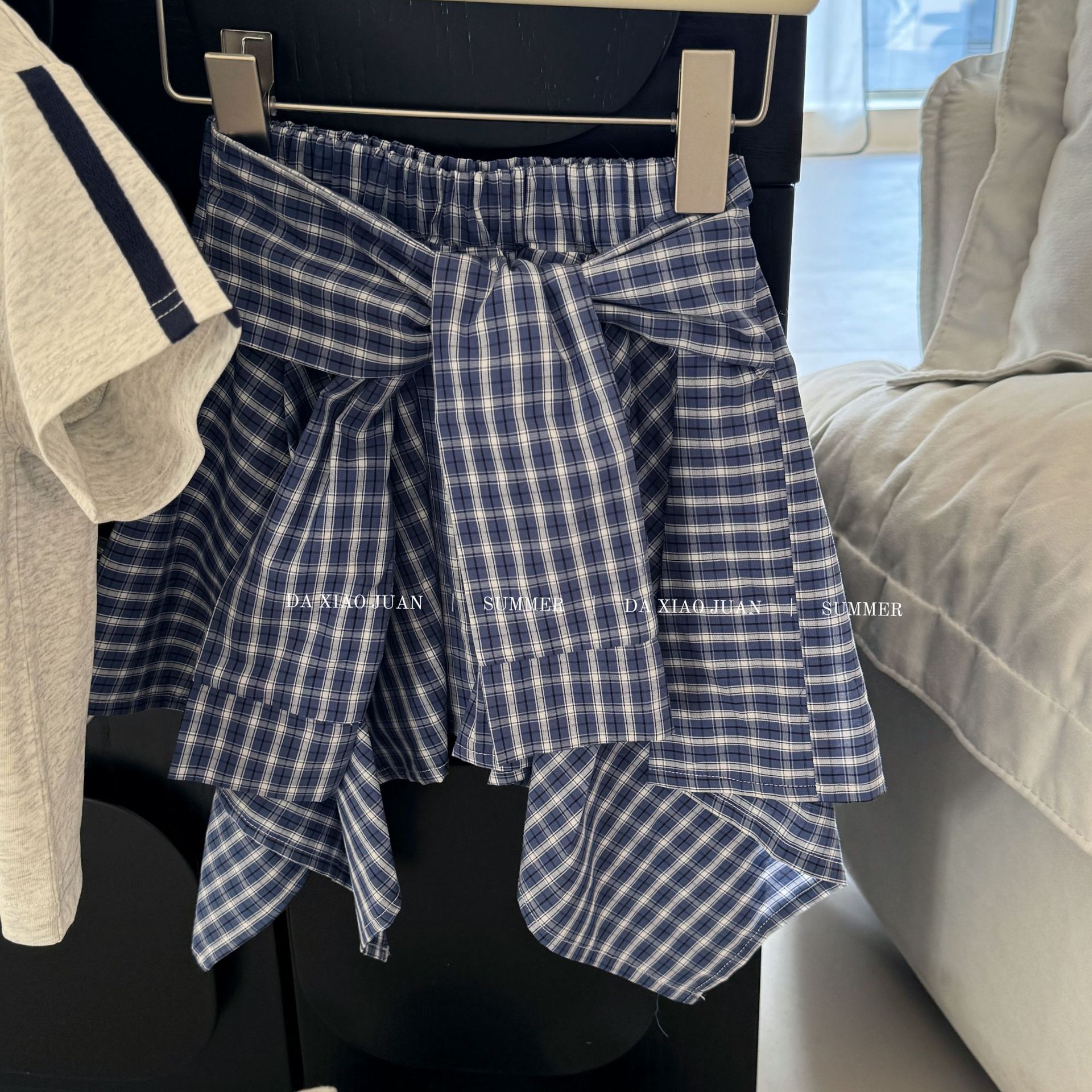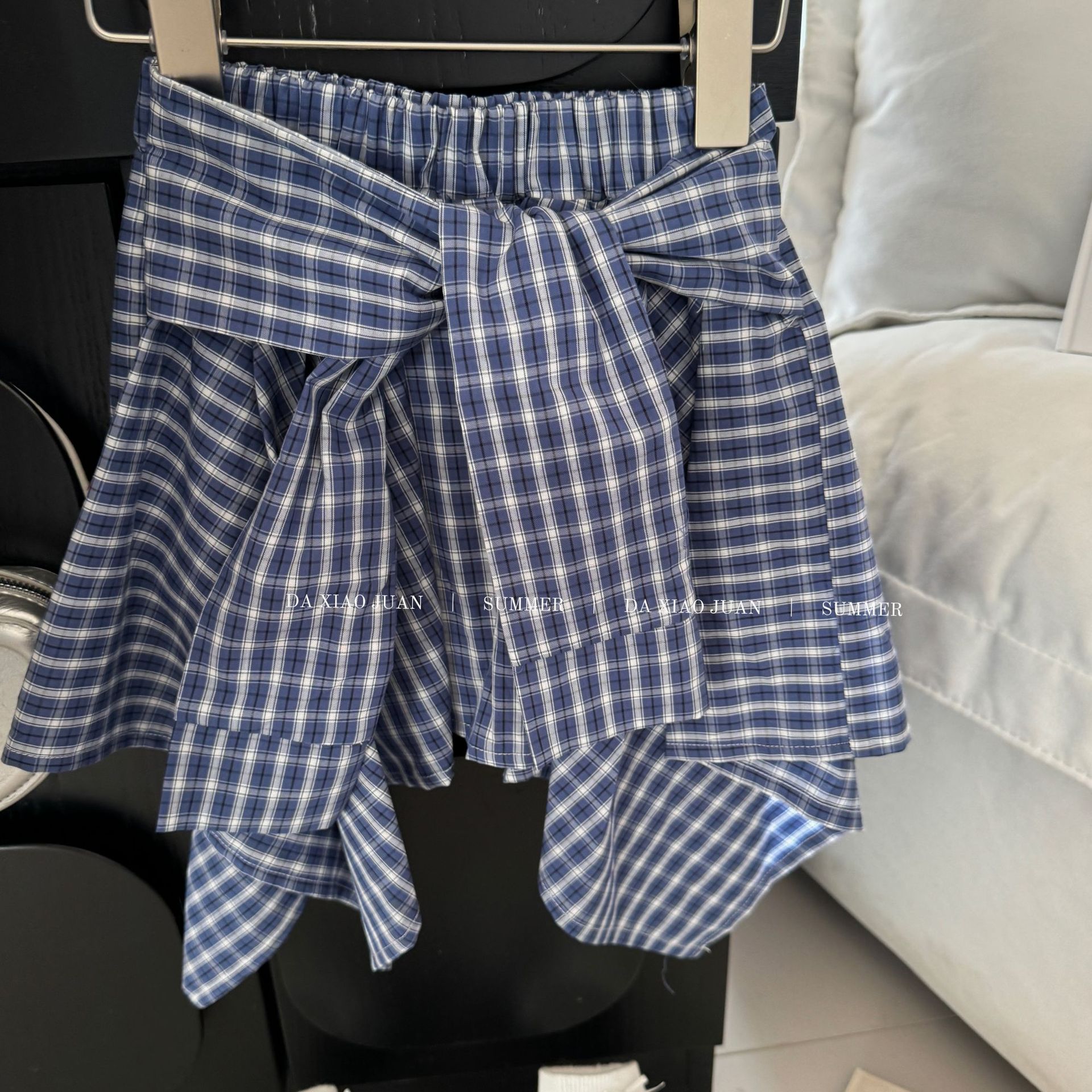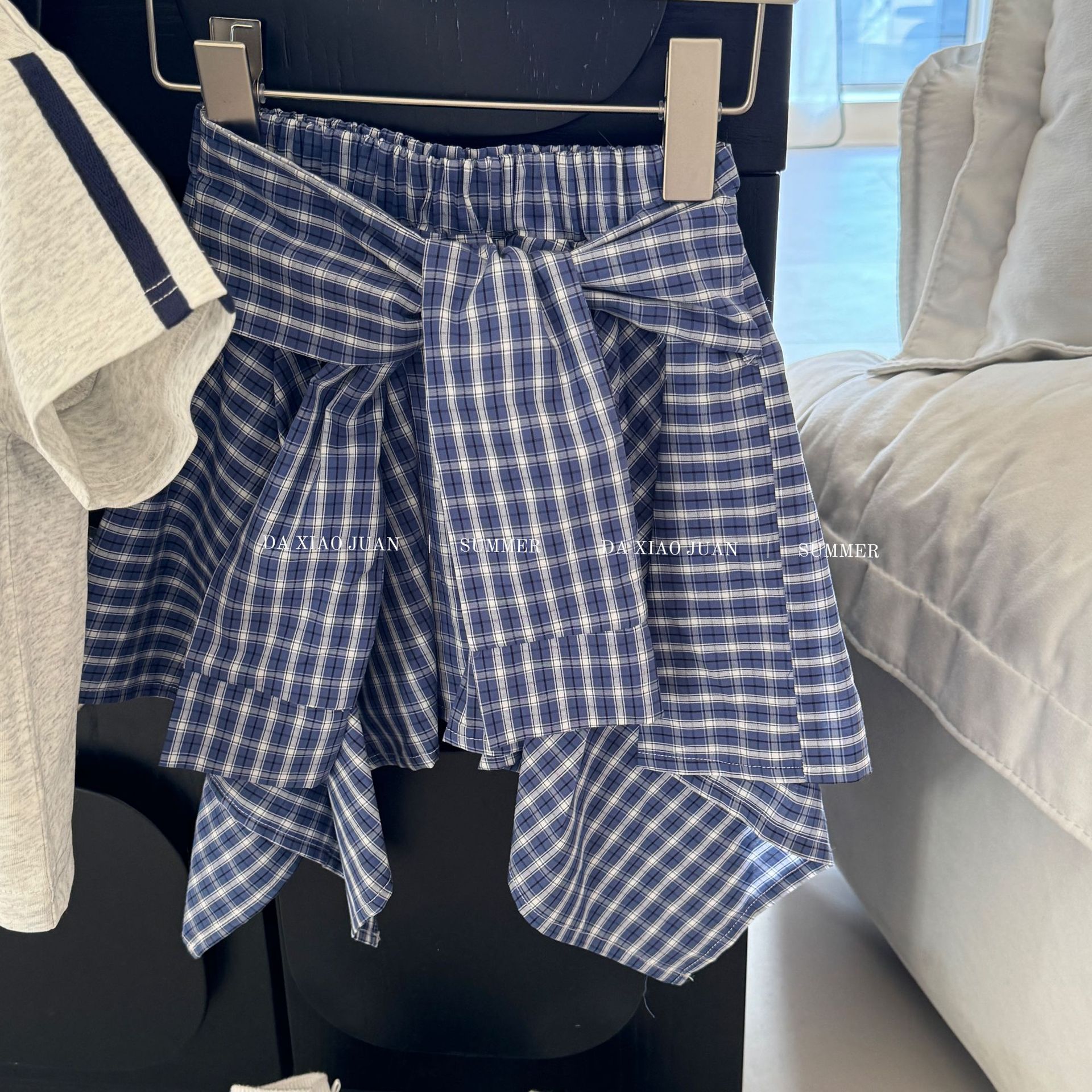 다양한 사이즈의 재고 상품, 25 여름 신상 여아 블루 체크무늬 짧은 치마, 귀여운 투피스 스타일의 작은 치마, 아동복 코디