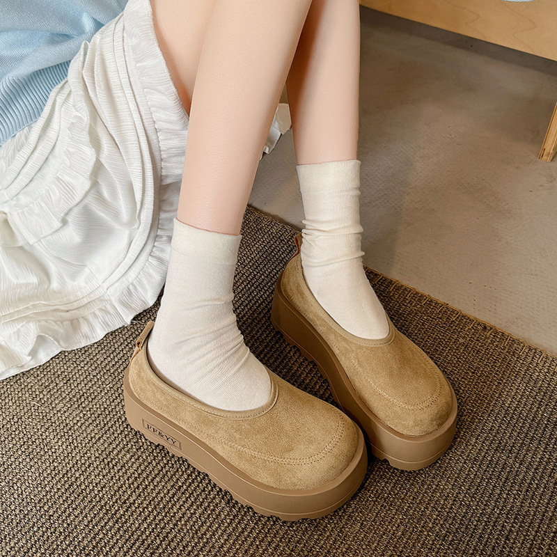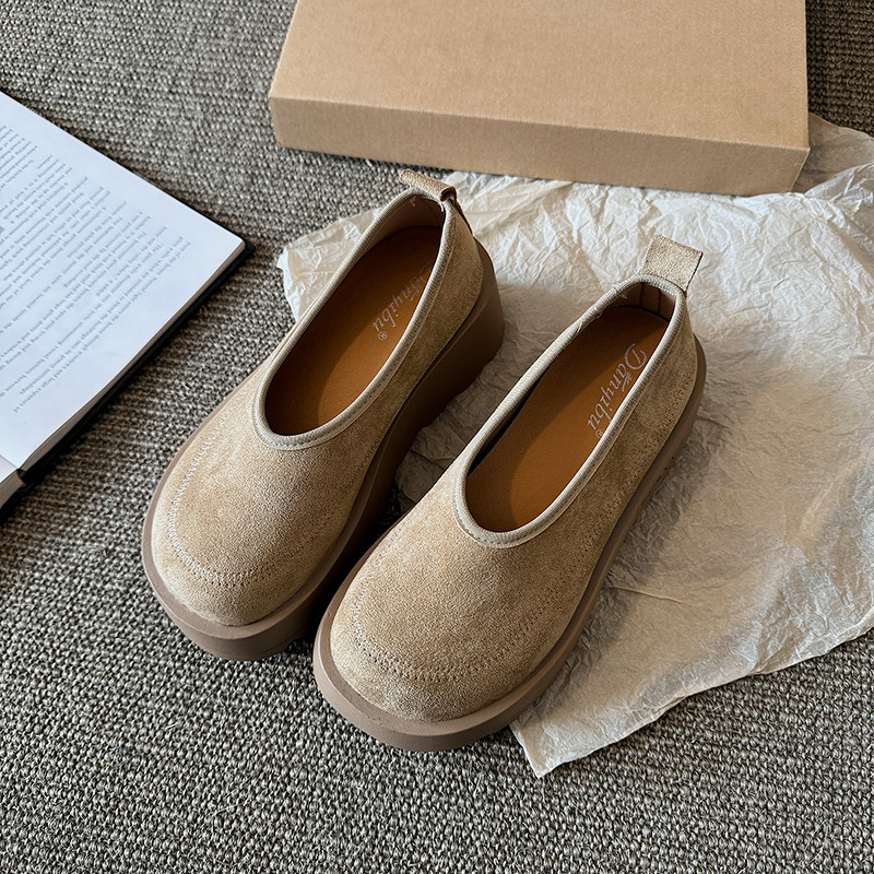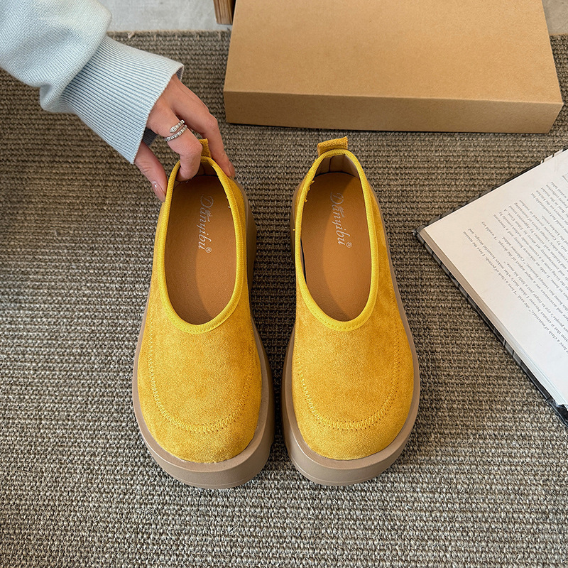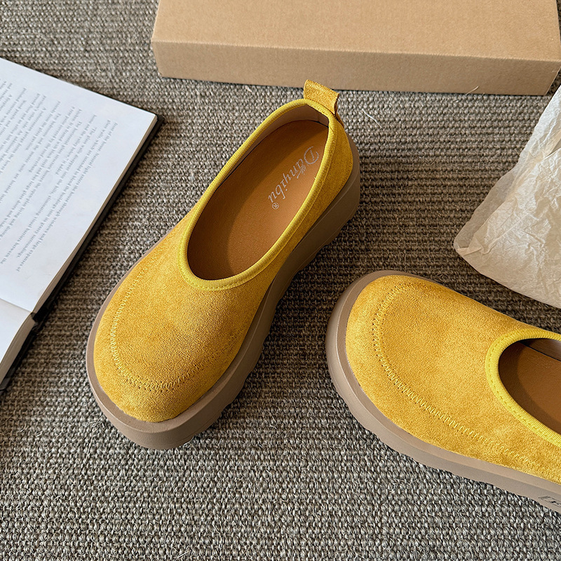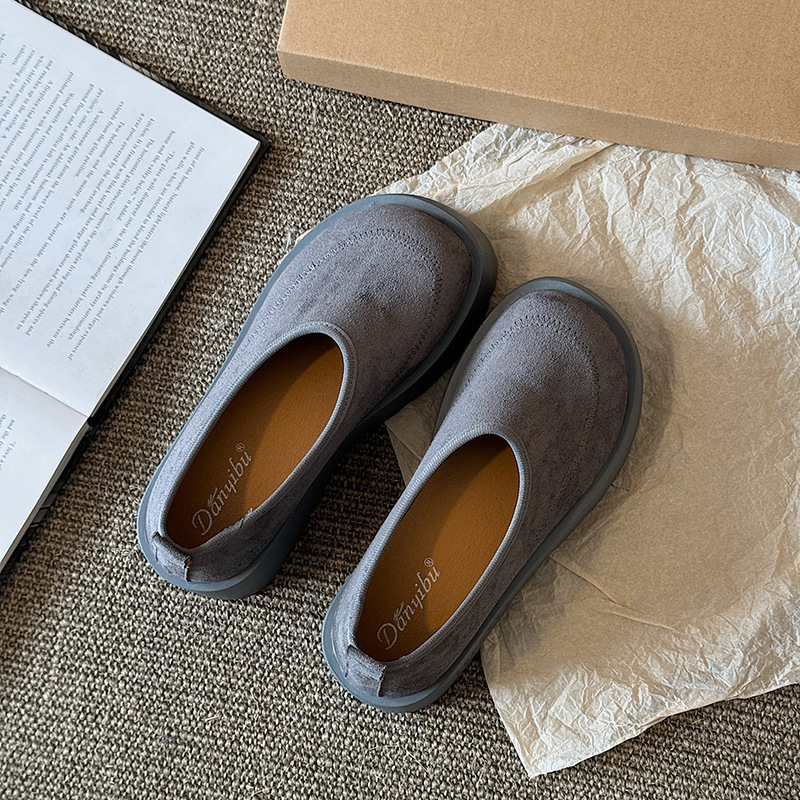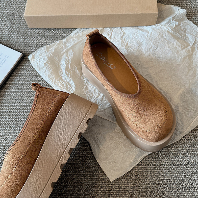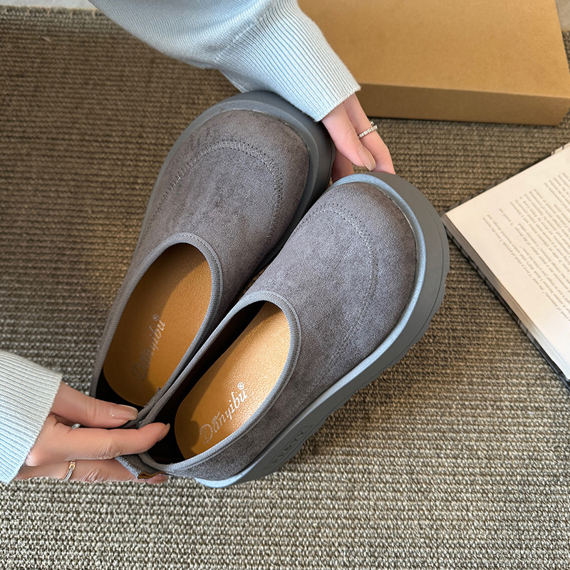 여성을위한 레트로 스웨이드 두꺼운 밑창 플랫폼 신발 2025 새로운 인형 머리 슬립 온 신발 다목적 캐주얼 신발스토어 가기